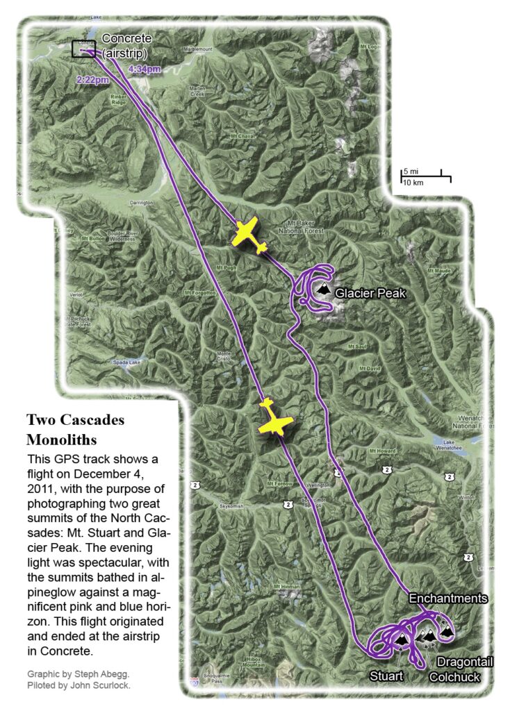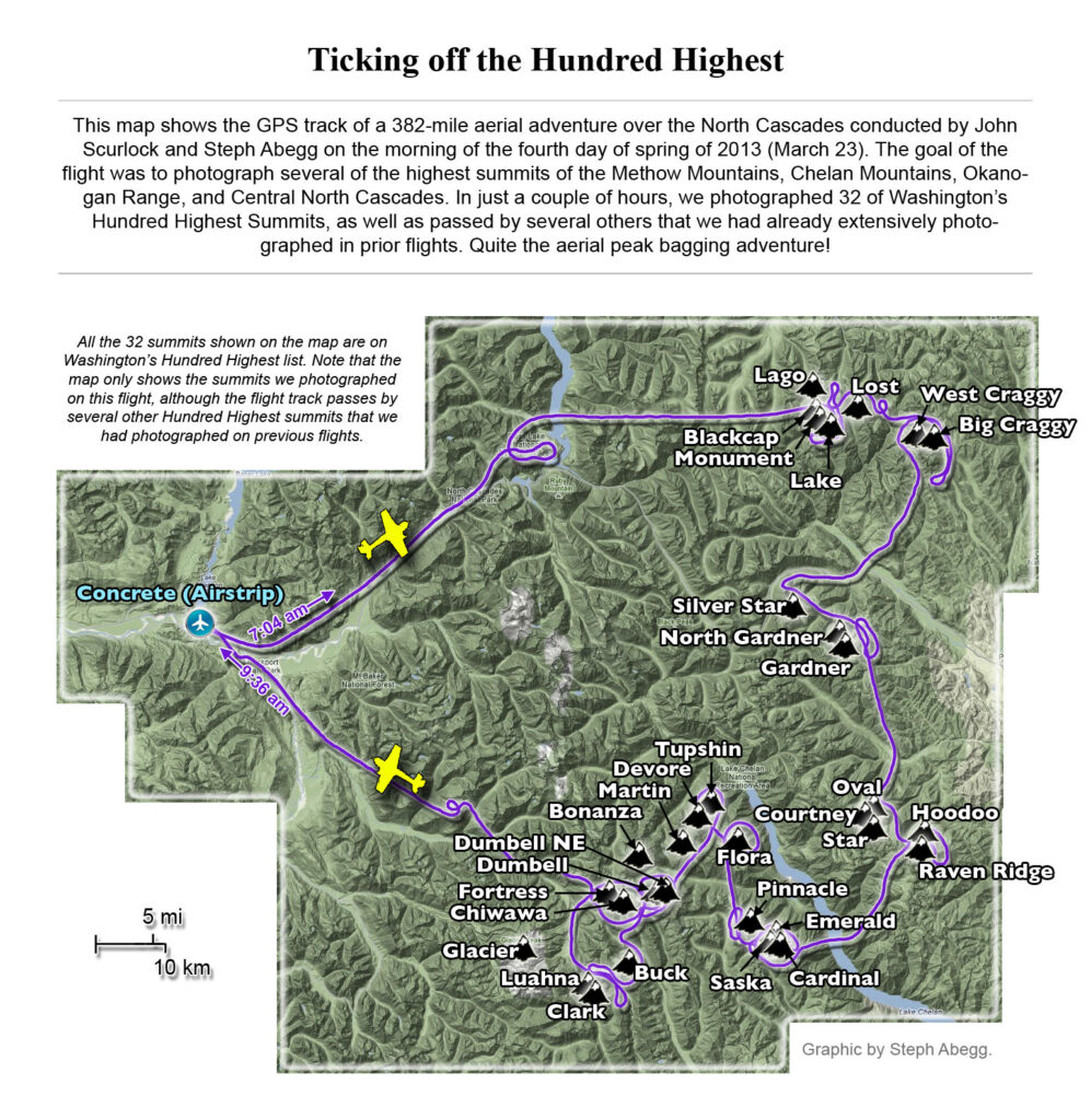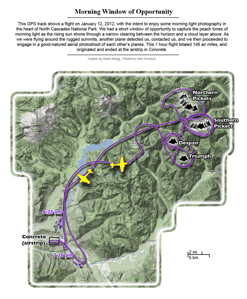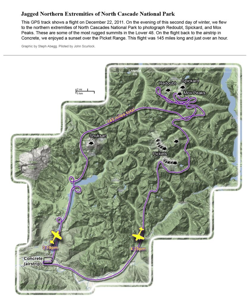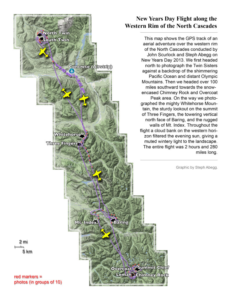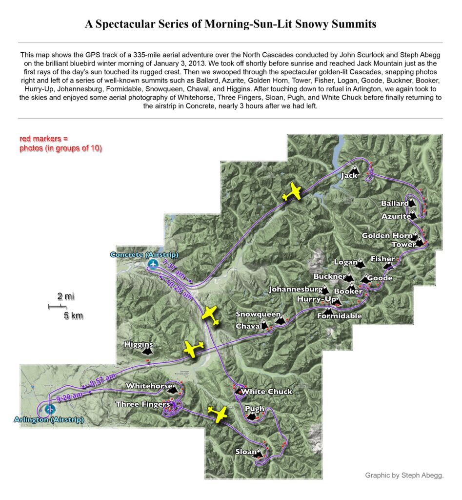 This photoset is from a 335-mile aerial adventure with John Scurlock over the North Cascades on the brilliant bluebird winter morning of January 3, 2013. We took off shortly before sunrise and reached Jack Mountain just as the first rays of the day’s sun touched its rugged crest. Then we swooped through the spectacular golden-lit Cascades, snapping photos right and left of a series of well-known summits such as Ballard, Azurite, Golden Horn, Tower, Fisher, Logan, Goode, Buckner, Booker, Hurry-up, Johannesburg, Formidable, Snowqueen, Chaval, and Higgins. After touching down to refuel in Arlington, we again took to the skies and enjoyed some aerial photography of Whitehorse, Three Fingers, Sloan, Pugh, and White Chuck before finally returning to the airstrip in Concrete, nearly 3 hours after we had left.