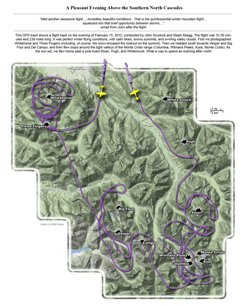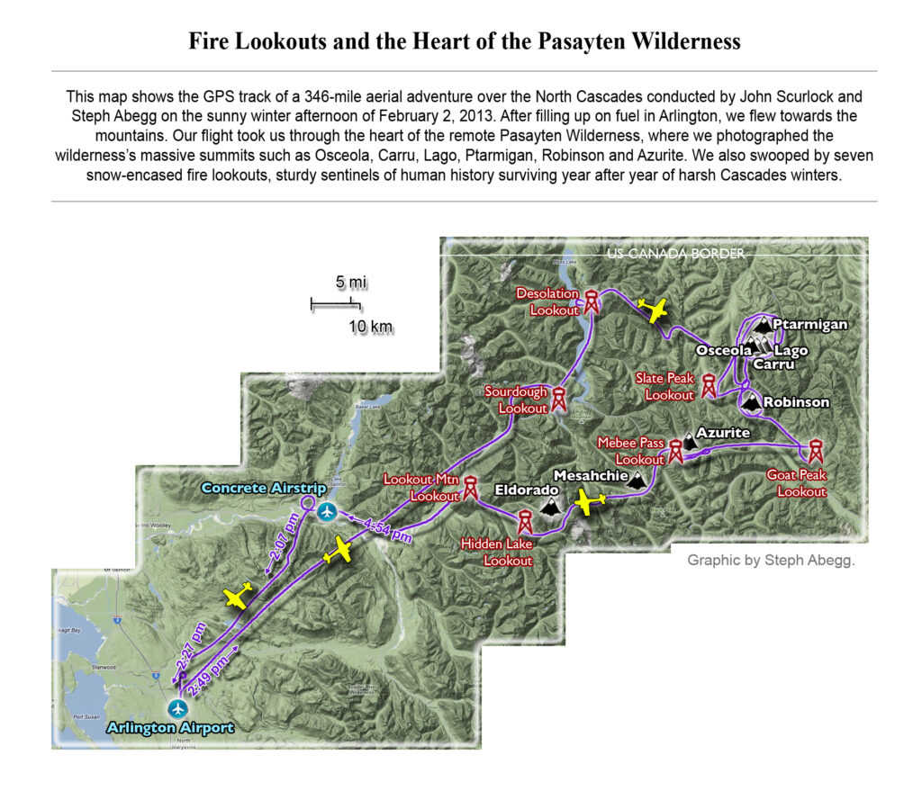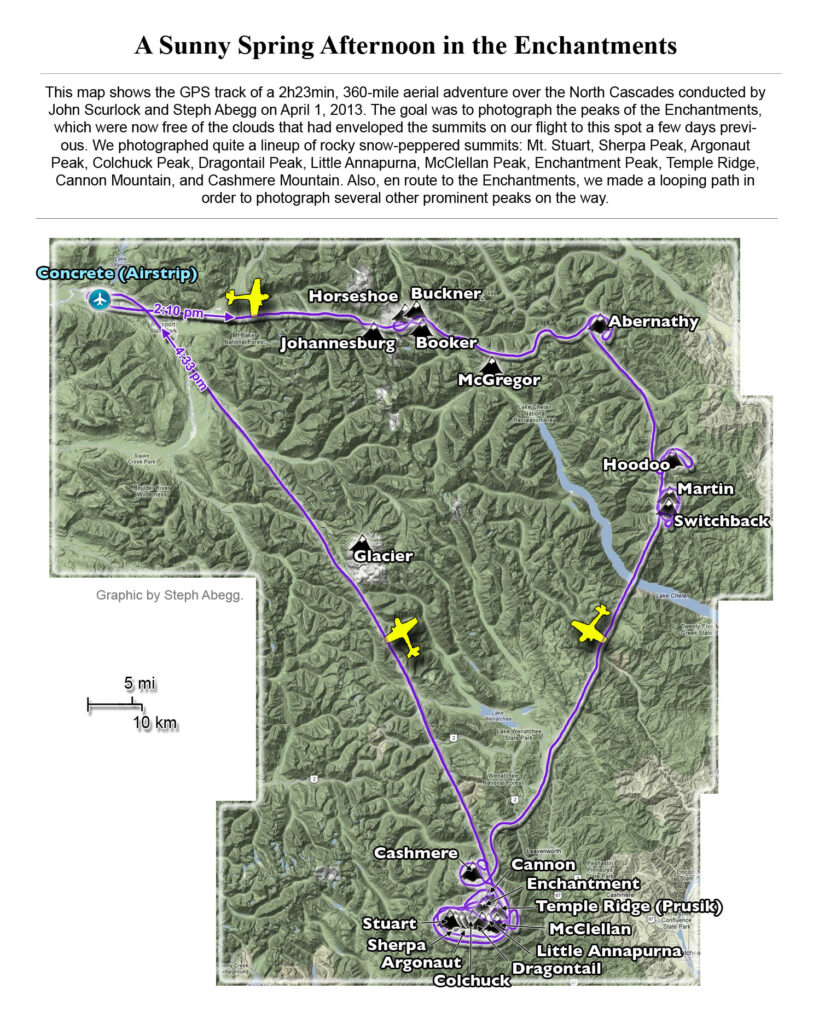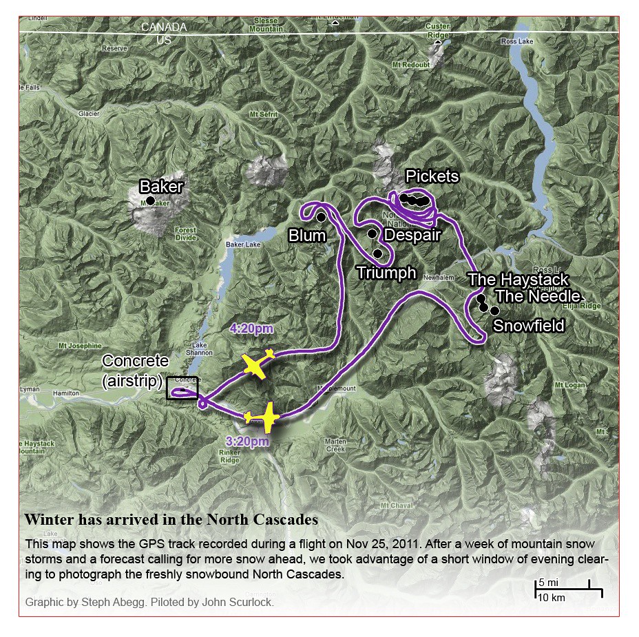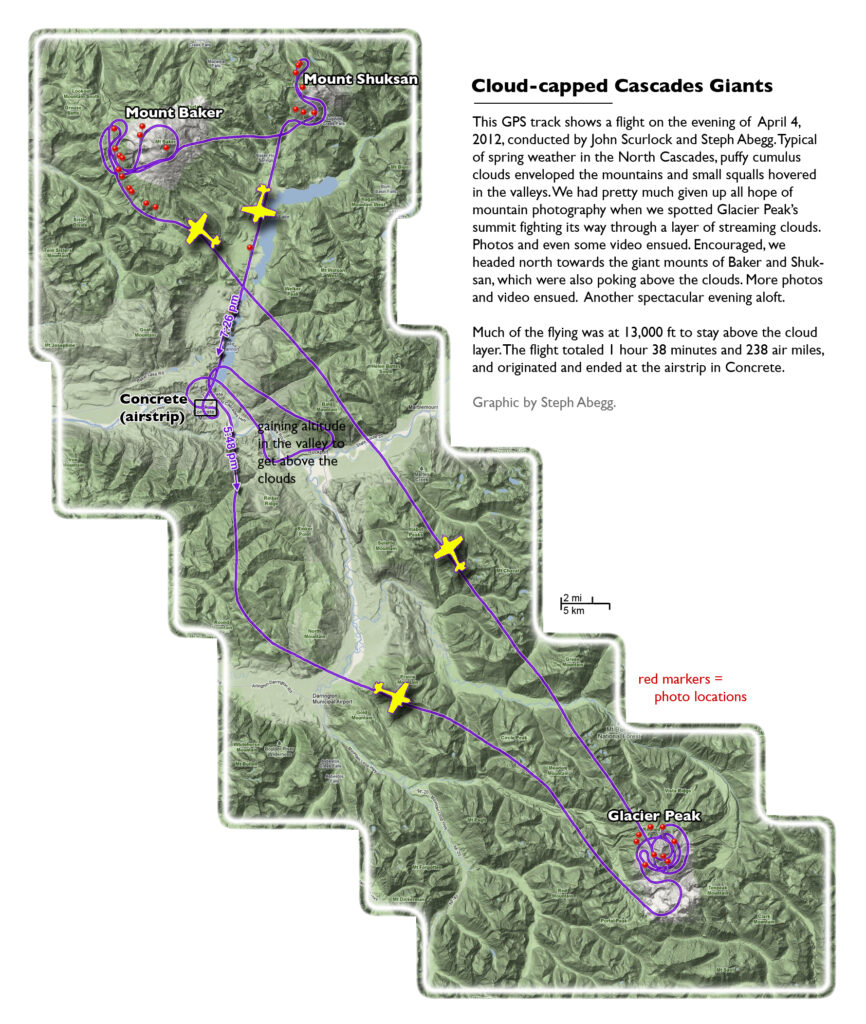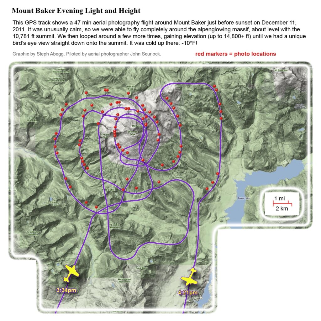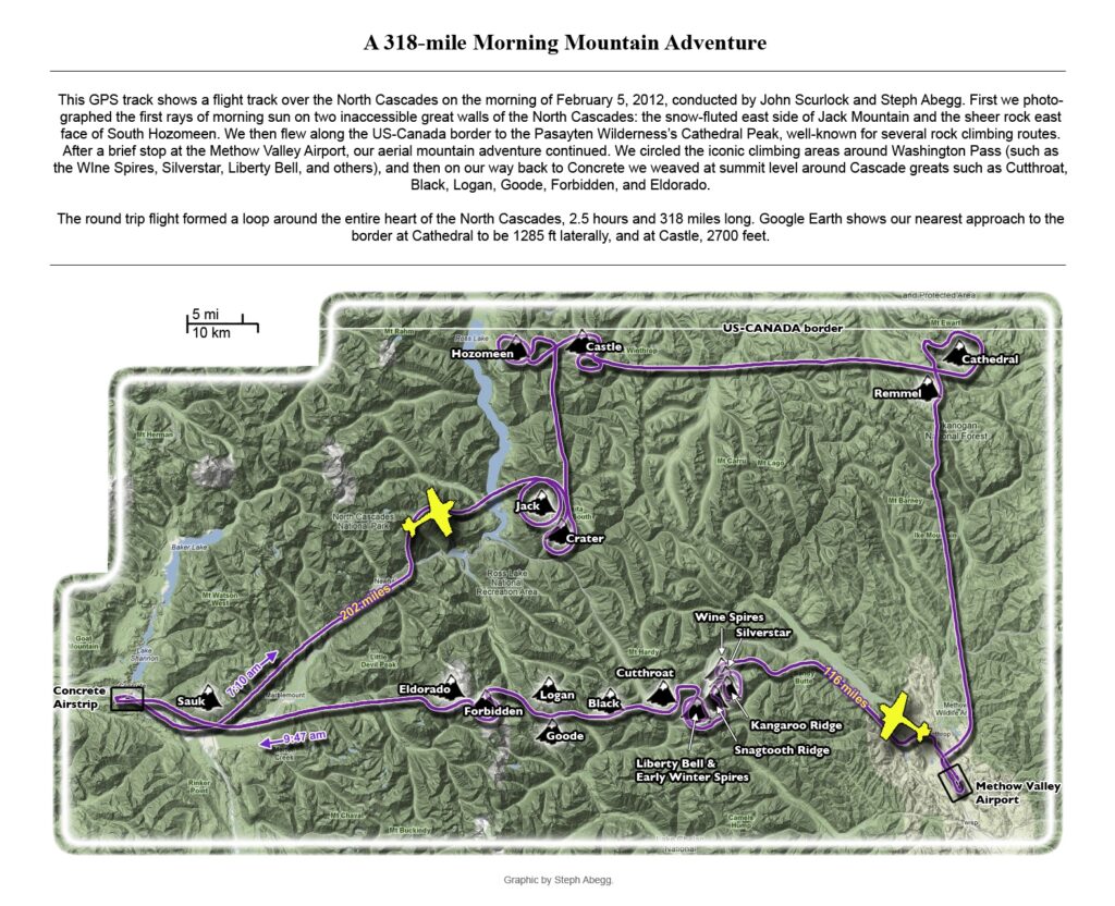 This photoset is from a 335-mile aerial adventure with John Scurlock over the North Cascades on the brilliant bluebird winter morning of January 3, 2013. We took off shortly before sunrise and reached Jack Mountain just as the first rays of the day’s sun touched its rugged crest. Then we swooped through the spectacular golden-lit Cascades, snapping photos right and left of a series of well-known summits such as Ballard, Azurite, Golden Horn, Tower, Fisher, Logan, Goode, Buckner, Booker, Hurry-up, Johannesburg, Formidable, Snowqueen, Chaval, and Higgins. After touching down to refuel in Arlington, we again took to the skies and enjoyed some aerial photography of Whitehorse, Three Fingers, Sloan, Pugh, and White Chuck before finally returning to the airstrip in Concrete, nearly 3 hours after we had left.