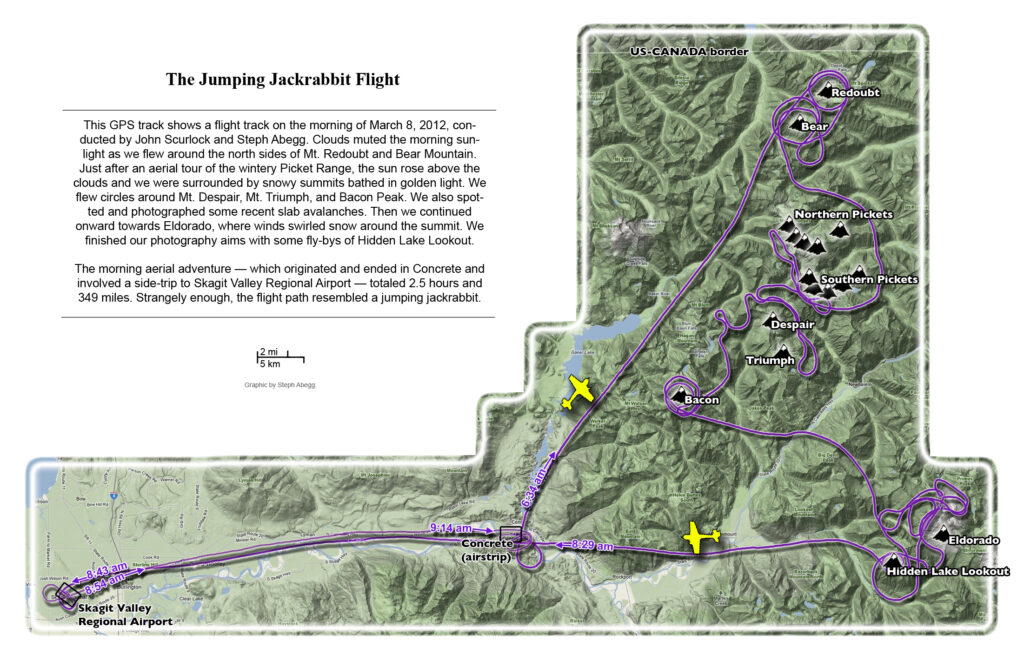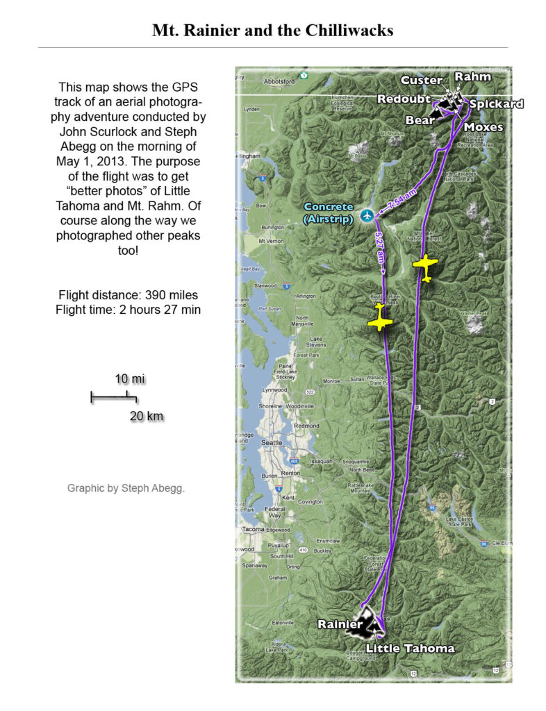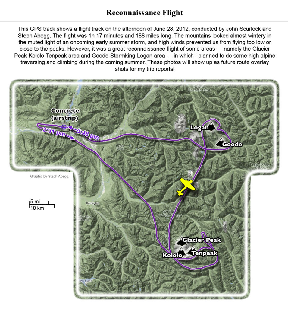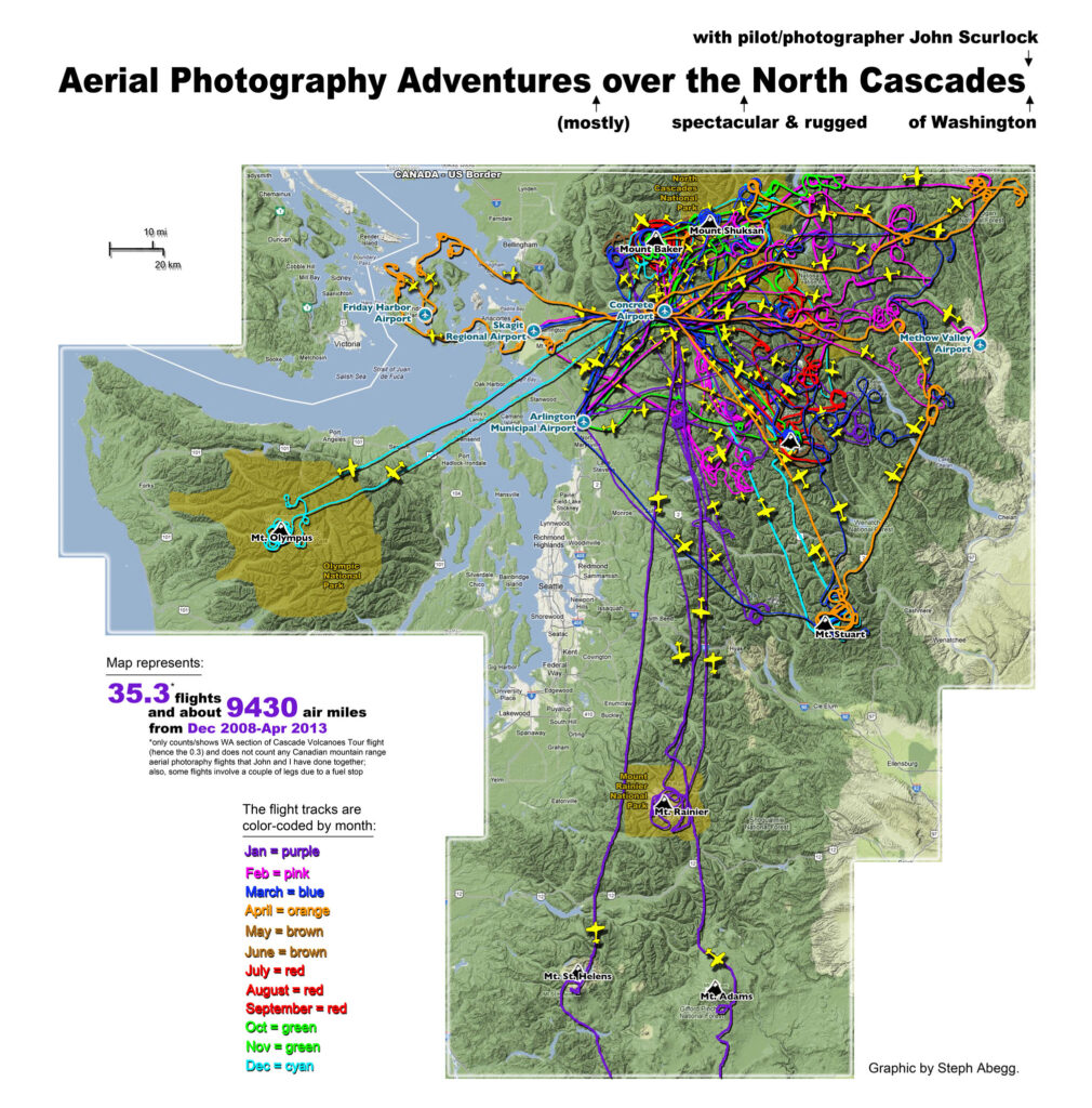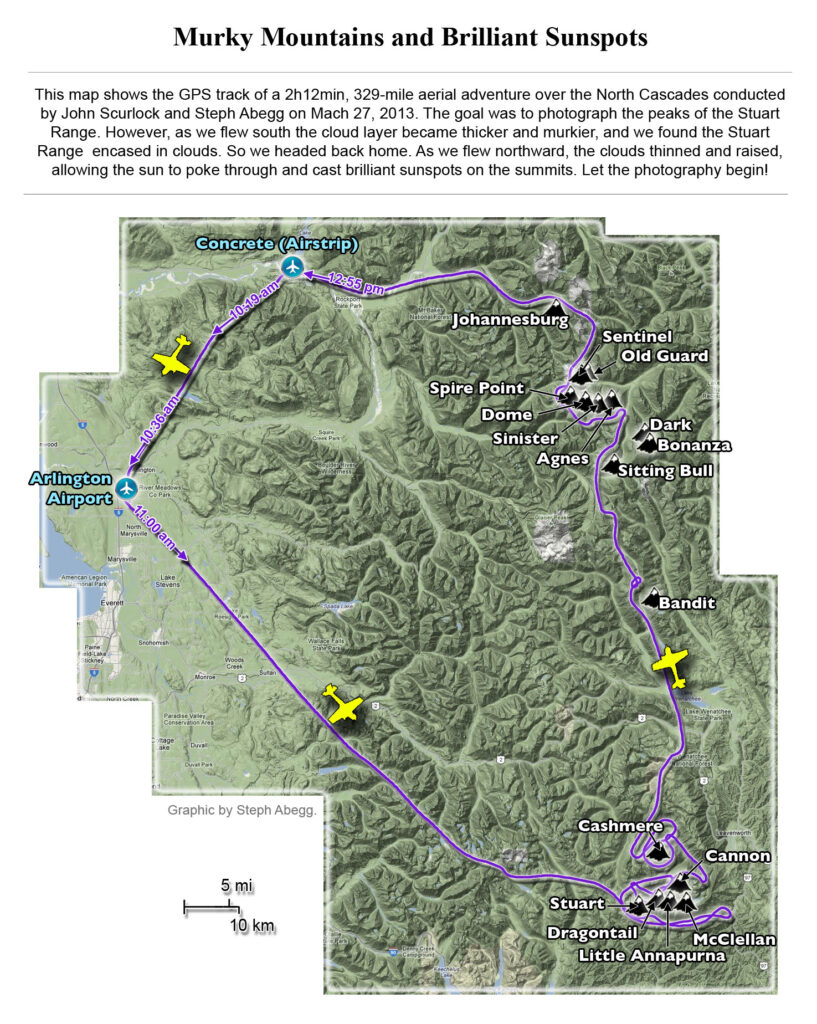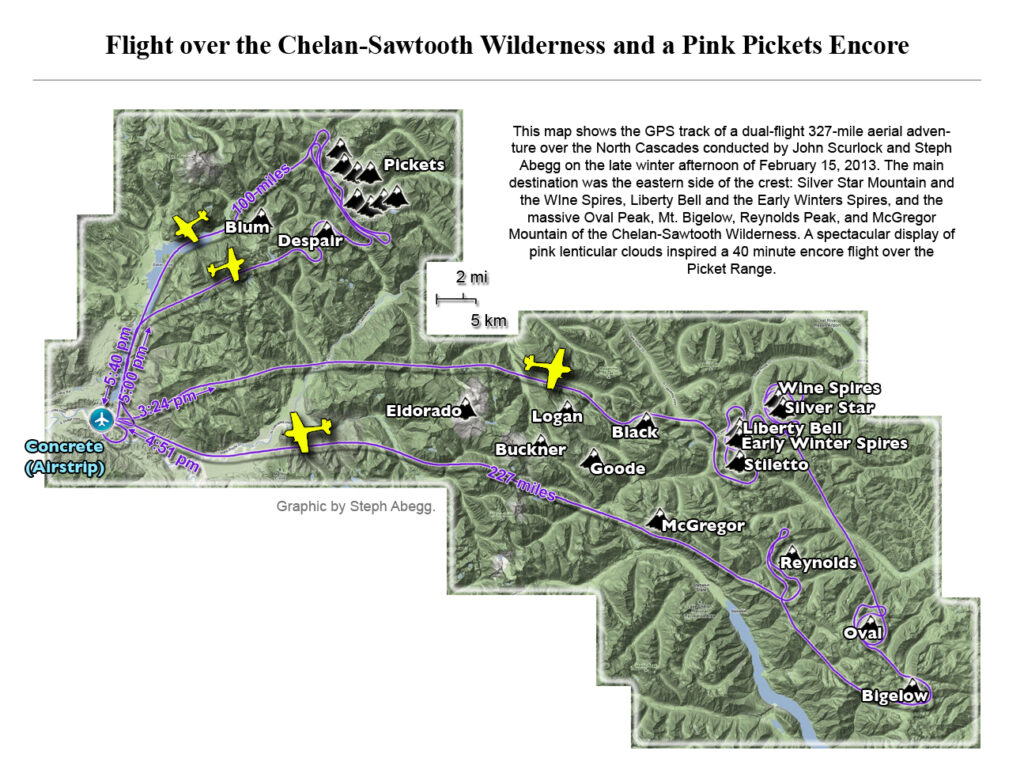 This photoset is from a 335-mile aerial adventure with John Scurlock over the North Cascades on the brilliant bluebird winter morning of January 3, 2013. We took off shortly before sunrise and reached Jack Mountain just as the first rays of the day’s sun touched its rugged crest. Then we swooped through the spectacular golden-lit Cascades, snapping photos right and left of a series of well-known summits such as Ballard, Azurite, Golden Horn, Tower, Fisher, Logan, Goode, Buckner, Booker, Hurry-up, Johannesburg, Formidable, Snowqueen, Chaval, and Higgins. After touching down to refuel in Arlington, we again took to the skies and enjoyed some aerial photography of Whitehorse, Three Fingers, Sloan, Pugh, and White Chuck before finally returning to the airstrip in Concrete, nearly 3 hours after we had left.