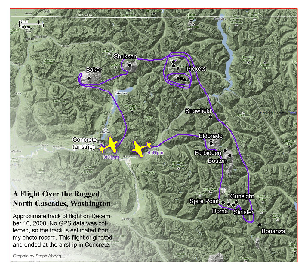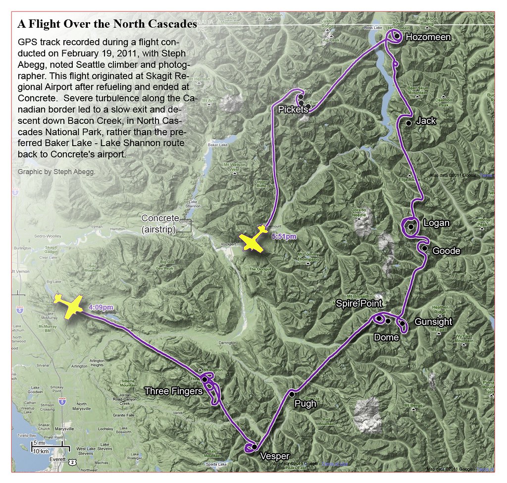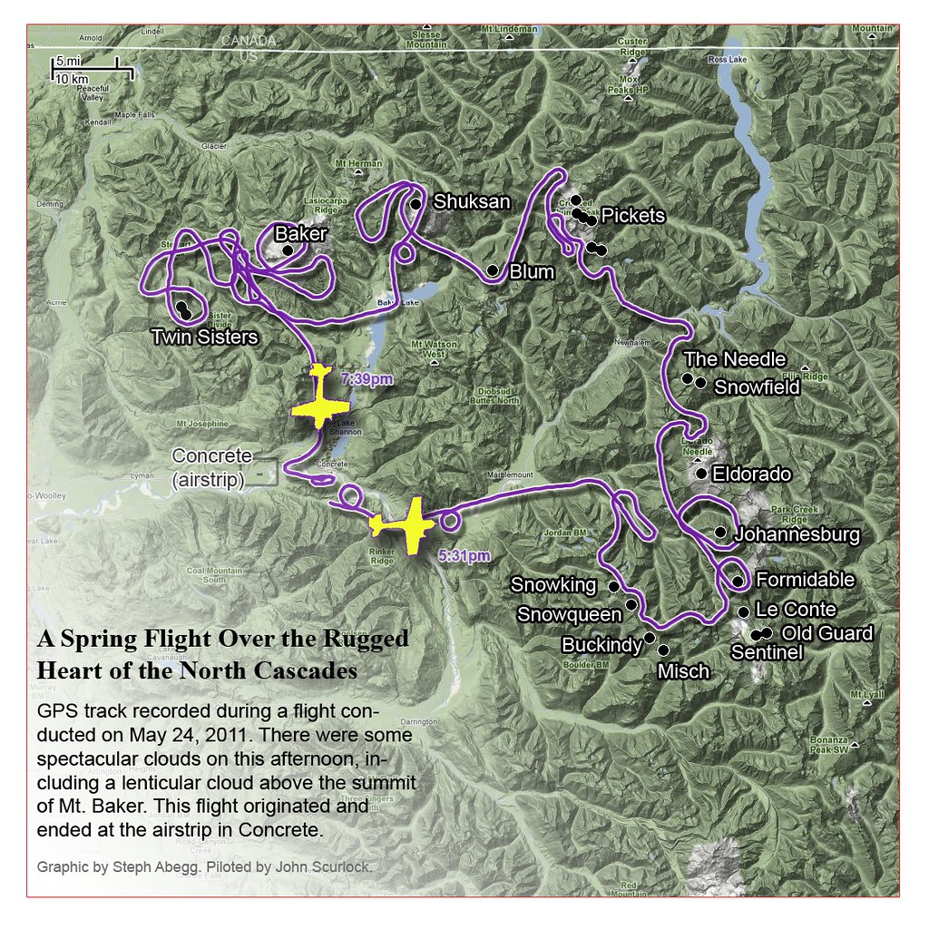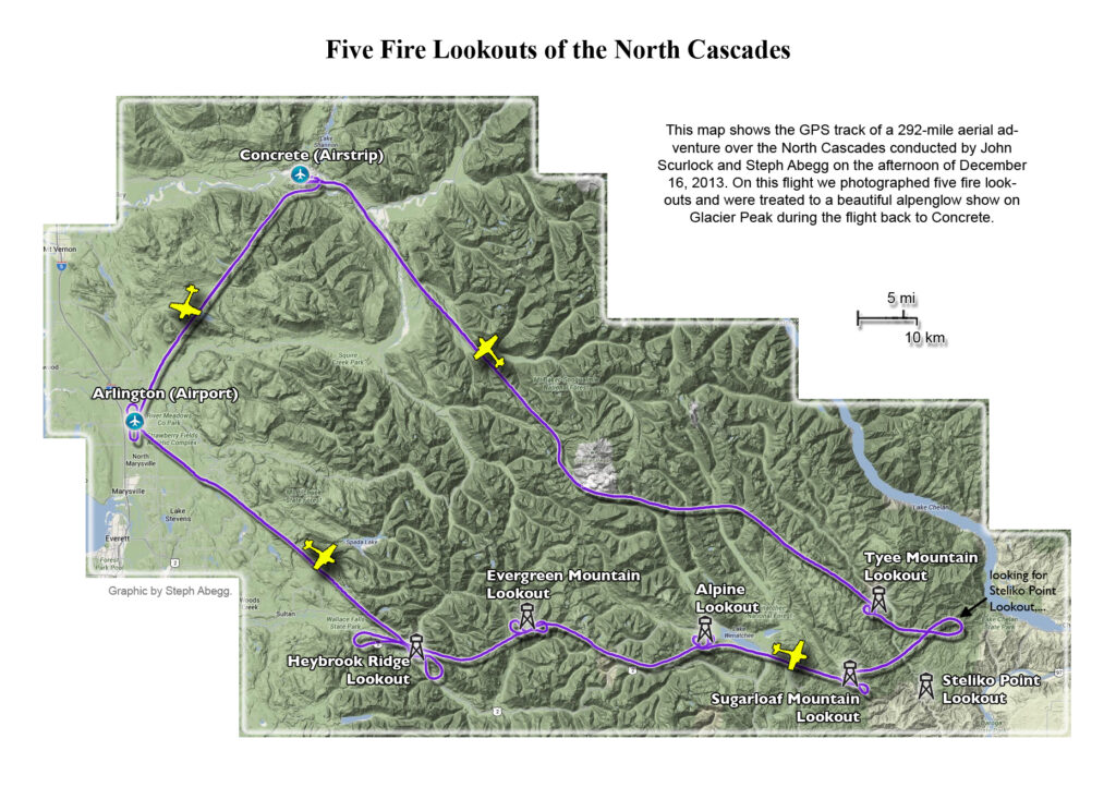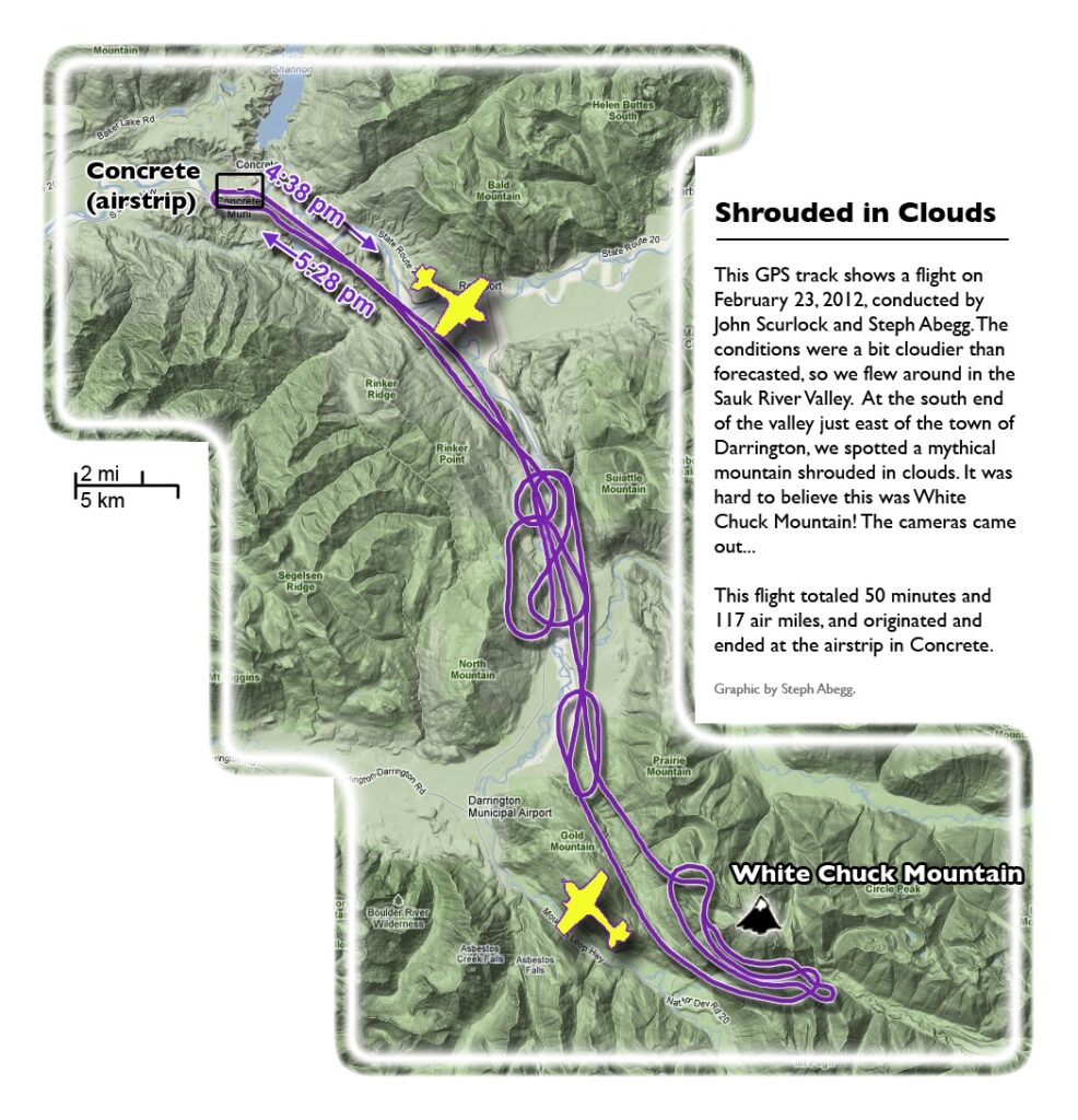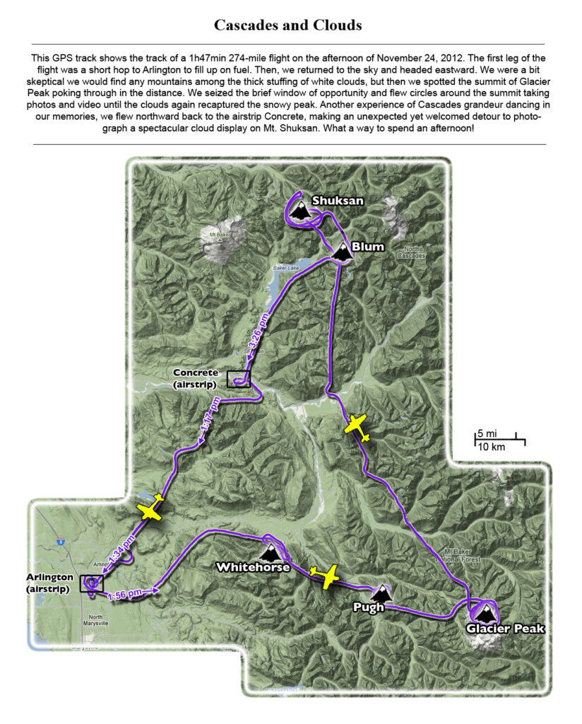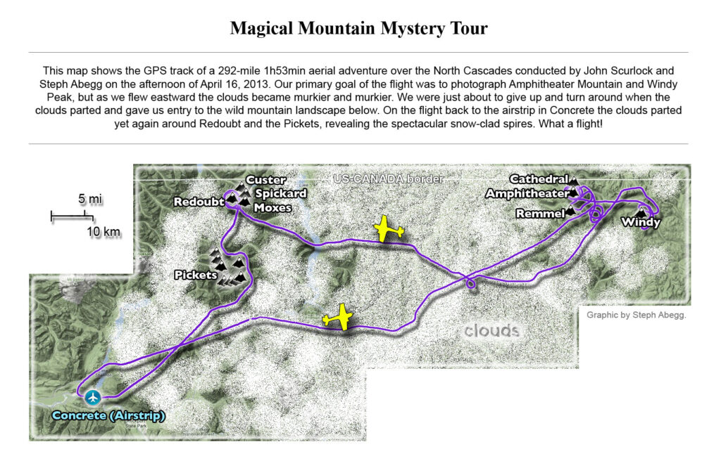 This photoset is from a 335-mile aerial adventure with John Scurlock over the North Cascades on the brilliant bluebird winter morning of January 3, 2013. We took off shortly before sunrise and reached Jack Mountain just as the first rays of the day’s sun touched its rugged crest. Then we swooped through the spectacular golden-lit Cascades, snapping photos right and left of a series of well-known summits such as Ballard, Azurite, Golden Horn, Tower, Fisher, Logan, Goode, Buckner, Booker, Hurry-up, Johannesburg, Formidable, Snowqueen, Chaval, and Higgins. After touching down to refuel in Arlington, we again took to the skies and enjoyed some aerial photography of Whitehorse, Three Fingers, Sloan, Pugh, and White Chuck before finally returning to the airstrip in Concrete, nearly 3 hours after we had left.