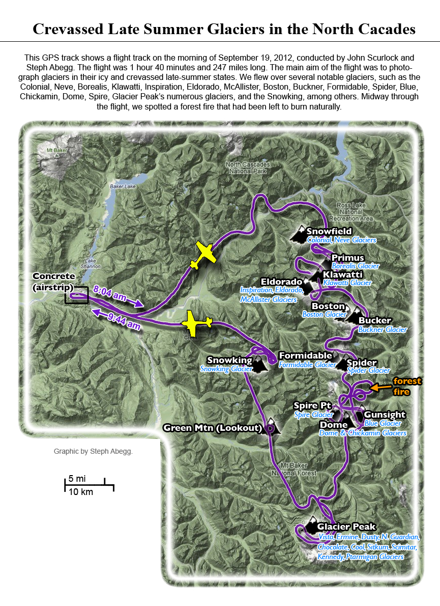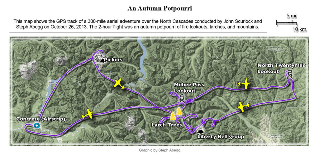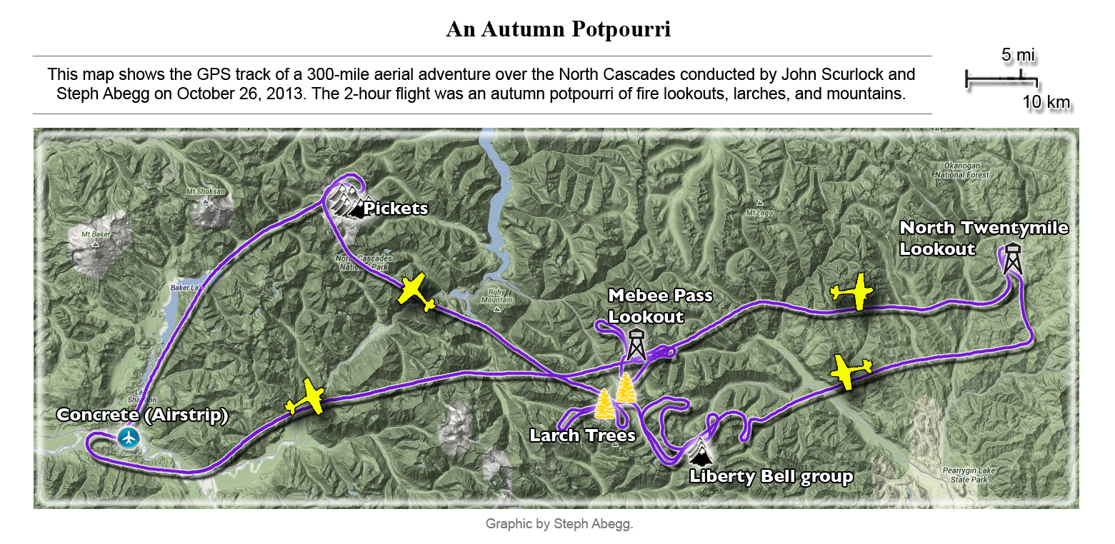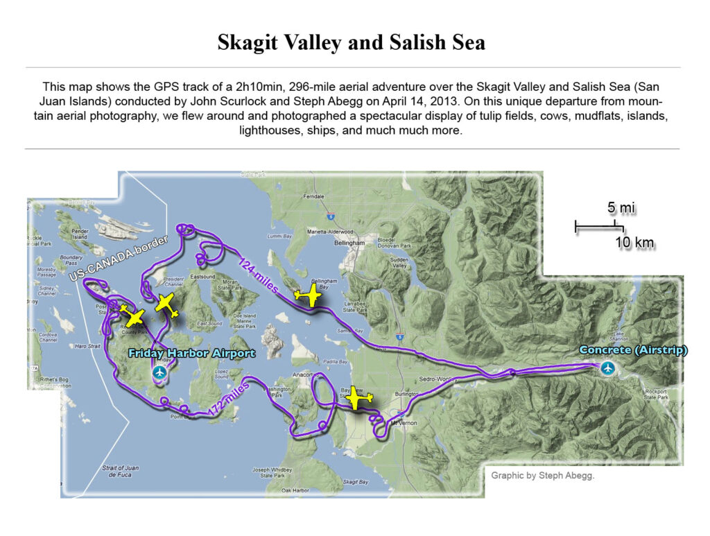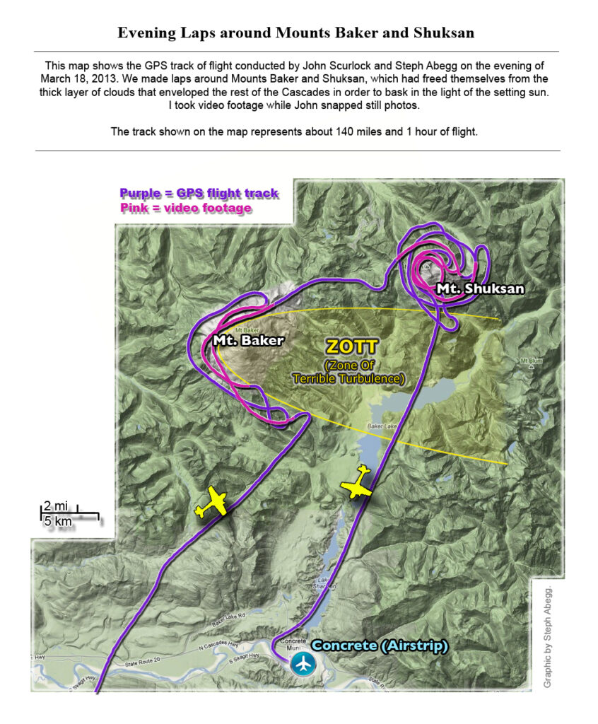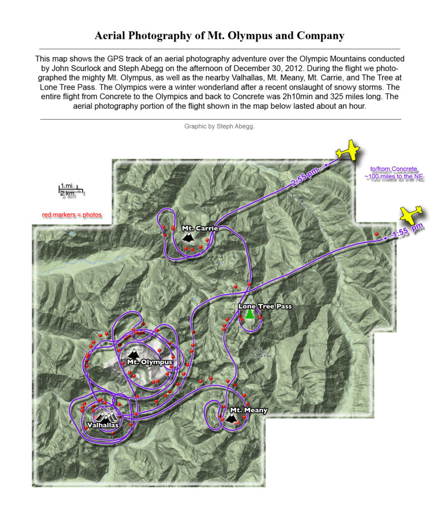 This photoset is from a 335-mile aerial adventure with John Scurlock over the North Cascades on the brilliant bluebird winter morning of January 3, 2013. We took off shortly before sunrise and reached Jack Mountain just as the first rays of the day’s sun touched its rugged crest. Then we swooped through the spectacular golden-lit Cascades, snapping photos right and left of a series of well-known summits such as Ballard, Azurite, Golden Horn, Tower, Fisher, Logan, Goode, Buckner, Booker, Hurry-up, Johannesburg, Formidable, Snowqueen, Chaval, and Higgins. After touching down to refuel in Arlington, we again took to the skies and enjoyed some aerial photography of Whitehorse, Three Fingers, Sloan, Pugh, and White Chuck before finally returning to the airstrip in Concrete, nearly 3 hours after we had left.