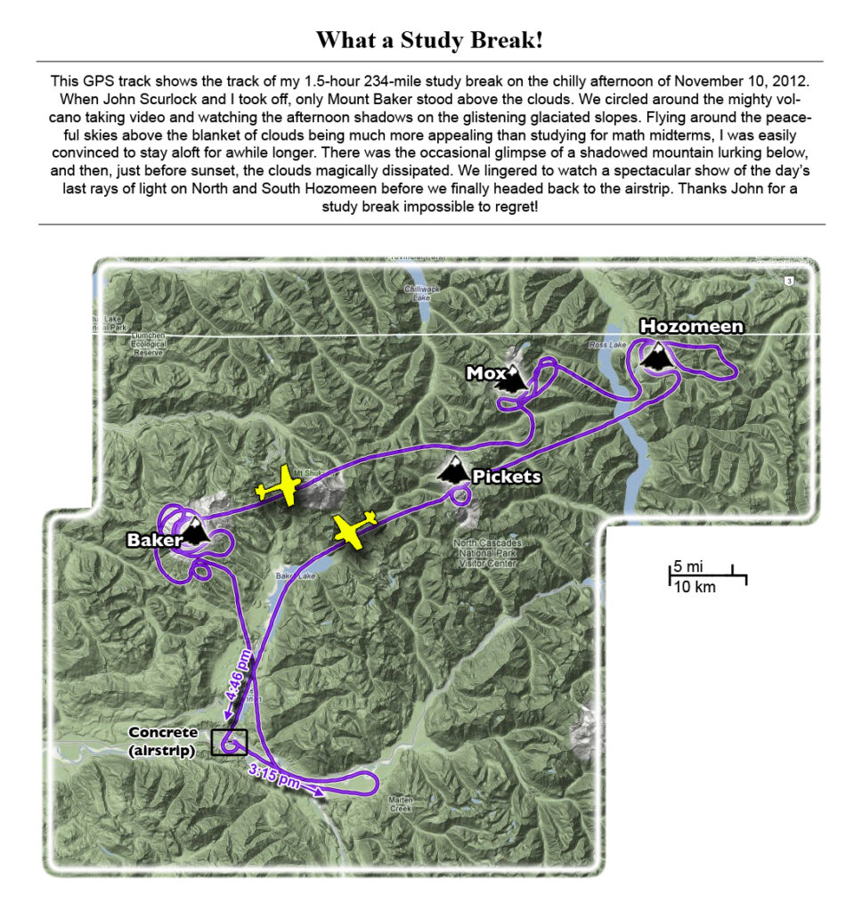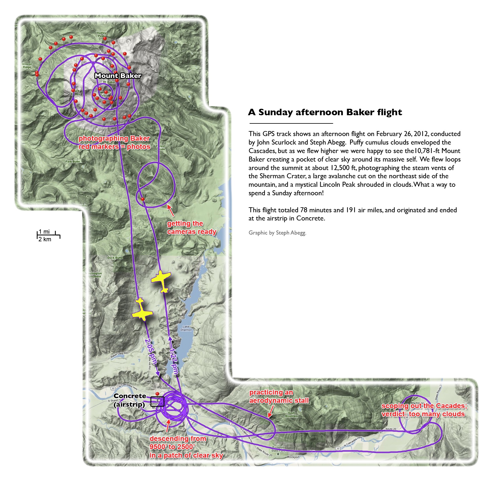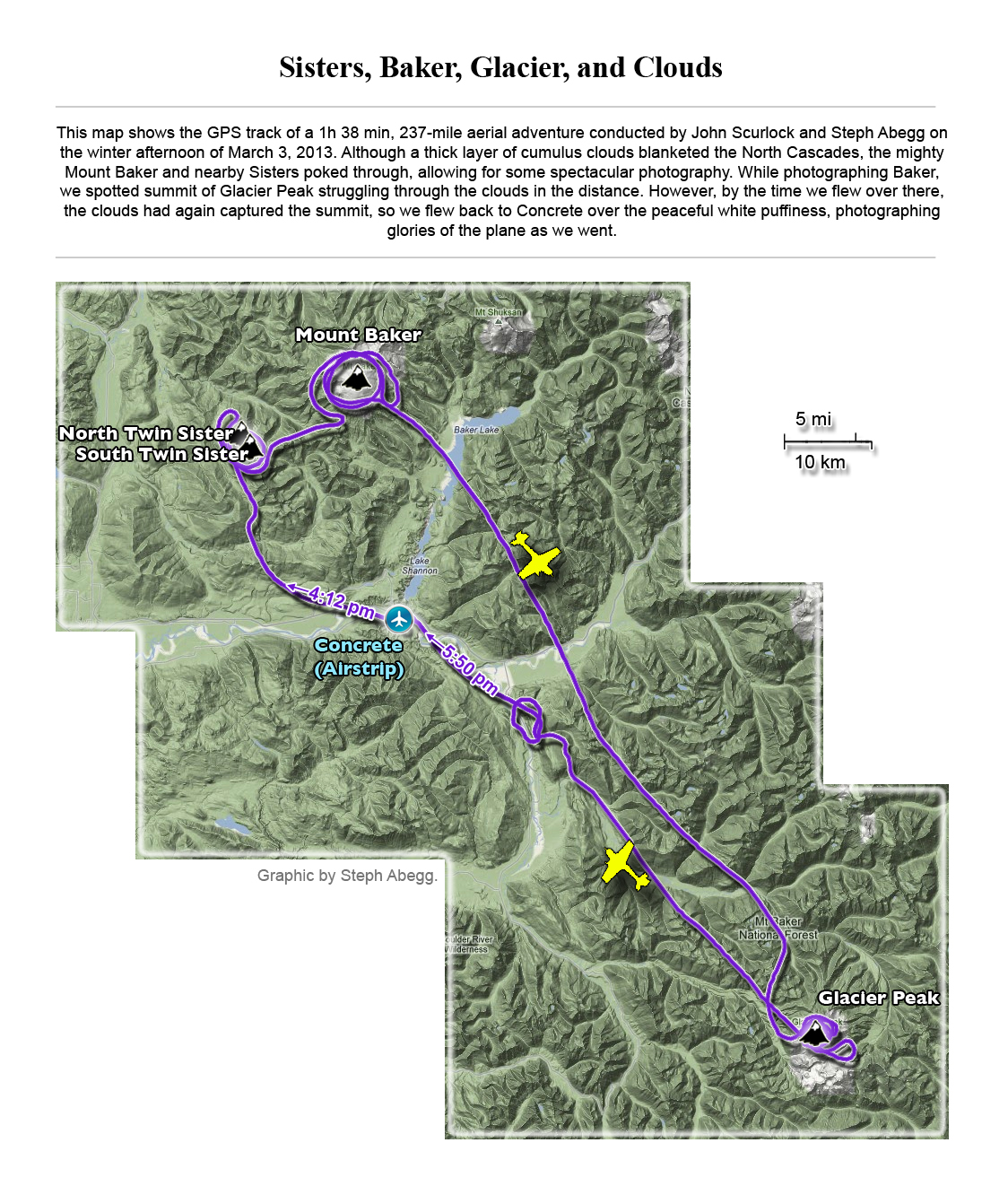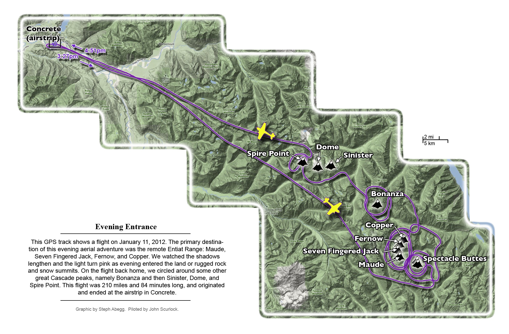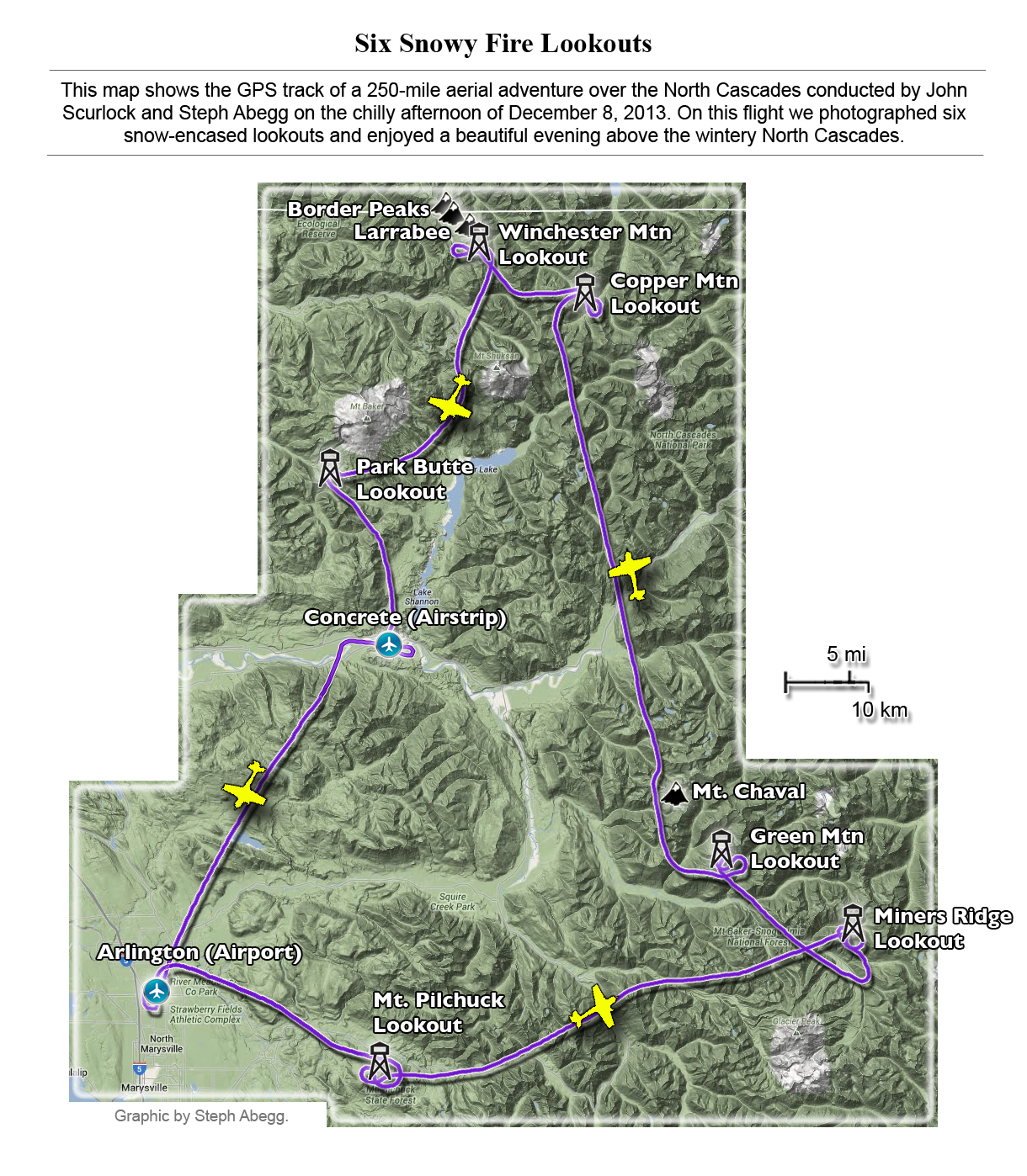 This photoset is from a 335-mile aerial adventure with John Scurlock over the North Cascades on the brilliant bluebird winter morning of January 3, 2013. We took off shortly before sunrise and reached Jack Mountain just as the first rays of the day’s sun touched its rugged crest. Then we swooped through the spectacular golden-lit Cascades, snapping photos right and left of a series of well-known summits such as Ballard, Azurite, Golden Horn, Tower, Fisher, Logan, Goode, Buckner, Booker, Hurry-up, Johannesburg, Formidable, Snowqueen, Chaval, and Higgins. After touching down to refuel in Arlington, we again took to the skies and enjoyed some aerial photography of Whitehorse, Three Fingers, Sloan, Pugh, and White Chuck before finally returning to the airstrip in Concrete, nearly 3 hours after we had left.