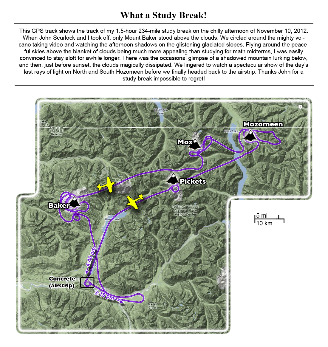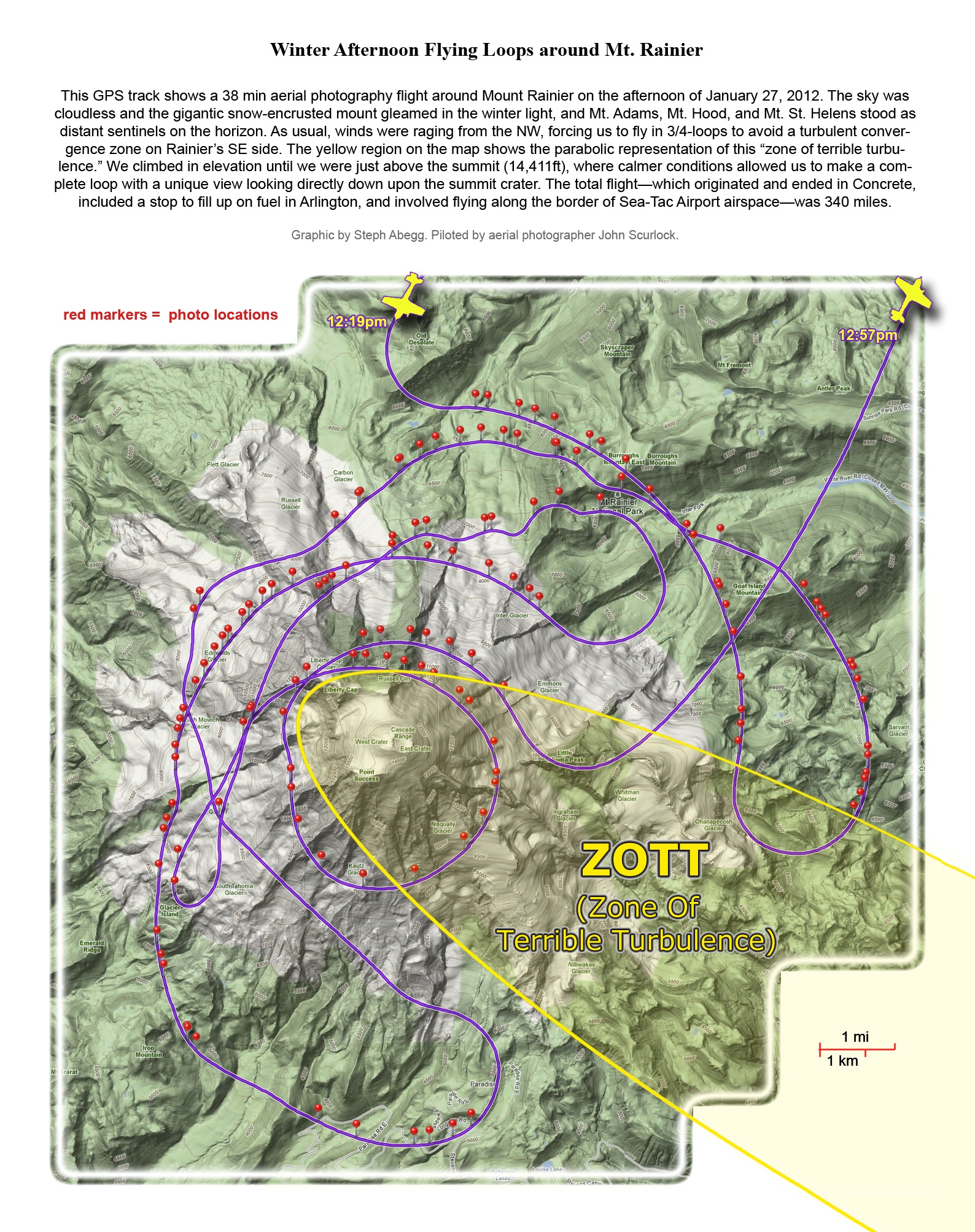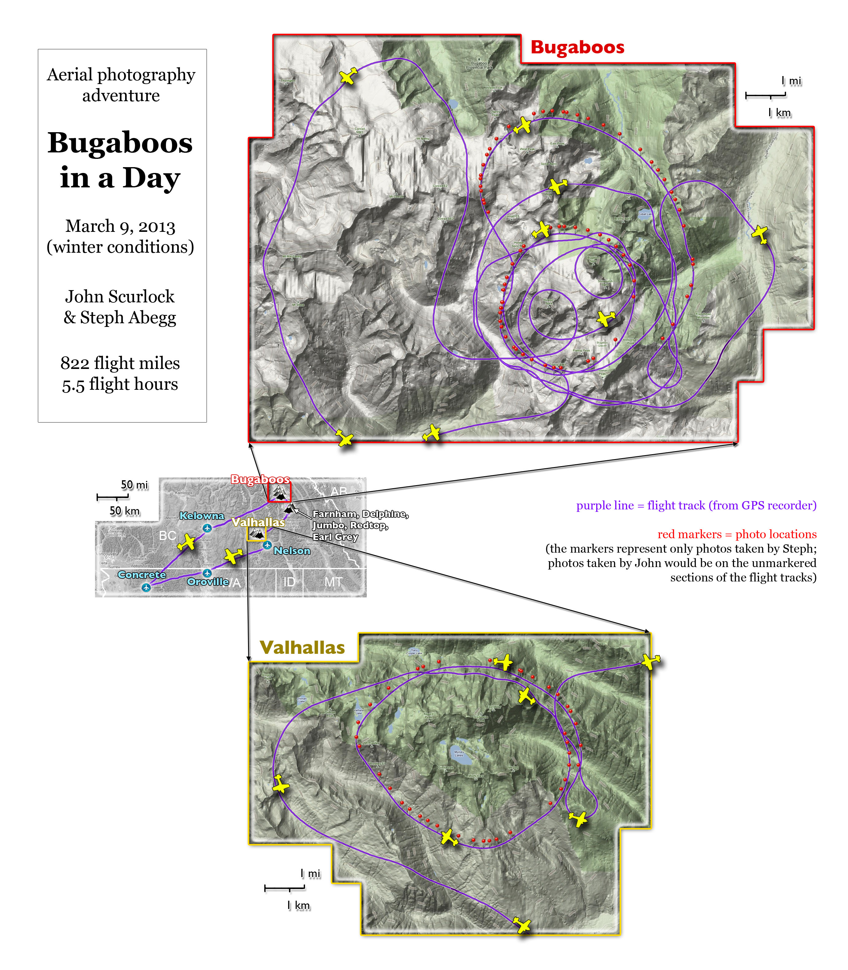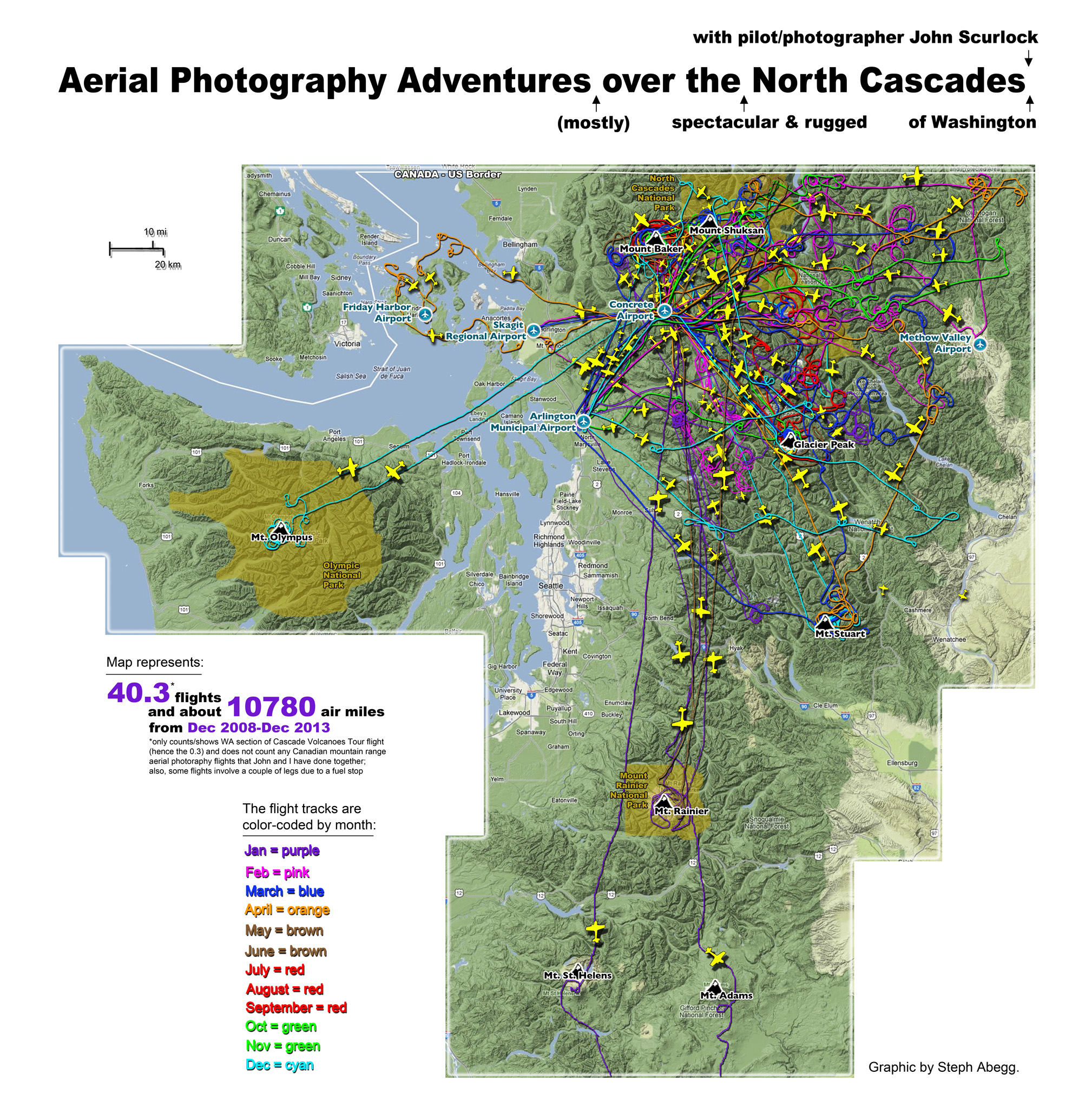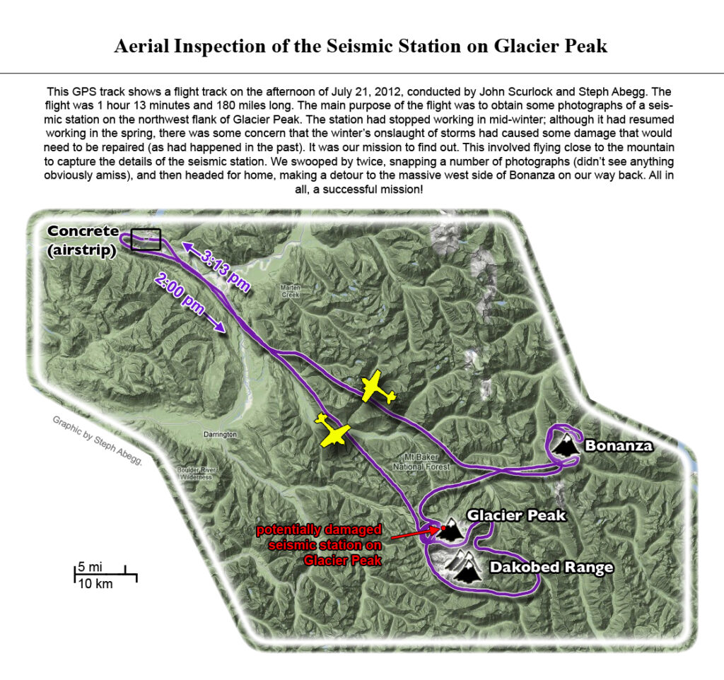 This photoset is from a 335-mile aerial adventure with John Scurlock over the North Cascades on the brilliant bluebird winter morning of January 3, 2013. We took off shortly before sunrise and reached Jack Mountain just as the first rays of the day’s sun touched its rugged crest. Then we swooped through the spectacular golden-lit Cascades, snapping photos right and left of a series of well-known summits such as Ballard, Azurite, Golden Horn, Tower, Fisher, Logan, Goode, Buckner, Booker, Hurry-up, Johannesburg, Formidable, Snowqueen, Chaval, and Higgins. After touching down to refuel in Arlington, we again took to the skies and enjoyed some aerial photography of Whitehorse, Three Fingers, Sloan, Pugh, and White Chuck before finally returning to the airstrip in Concrete, nearly 3 hours after we had left.