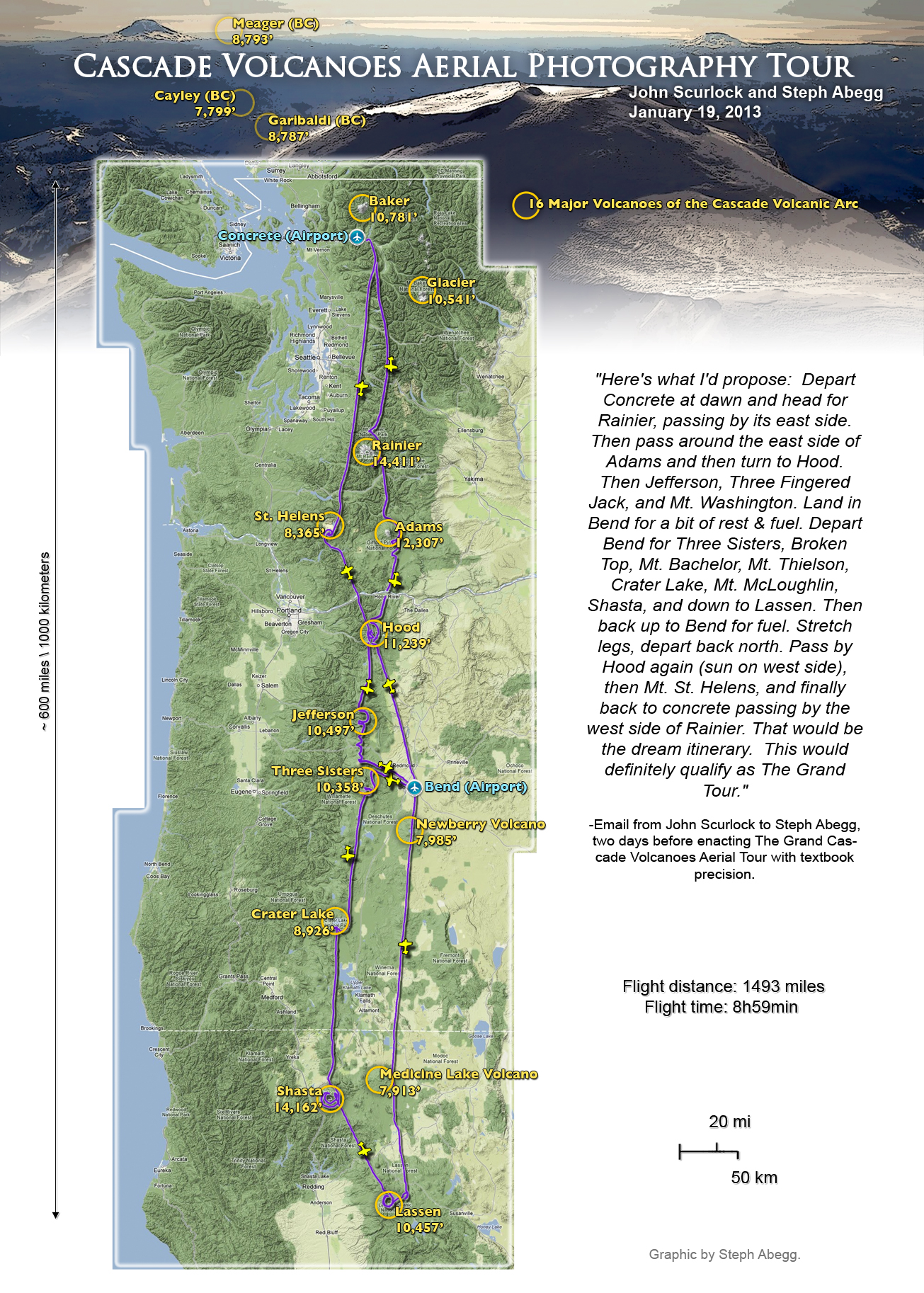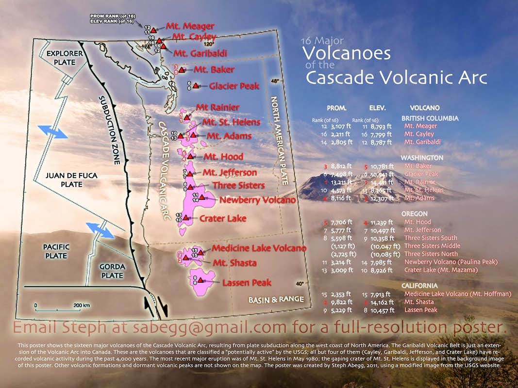 This poster shows the sixteen major volcanoes of the Cascade Volcanic Arc, resulting from plate subduction along the west coast. The Garibaldi Volcanic Belt is just an extension of the Volcanic Arc into Canada. These are the volcanoes that are classified a “potentially active” by the USGS; all but four of them (Cayley, Garibaldi, Jefferson, and Crater Lake) have recorded volcanic activity during the past 4,000 years. The most recent major eruption was of Mt. St. Helens in May 1980; the gaping crater of Mt. St. Helens is displayed in the background image of this poster. Other volcanic formations and dormant volcanic peaks are not shown on the map. I created this 18x24" poster in 2011, using a modified image from the USGS website. See my