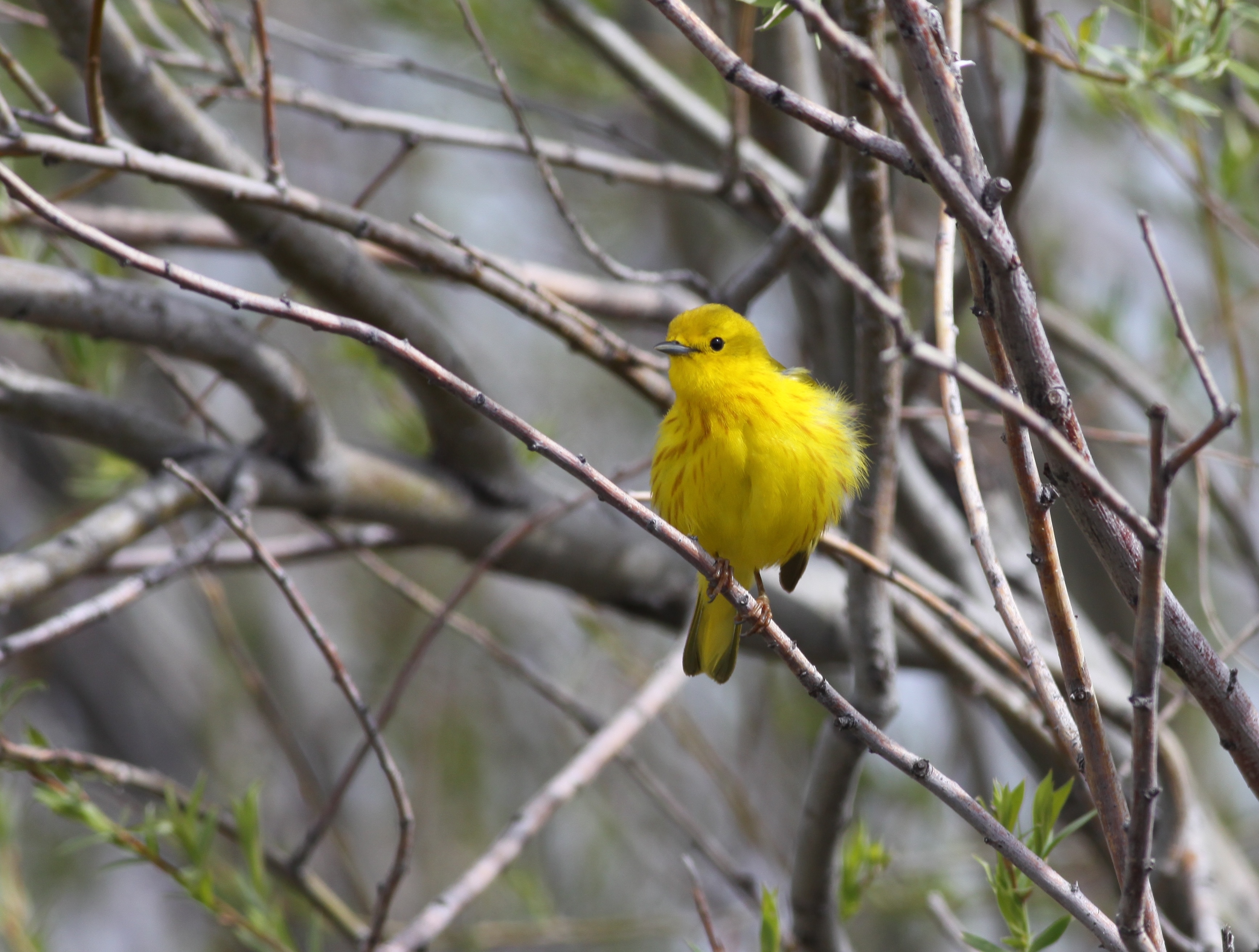 A flash of color in winter branches.