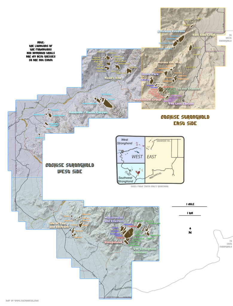 Sometimes I put together a map of an area to wrap my head around the climbing (or adventuring) objectives. I made this map after I had made a few trips to the East side of Cochise and was planning a trip for the West side.