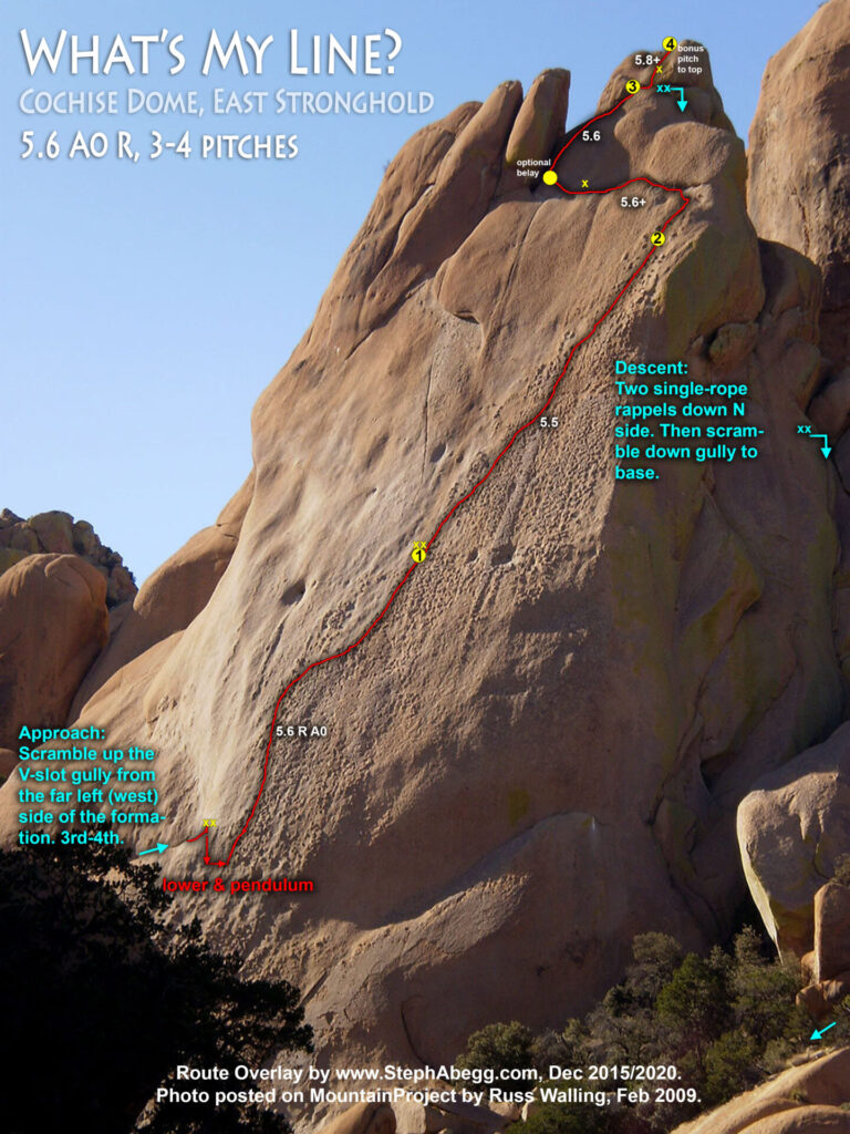 Climb What's My Line? on Cochise Dome, East Stronghold (5.6 A0 R, 3 pitches) with Julie. This appropriately-named route weaves its way through the huge sea of chickenheads that pepper the south face of Cochise Dome. While the climbing itself is easy, the combination of exposure, runout, involved approach, pendulum to access the sea of chickenheads, and the serpentine nature of the route line make What's My Line? a great adventure. This is one of the most unique routes I've climbed. Highly recommended.