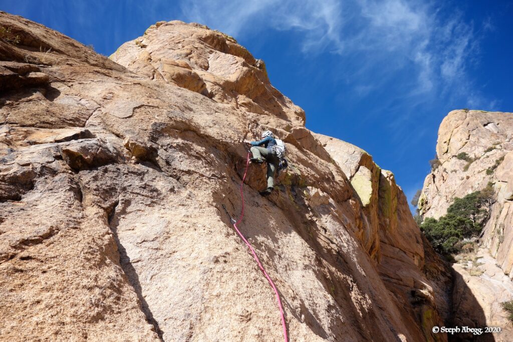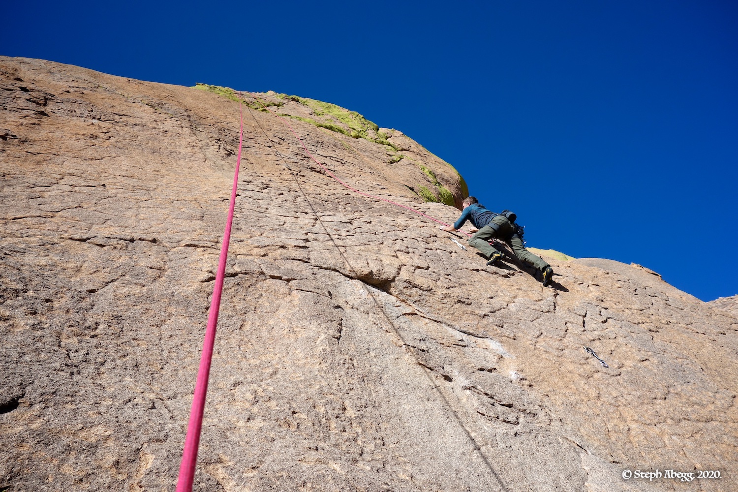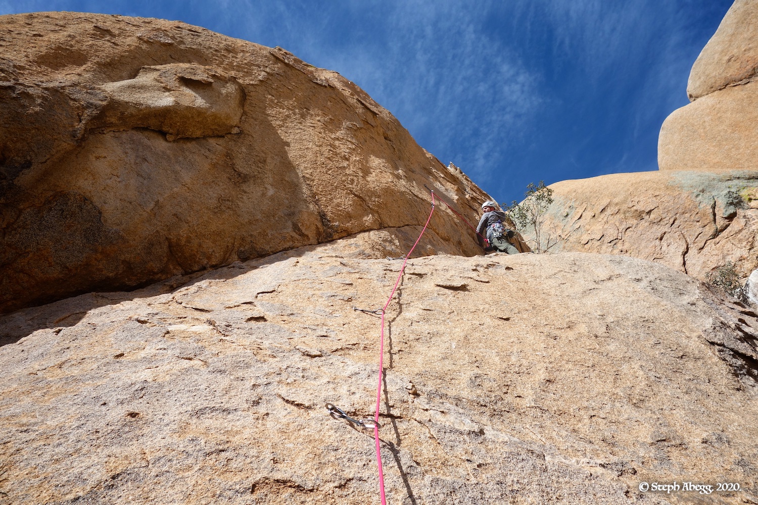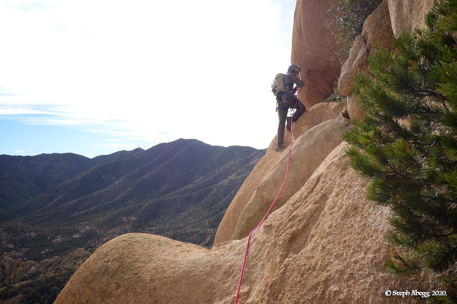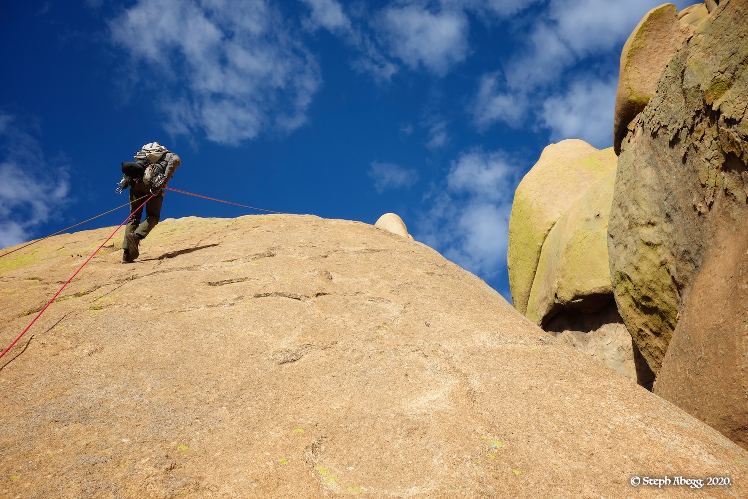 9 of the formations: Waste Land Dome (three times), Stronghold Dome, Cochise Dome, End Pinnacle (twice), Rockfellow Dome, Owl Rock, Out of Towners' Dome (twice), Maybe Pinnacle, and Entrance Dome. We had decided that on this trip we would climb only sunny routes given the maximum number of stars in the guidebook (three stars), so all of the routes we did were warm and spectacular. And despite the quality of the climbing, we never encountered another party on any of the routes we did. Nate did all of the leading on this trip. With Nate on the sharp end leading all 52 pitches, we climbed the routes quickly. He cruised up the notorious Cochise runouts and difficult 5.10-11 sections with impressive ease. Even without my knee injury several of the pitches we climbed would have been pretty heady for me to lead (which likely explains the paucity of other climbers in such a spectacular area). I enjoyed following and getting back on the rock with my favorite partner. As far as my knee went, it felt stronger and more confident by the day and I had no issues.