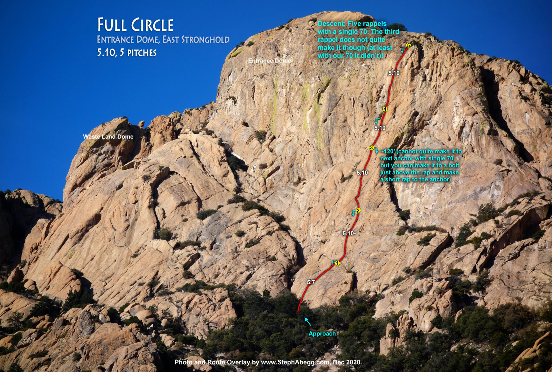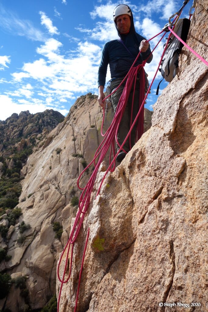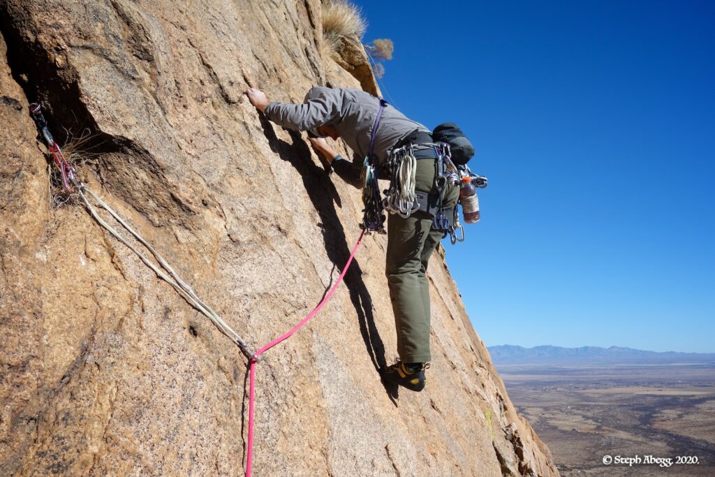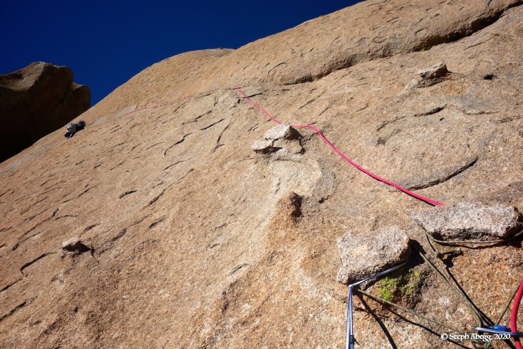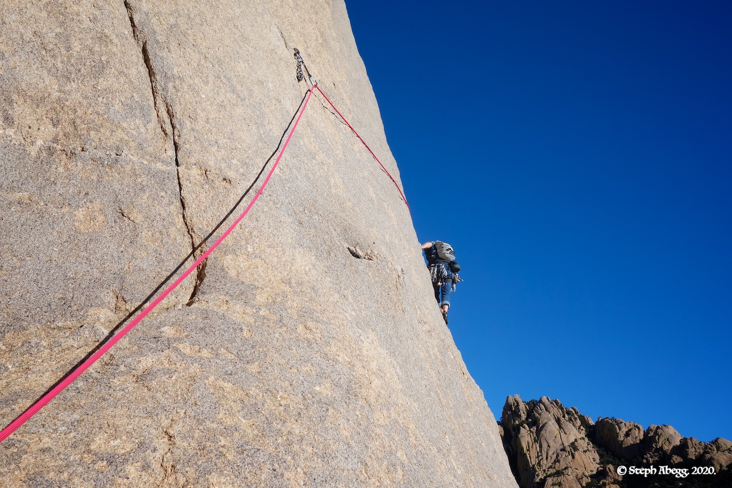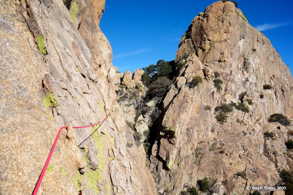 9 of the formations: Waste Land Dome (three times), Stronghold Dome, Cochise Dome, End Pinnacle (twice), Rockfellow Dome, Owl Rock, Out of Towners' Dome (twice), Maybe Pinnacle, and Entrance Dome. We had decided that on this trip we would climb only sunny routes given the maximum number of stars in the guidebook (three stars), so all of the routes we did were warm and spectacular. And despite the quality of the climbing, we never encountered another party on any of the routes we did. Nate did all of the leading on this trip. With Nate on the sharp end leading all 52 pitches, we climbed the routes quickly. He cruised up the notorious Cochise runouts and difficult 5.10-11 sections with impressive ease. Even without my knee injury several of the pitches we climbed would have been pretty heady for me to lead (which likely explains the paucity of other climbers in such a spectacular area). I enjoyed following and getting back on the rock with my favorite partner. As far as my knee went, it felt stronger and more confident by the day and I had no issues.