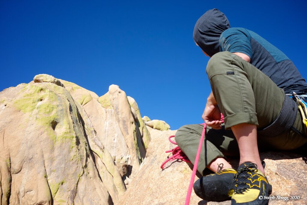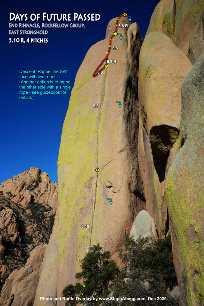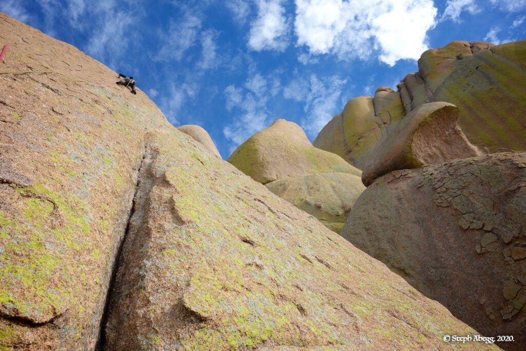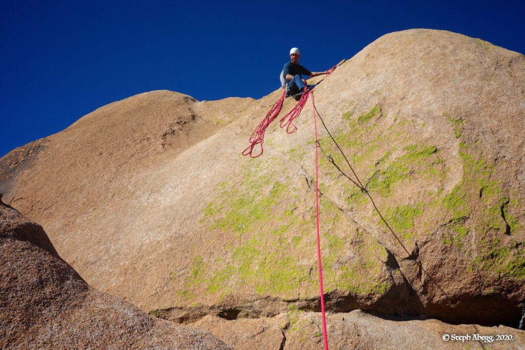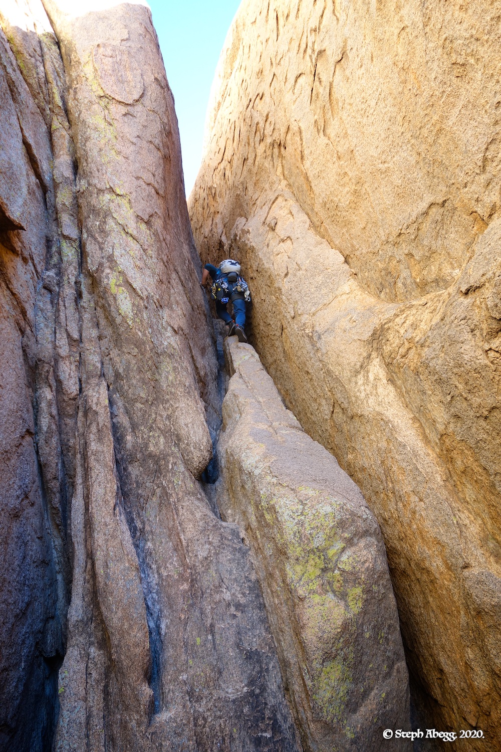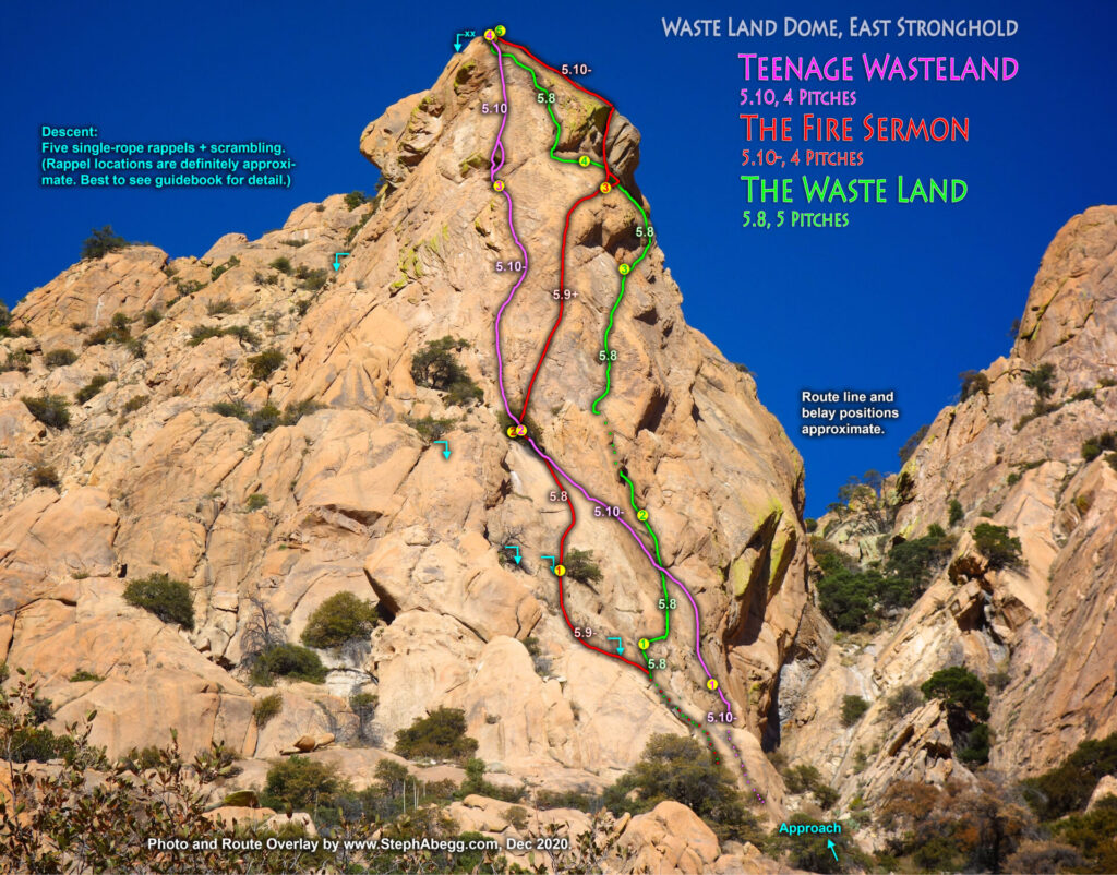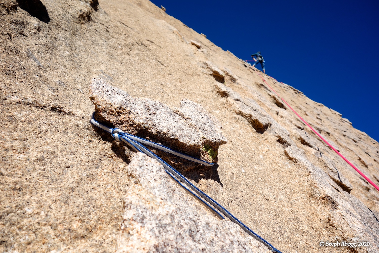 9 of the formations: Waste Land Dome (three times), Stronghold Dome, Cochise Dome, End Pinnacle (twice), Rockfellow Dome, Owl Rock, Out of Towners' Dome (twice), Maybe Pinnacle, and Entrance Dome. We had decided that on this trip we would climb only sunny routes given the maximum number of stars in the guidebook (three stars), so all of the routes we did were warm and spectacular. And despite the quality of the climbing, we never encountered another party on any of the routes we did. Nate did all of the leading on this trip. With Nate on the sharp end leading all 52 pitches, we climbed the routes quickly. He cruised up the notorious Cochise runouts and difficult 5.10-11 sections with impressive ease. Even without my knee injury several of the pitches we climbed would have been pretty heady for me to lead (which likely explains the paucity of other climbers in such a spectacular area). I enjoyed following and getting back on the rock with my favorite partner. As far as my knee went, it felt stronger and more confident by the day and I had no issues.