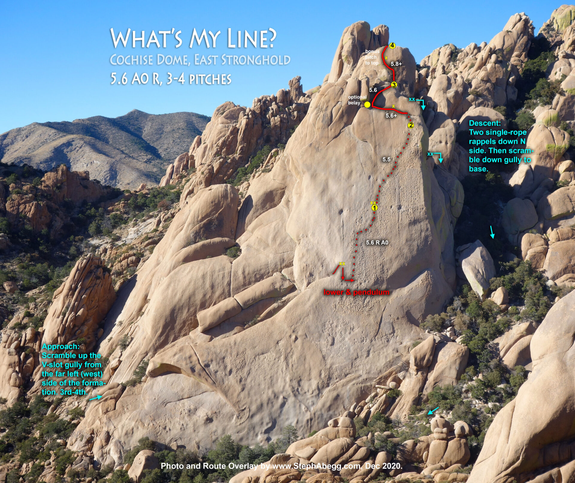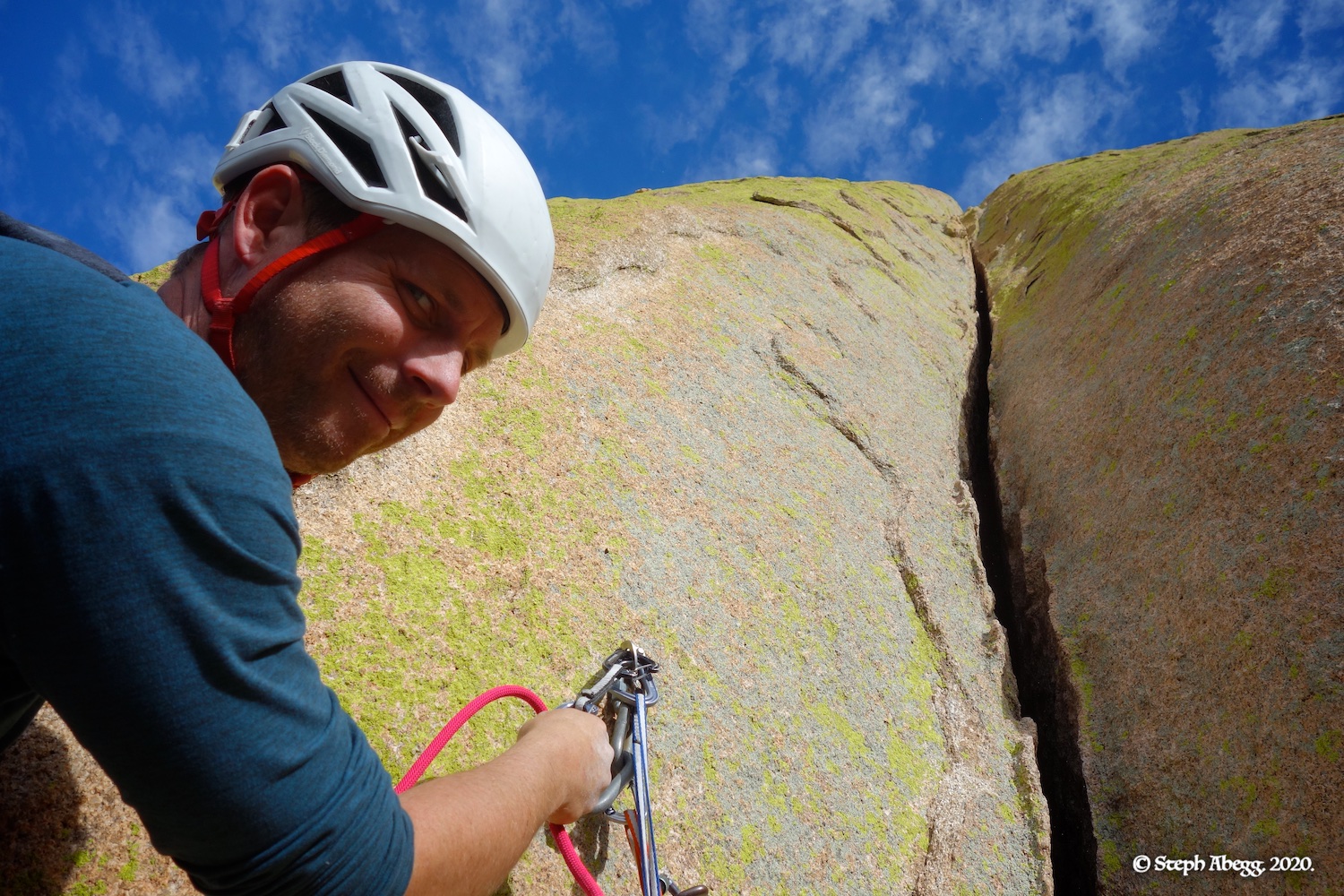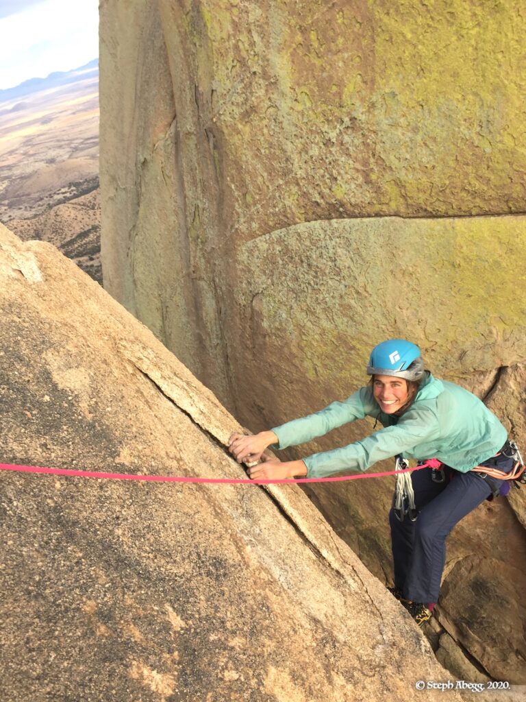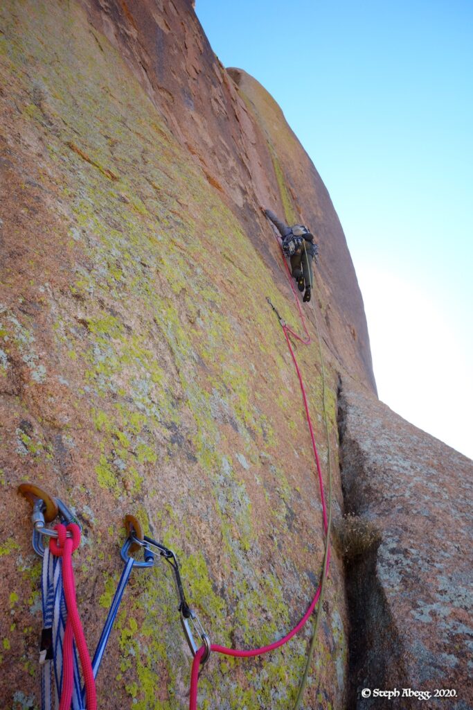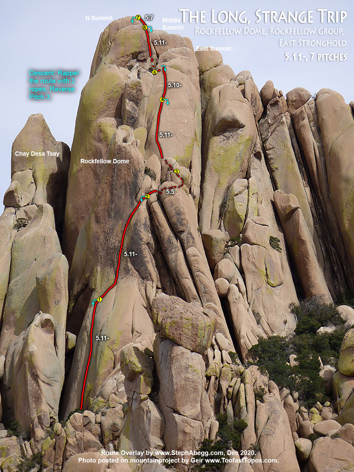 9 of the formations: Waste Land Dome (three times), Stronghold Dome, Cochise Dome, End Pinnacle (twice), Rockfellow Dome, Owl Rock, Out of Towners' Dome (twice), Maybe Pinnacle, and Entrance Dome. We had decided that on this trip we would climb only sunny routes given the maximum number of stars in the guidebook (three stars), so all of the routes we did were warm and spectacular. And despite the quality of the climbing, we never encountered another party on any of the routes we did. Nate did all of the leading on this trip. With Nate on the sharp end leading all 52 pitches, we climbed the routes quickly. He cruised up the notorious Cochise runouts and difficult 5.10-11 sections with impressive ease. Even without my knee injury several of the pitches we climbed would have been pretty heady for me to lead (which likely explains the paucity of other climbers in such a spectacular area). I enjoyed following and getting back on the rock with my favorite partner. As far as my knee went, it felt stronger and more confident by the day and I had no issues.