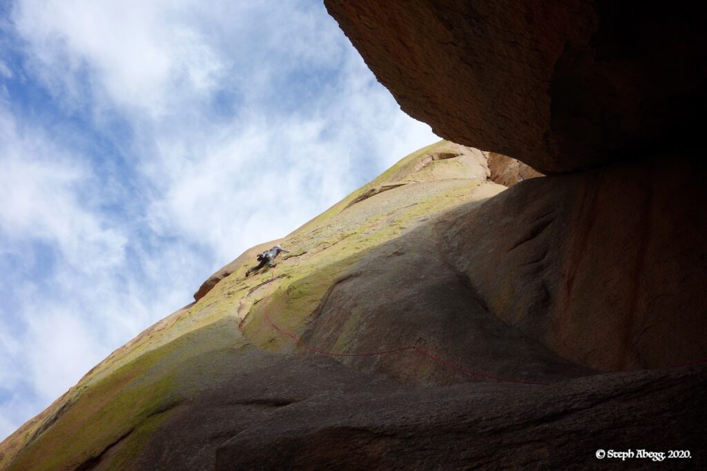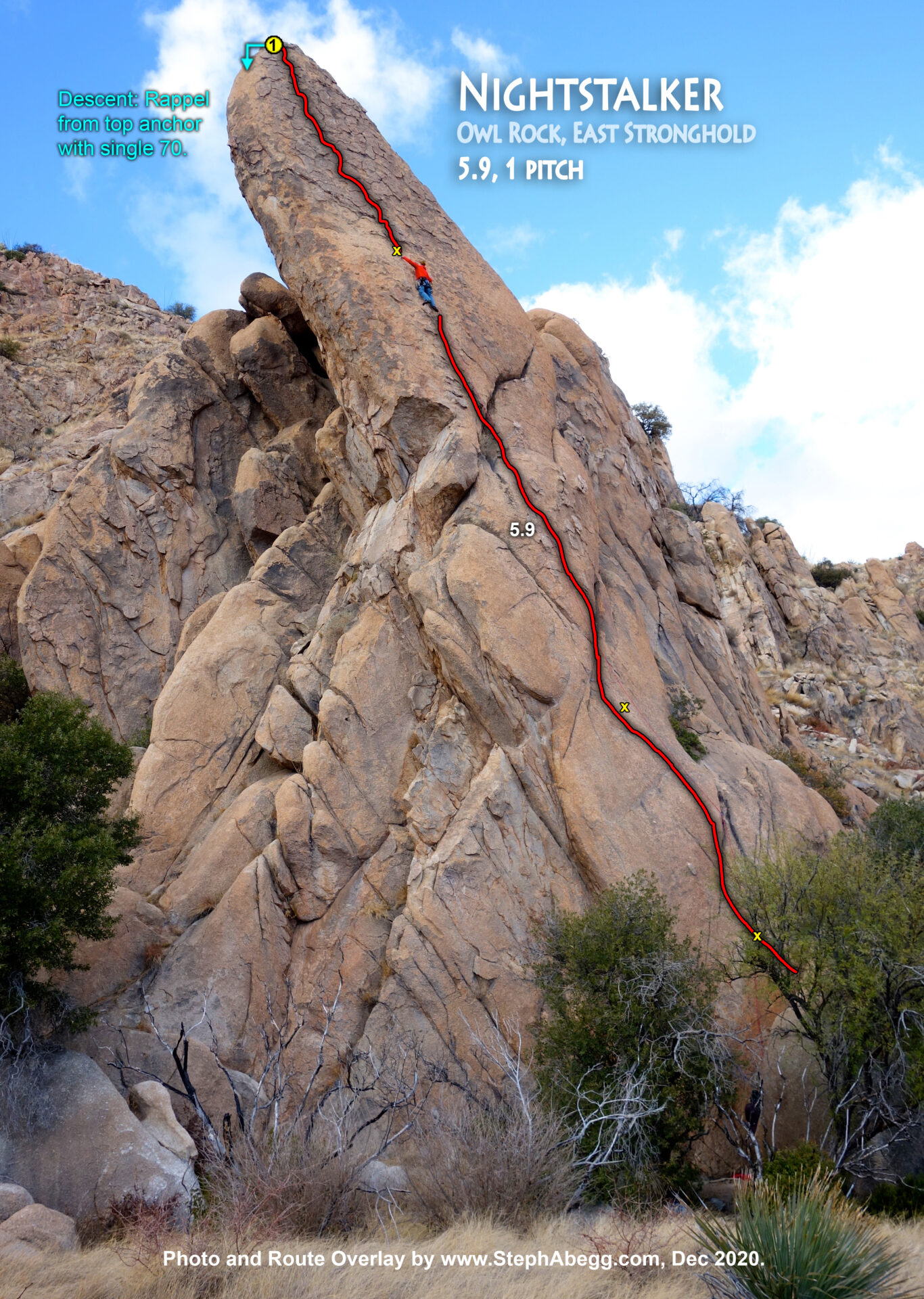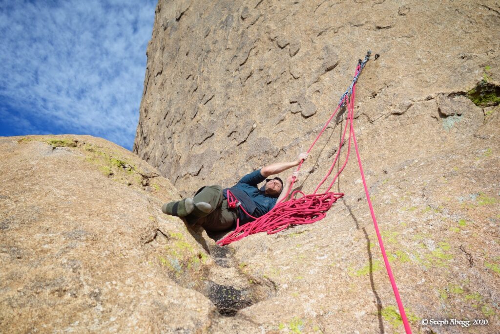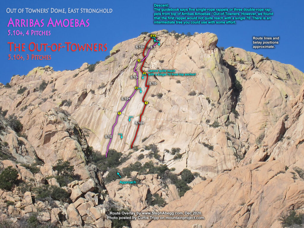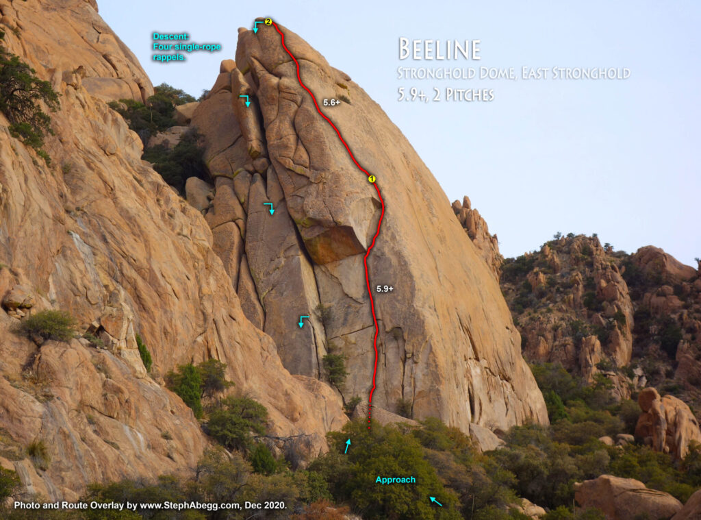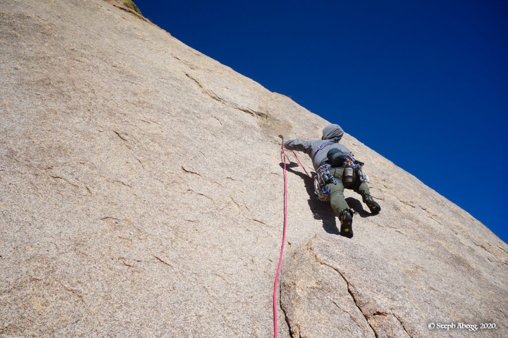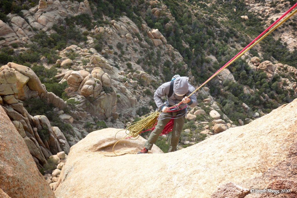 9 of the formations: Waste Land Dome (three times), Stronghold Dome, Cochise Dome, End Pinnacle (twice), Rockfellow Dome, Owl Rock, Out of Towners' Dome (twice), Maybe Pinnacle, and Entrance Dome. We had decided that on this trip we would climb only sunny routes given the maximum number of stars in the guidebook (three stars), so all of the routes we did were warm and spectacular. And despite the quality of the climbing, we never encountered another party on any of the routes we did. Nate did all of the leading on this trip. With Nate on the sharp end leading all 52 pitches, we climbed the routes quickly. He cruised up the notorious Cochise runouts and difficult 5.10-11 sections with impressive ease. Even without my knee injury several of the pitches we climbed would have been pretty heady for me to lead (which likely explains the paucity of other climbers in such a spectacular area). I enjoyed following and getting back on the rock with my favorite partner. As far as my knee went, it felt stronger and more confident by the day and I had no issues.