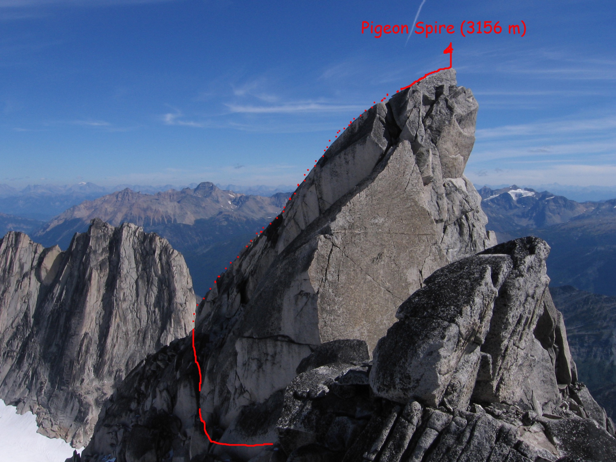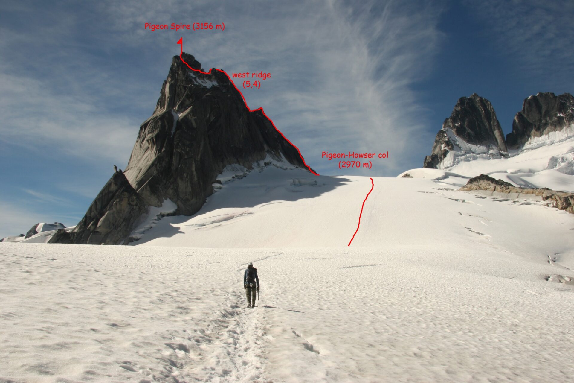It looked like it would be another sunny day. So, at 10:45am, we left Applebee Dome Camp, an hour later were on top of Bugaboo-Snowpatch col, and an hour after that were at Pigeon-Howser col, at the base of the west ridge of Pigeon Spire. Below is a photo of the route along the west ridge as seen from the approach along the Upper Vowell glacier.