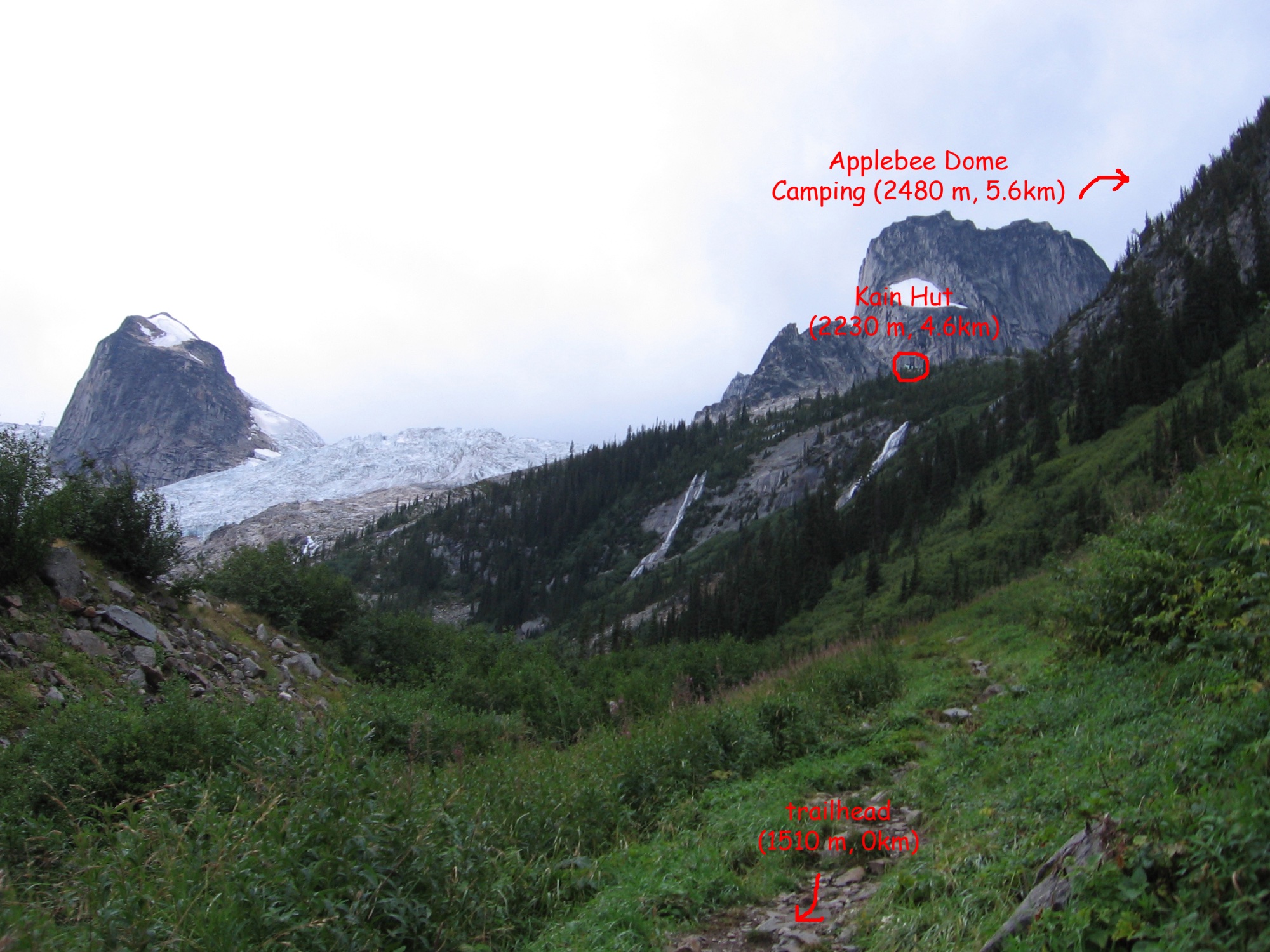 It took us 2 hours to hike the 4.6 km and 720 m (2,400 ft) to the Kain Hut. By this time it was raining pretty hard and getting dark, but we continued up the hill to the right towards Applebee Camping Area (Applebee would be closer to the climbs and also $5/night as opposed to $22/night in the hut). It took us another hour to hike the extra kilometer and 250 m (800 ft) to Applebee Dome. We stumbled around boulders a bit in the dark trying to find the trail and the camping area, but eventually we saw a headlight which showed us where the camping plateau was (in general, if you head uphill and rightwards and make sure to cross a rather big stream, you will find Applebee, since any further right and you would be climbing Eastpoint Spire or any further uphill and you would be swimming in a lake). We set up the tent and crawled inside, and were asleep by 11pm.