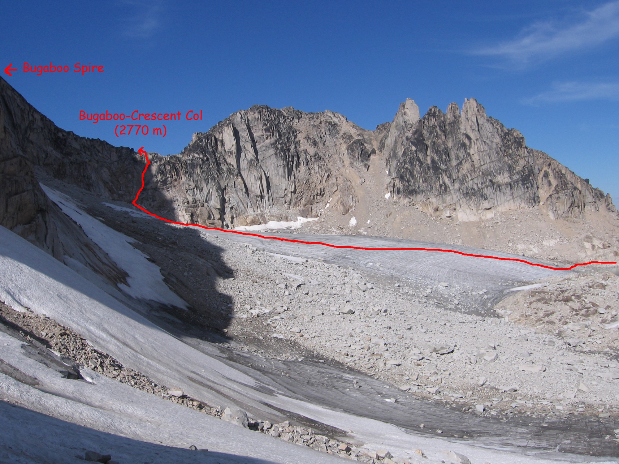 However, an hour later we discovered that, in our excitement to climb, we had just climbed the Bugaboo-Snowpatch col rather than the Bugaboo-Crescent col that leads to the NE ridge on the other ridge of Bugaboo. (By the way, the approach to the Bugaboo-Snowpatch col can be a problem late in the season, but we managed to easily navigate the steep icy glacier and loose sand.)