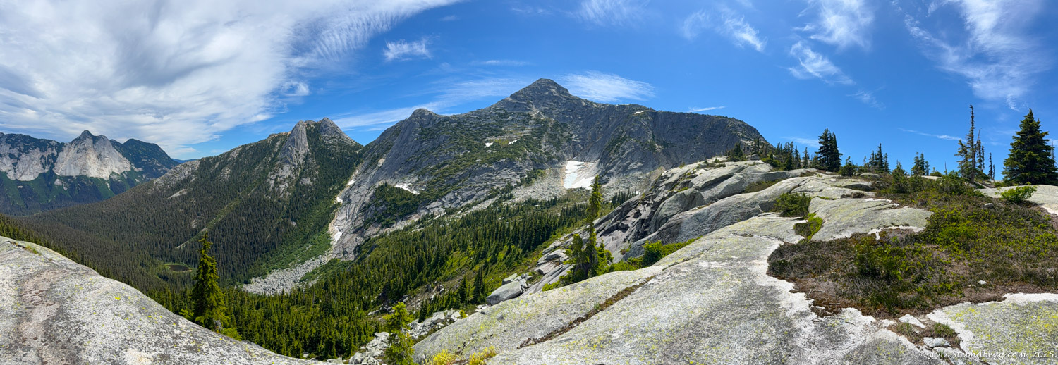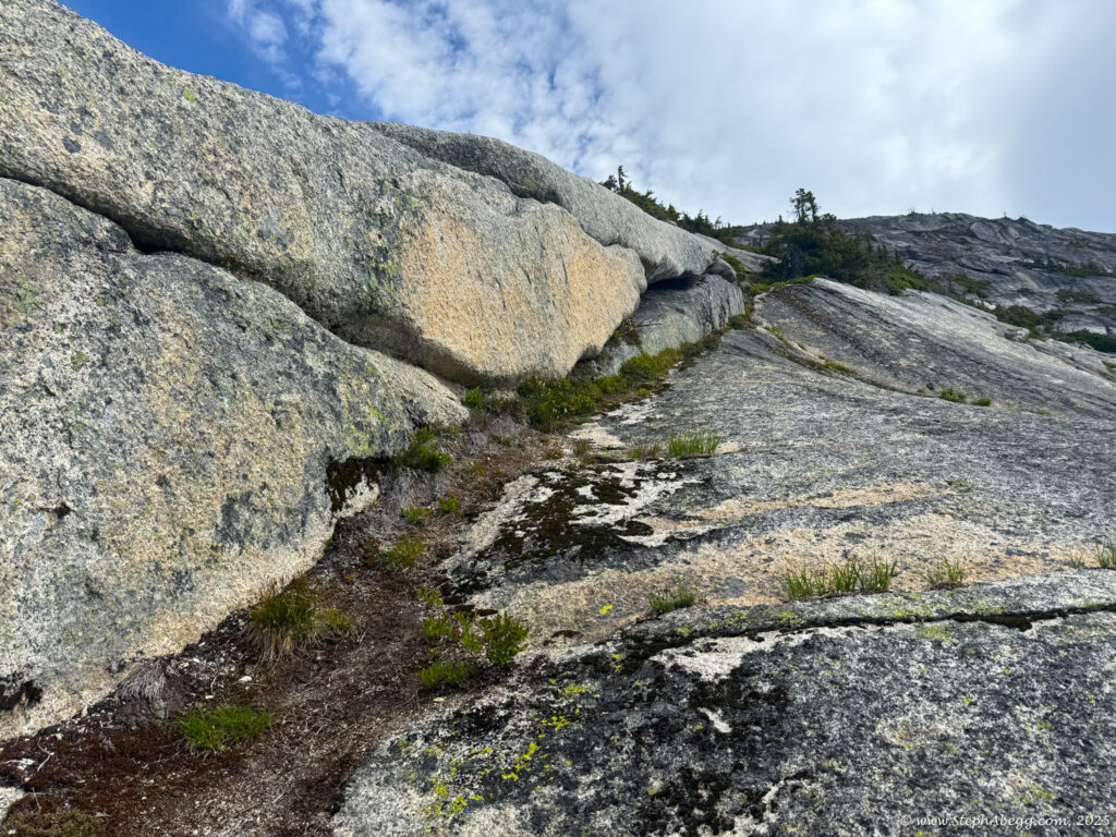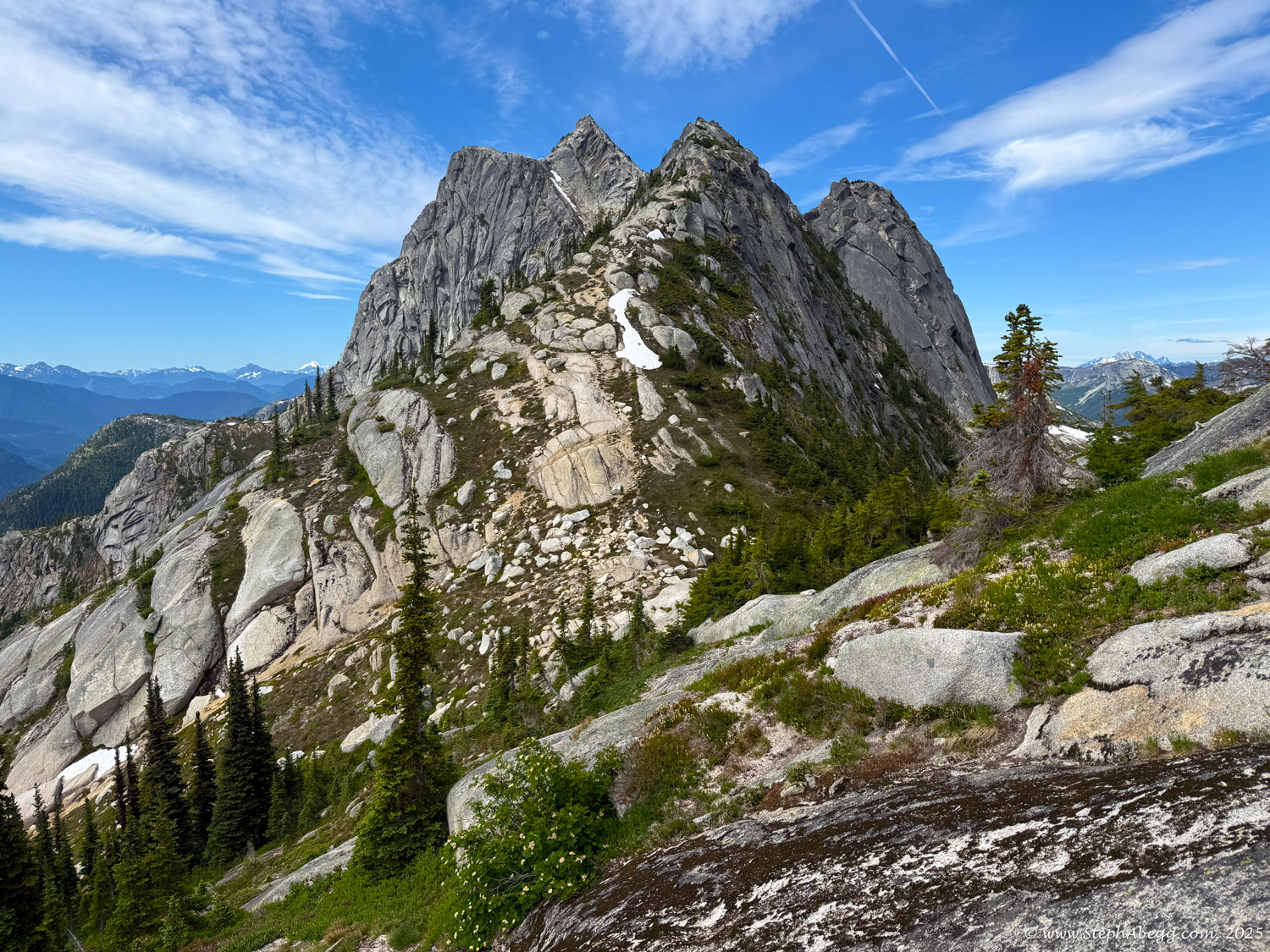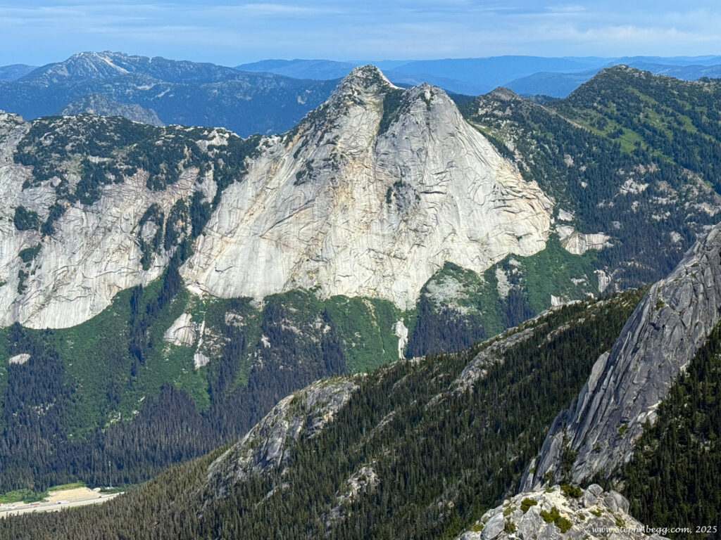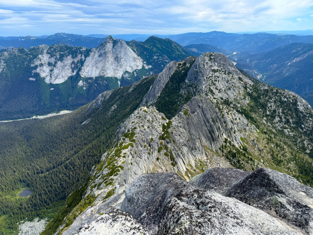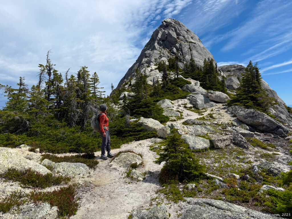 The Markhor–Needle Traverse starts with a steep climber’s path through forest and slabby granite, leading to the summit of Markhor. A slabby downclimb on the south side of Markhor marks the beginning of the traverse to Needle. The route features mostly solid rock, with occasional patches of kitty litter, some bushy bits, and healthy exposure. The crux is a short but exposed 4th class downclimb along an arete. Otherwise, the scrambling is mostly cruiser 2nd and 3rd class, following a striking line up to the summit of Needle. From there, the descent follows Needle’s west ridge and rejoins the main trail back to the car.