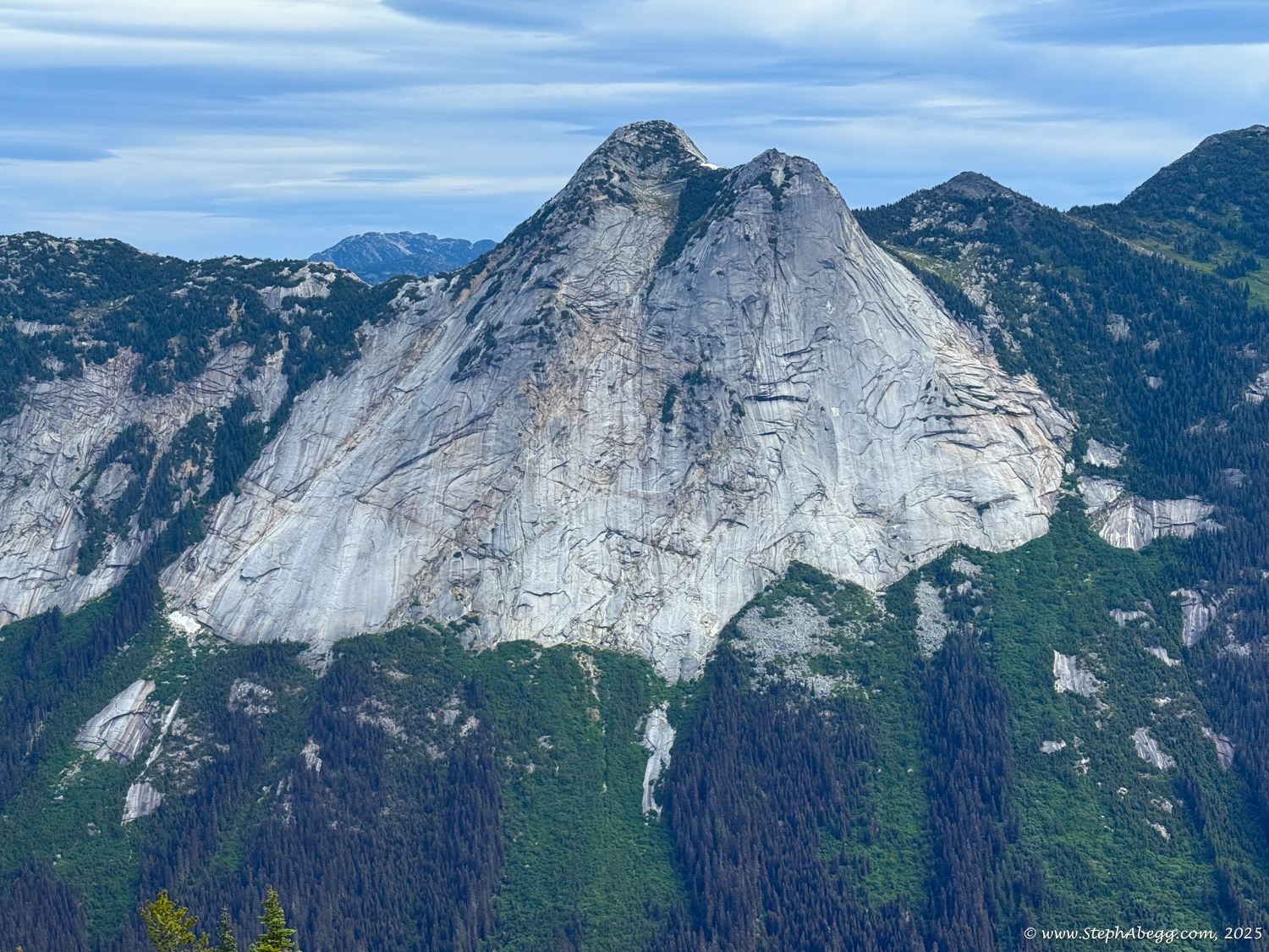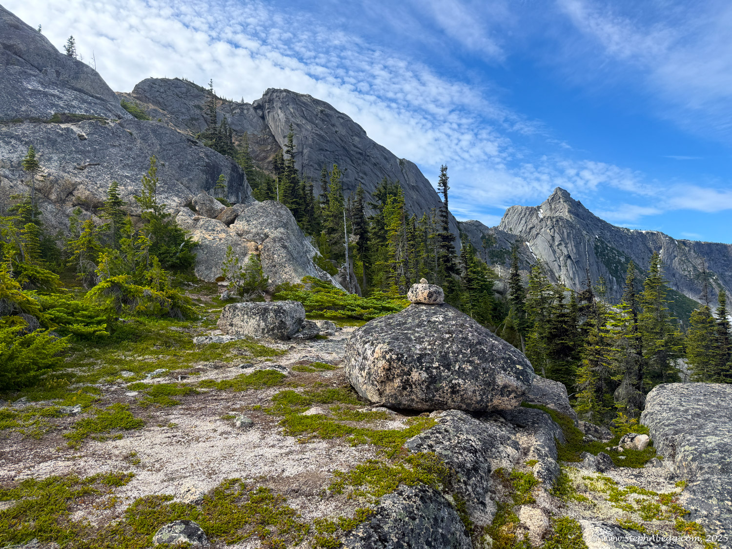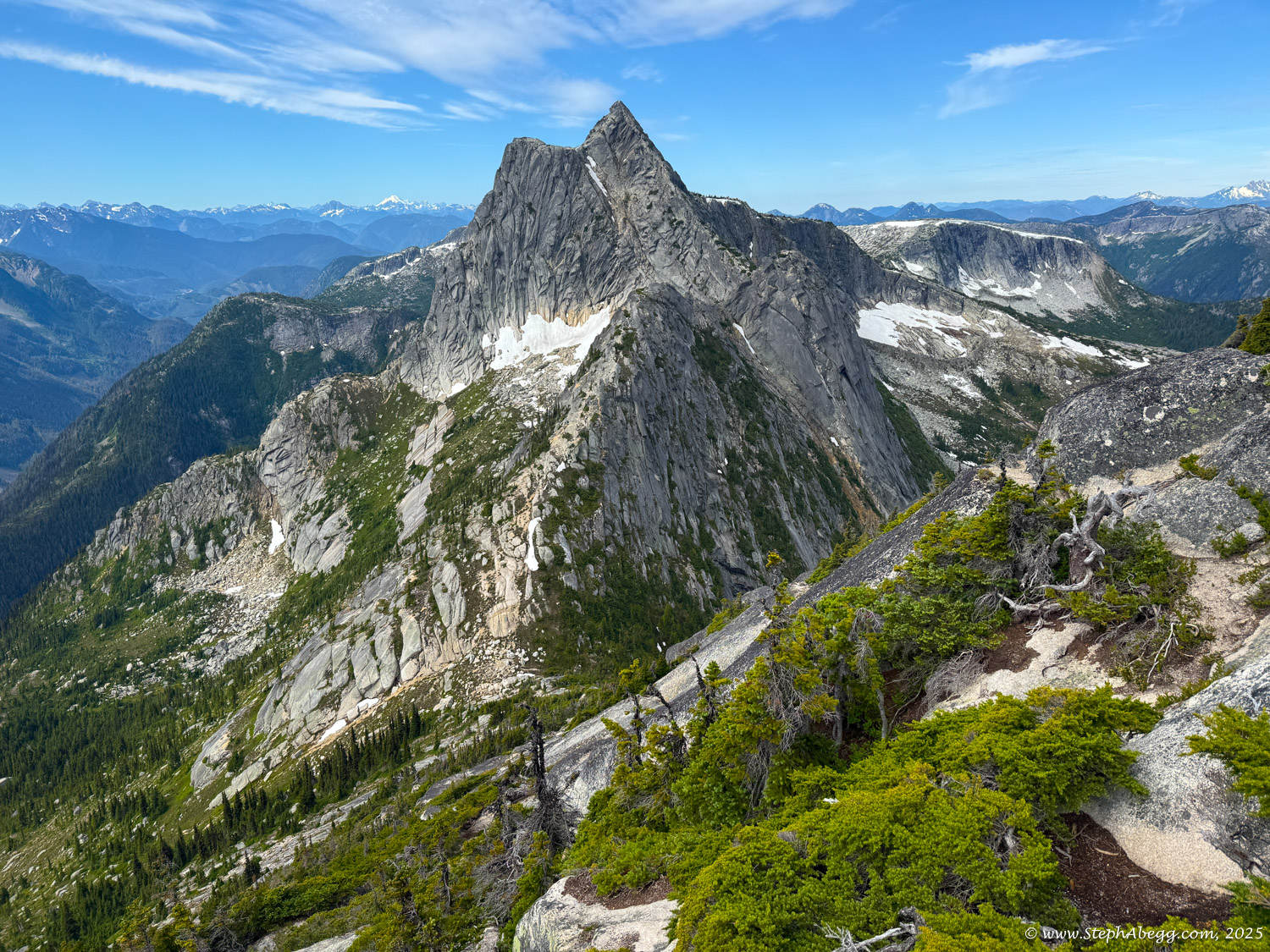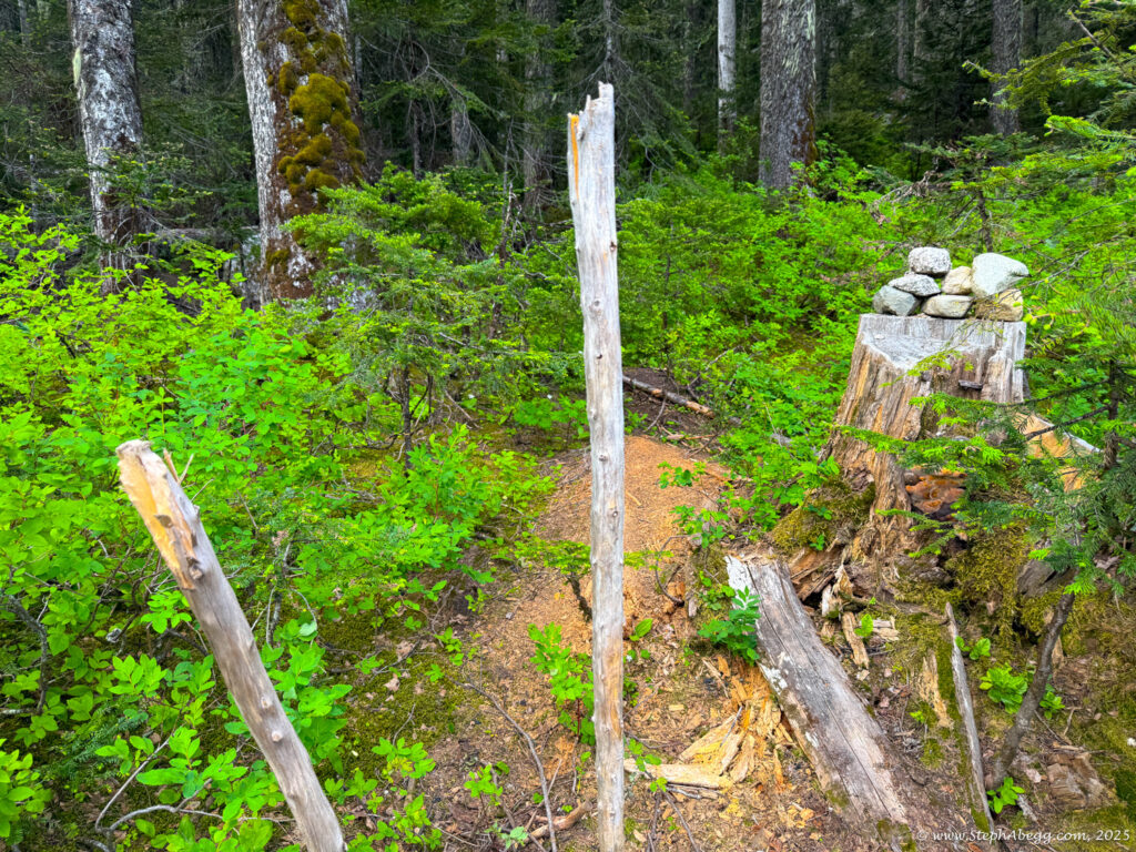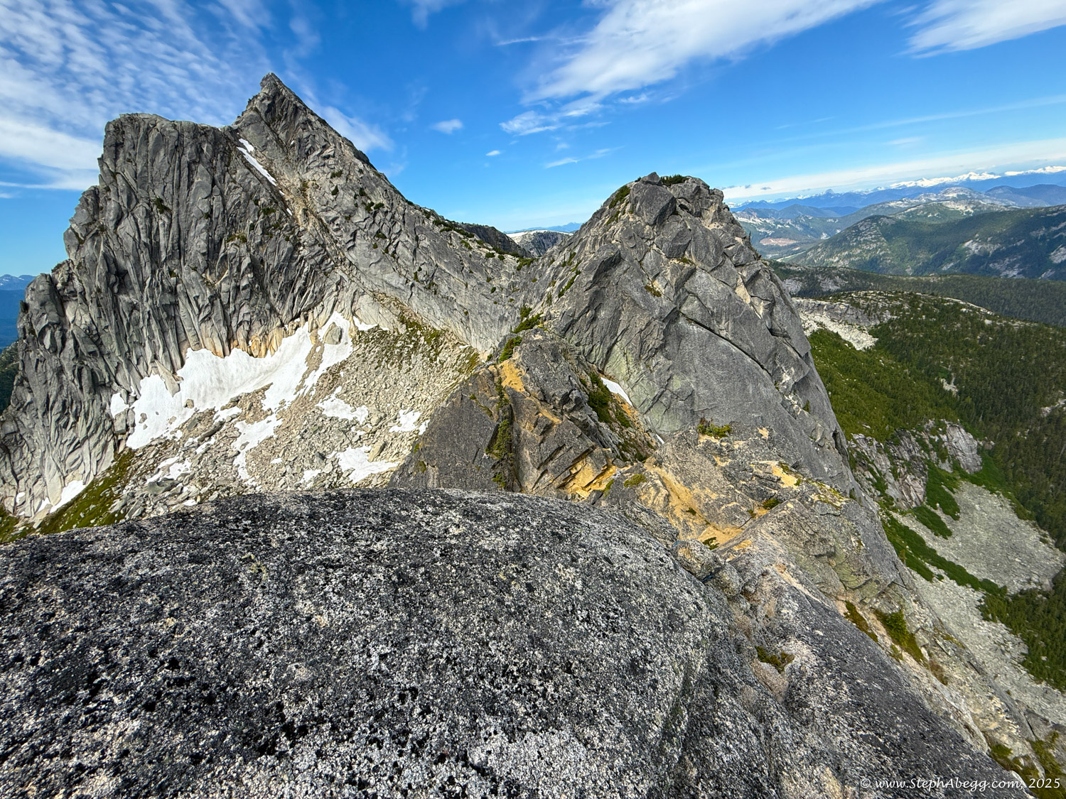 The Markhor–Needle Traverse starts with a steep climber’s path through forest and slabby granite, leading to the summit of Markhor. A slabby downclimb on the south side of Markhor marks the beginning of the traverse to Needle. The route features mostly solid rock, with occasional patches of kitty litter, some bushy bits, and healthy exposure. The crux is a short but exposed 4th class downclimb along an arete. Otherwise, the scrambling is mostly cruiser 2nd and 3rd class, following a striking line up to the summit of Needle. From there, the descent follows Needle’s west ridge and rejoins the main trail back to the car.