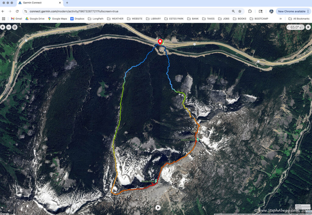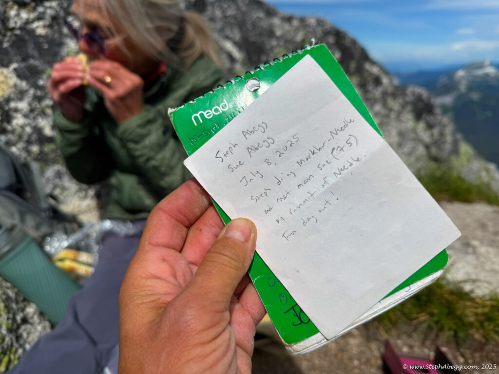 The route was scenic and fun, and in just 2 hours and 18 minutes I found myself on the summit of Needle Peak. My mom arrived about 10 minutes later. We enjoyed a leisurely lunch on top before heading down. All in all, it was a short but rewarding mountain outing—3,900 feet of elevation gain and loss for me, around 3,000 for my mom. On the drive home, she mentioned that it was too short of a day. She’s 75. It was really special to share an adventure like this with her.