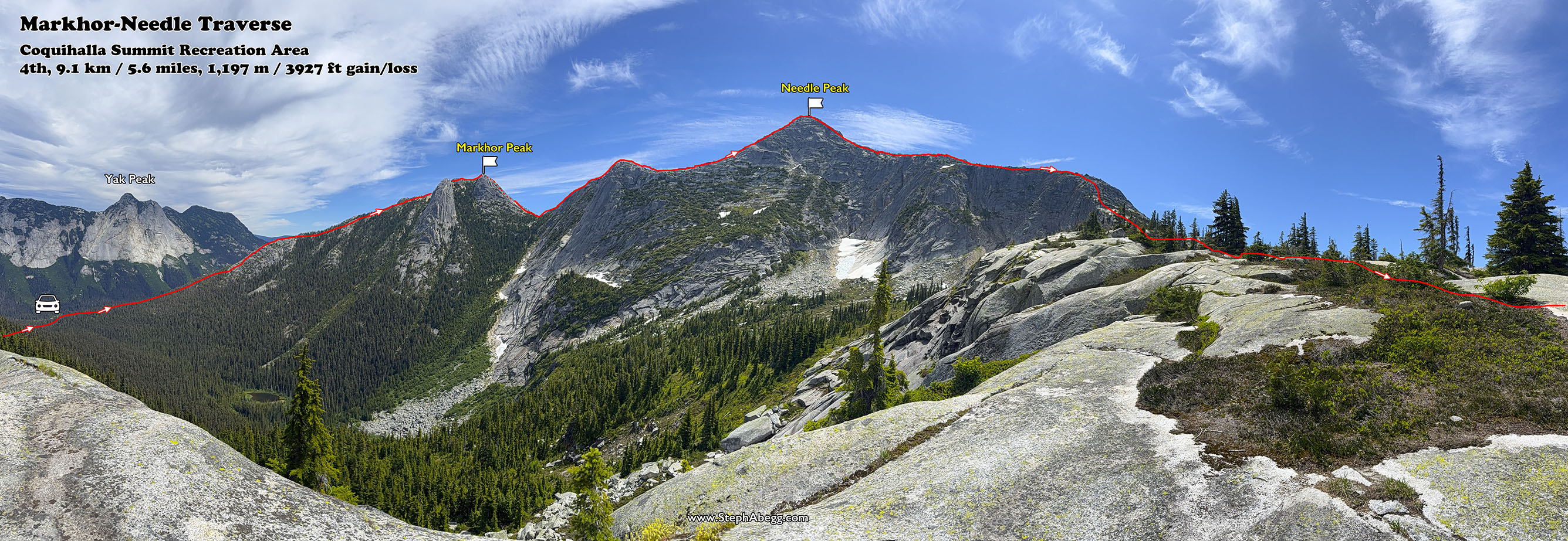 I was visiting my parents in Chilliwack, BC, and my mom and I were looking for a day in the nearby mountains. On the recommendation of my sister Jenny, we settled on the Markhor–Needle Traverse in the Coquihalla Summit Recreation Area. This scenic loop links Markhor Peak and Needle Peak via an aesthetic granite ridgeline.