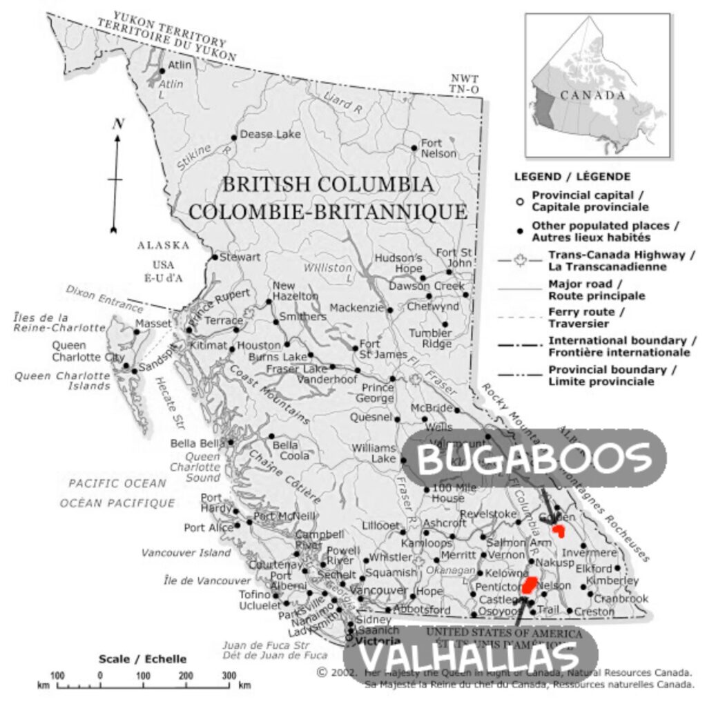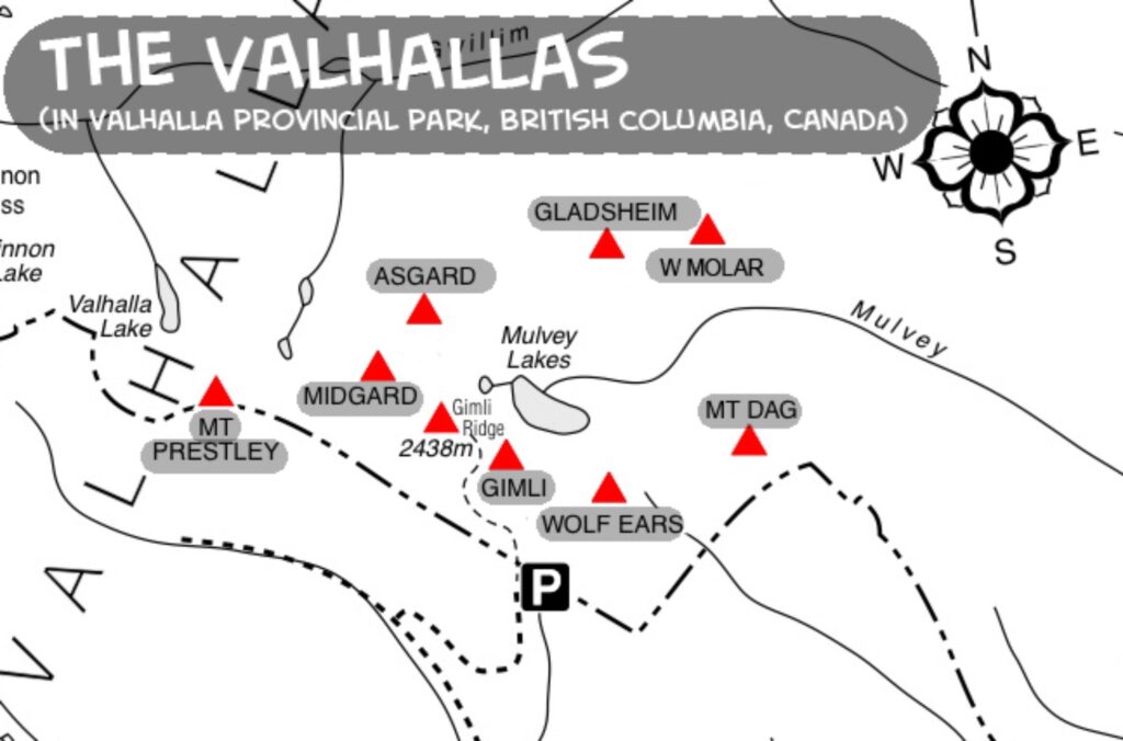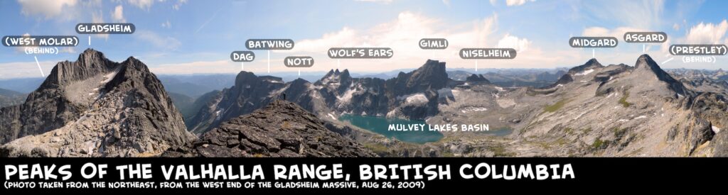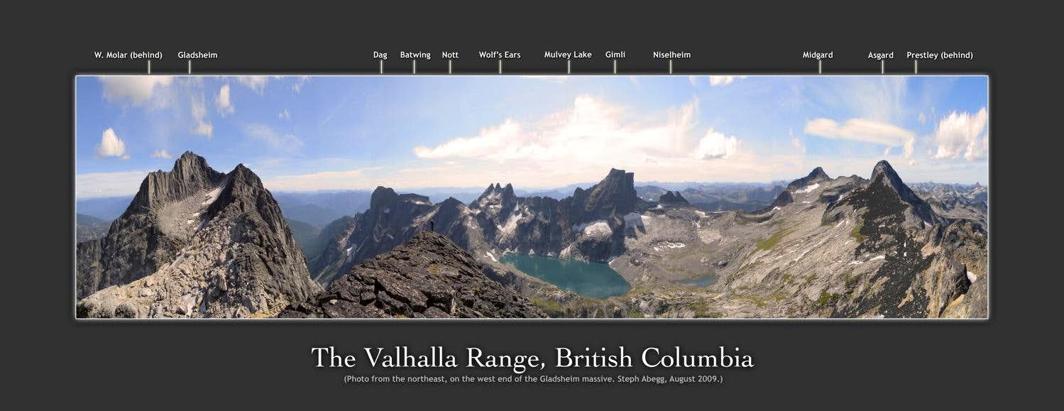 The Valhalla Range is a dramatically diverse area in the Selkirks of SW British Columbia, about 100km south of the Bugaboos. Along the southwestern boundary of Valhalla Provincial Park is an outstanding group of spires including Mount Dag, Wolf's Ears, Gimli, Asgard, and Gladsheim, all over 2,660m. These peaks offer great climbing.