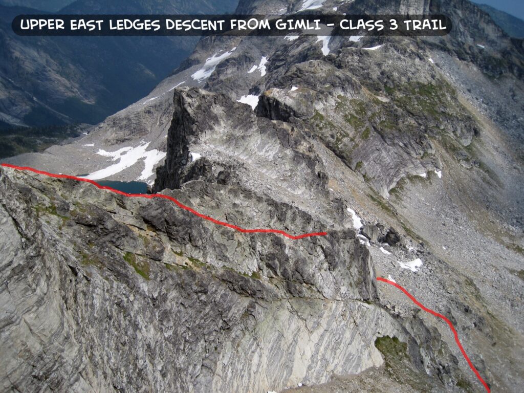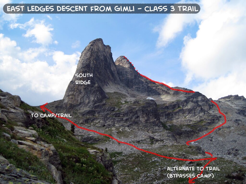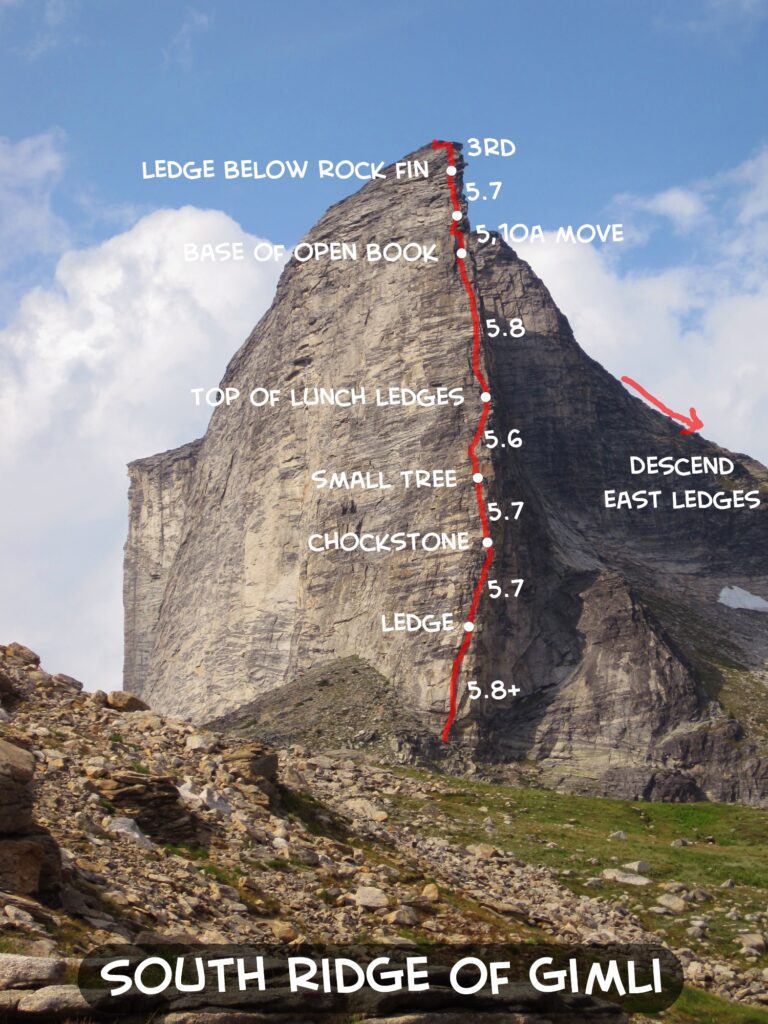 Mount Gimli is one of the most dramatic and accessible of the spires. The mountain is beautiful from all angles, but is particularly stunning when viewed from the south. From this viewpoint, the South Ridge forms a spectacular arête that begs to be climbed. And even more pleasing, the south ridge is composed of perfect gneiss and can be climbed at a moderate 5.8 grade over 7 pitches (although the grade of this route was listed as 5.10a in the most recent guide, due to a crux move on an upper pitch; the route is steep and sustained, so should not be underestimated). The approach is relatively short and there are no glaciers or snow to contend with.