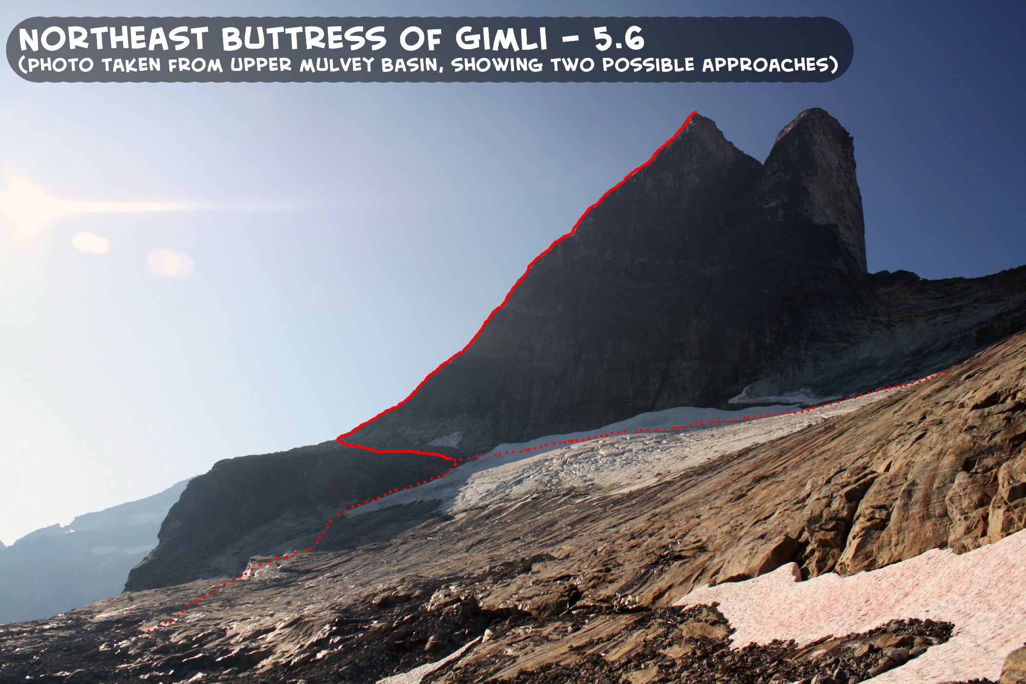 The lack of published beta for these climbs is part of what makes the Valhallas unique and challenging. It is nice to find an area of great climbing where there is not a myriad of route descriptions detailing every turn on every possible climbing line. With the internet, many climbing areas are suffering from beta overload. I was strangely pleased when a Google search of the Valhallas yielded only ample information on one climb - the popular South Ridge of Gimli - leaving the other peaks/climbs relatively untainted. There does actually exist a guidebook for the area. An out-of-print Columbia Mountains of Canada West & South (by Whipple) reportedly contains errors and lacks descriptions for more recent routes. A new 2009 West Kootenay Rock Guide (by Kristiansen and Hempsall) provides some useful updated information on accessing the Valhallas, but contains only a few of the routes on just a couple of the peaks. For most climbs in the Valhallas, the only route description that exists is the feature name (i.e. "south ridge", "east face", ect.), so finding and climbing the route lines on the peaks themselves is a challenge left up to the climber.