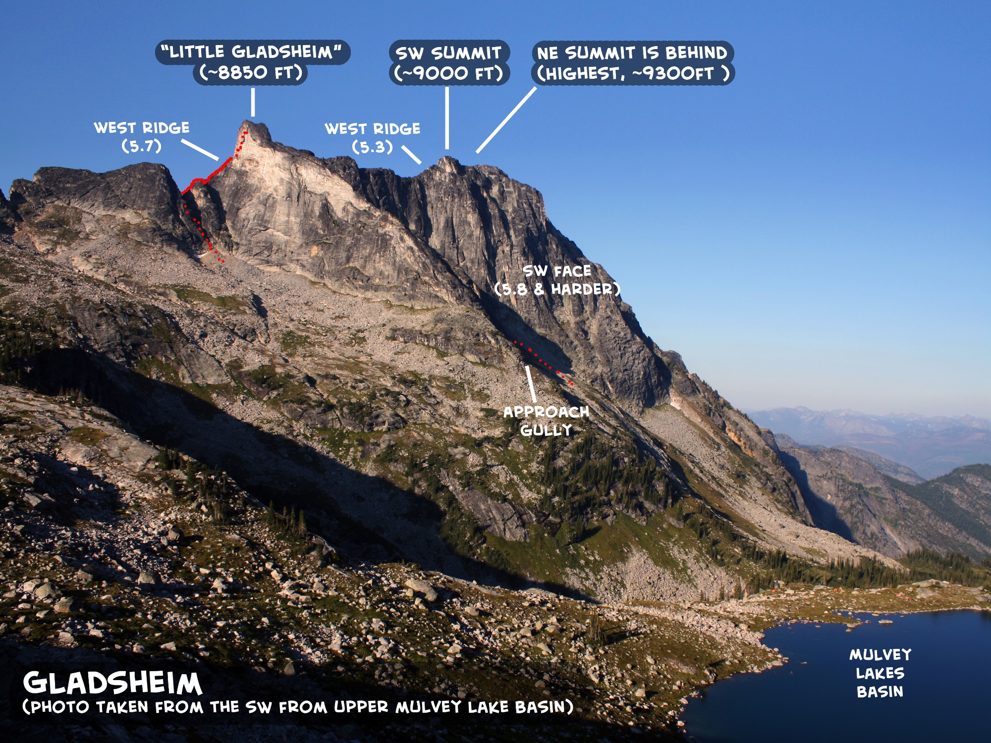 Although I'm of the opinion that the Valhallas should be kept untainted by today's tendency to overdo route beta, I've put together a webpage summarizing the useful information on the Valhallas that I was able to glean from the guidebooks and internet searches. I've also provided lots of photos and trip reports for the climbs I've done in the Valhallas, but I've tried to leave the beta on the climbs themselves relatively vague. As I mentioned, most climbs in the Valhallas are just described by their feature name.