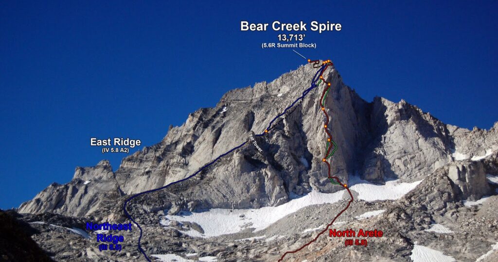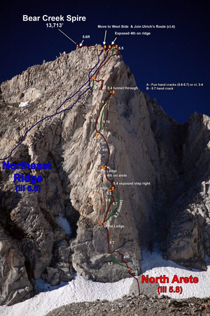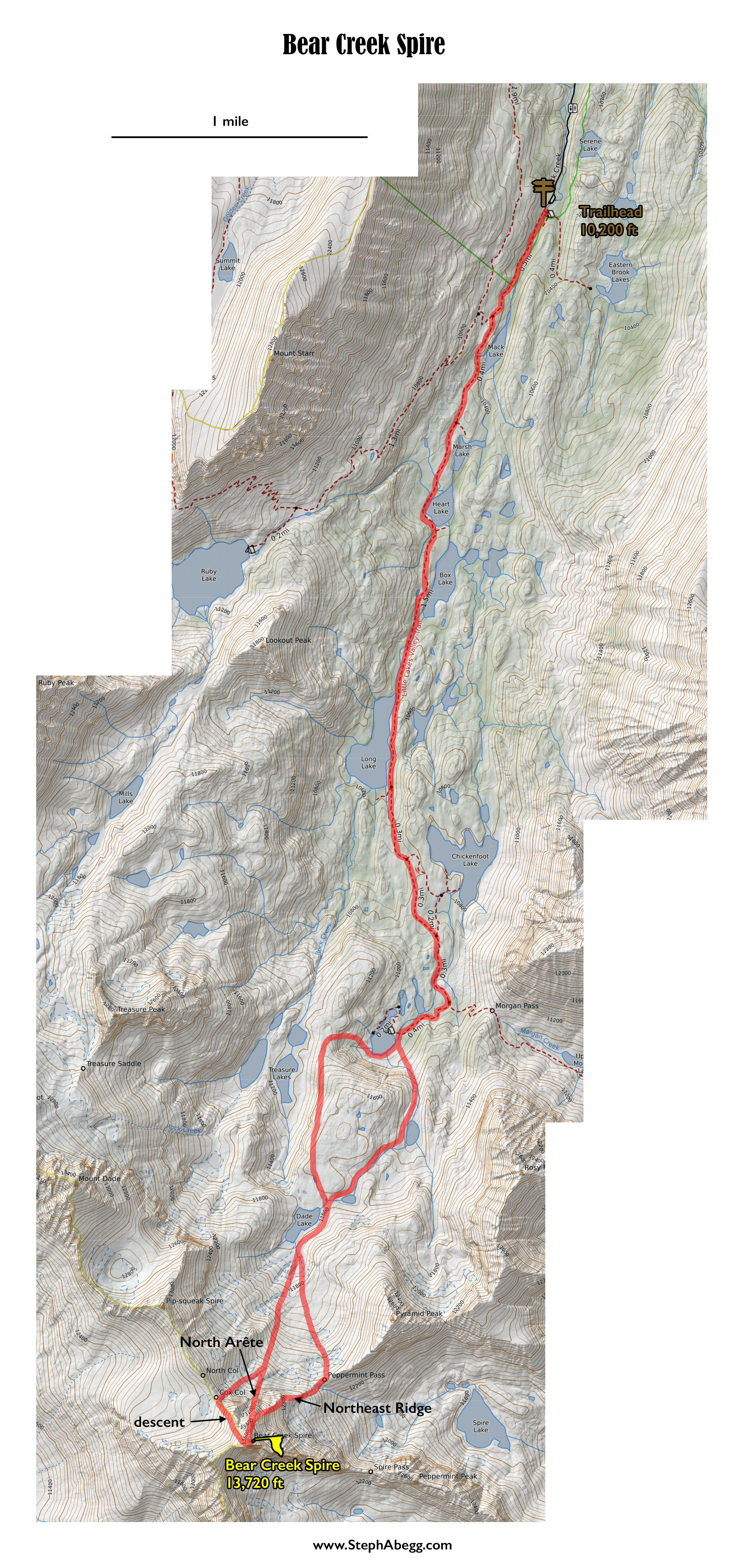 SuperTopo beta for the approach: "The approach takes most climbers 3-4 hours from Mosquito Flat to the base of the climb and involves 3.5 miles on the main trail, 2.5 miles on climbers' trails and cross-country travel, and gains about 2,500 feet in elevation. The trailhead is located at 10,260 feet making it the highest access point in the Sierra Nevada and one of the highest public access roads in the US. From Mosquito Flat, hike the Little Lakes Valley Trail for about 3.5 miles and 1 hour to just before Morgan Pass. Turn off the main trail after a wooden footbridge that crosses a creek and follow a well-worn climbers' trail for 5 minutes to Gem Lakes. From here, the climbers' trail appears intermittently. Hike up left (southeast) a steep talus drainage to an unnamed lake and continue southwest to Dade Lake (last water) and then walk directly toward Bear Creek Spire."