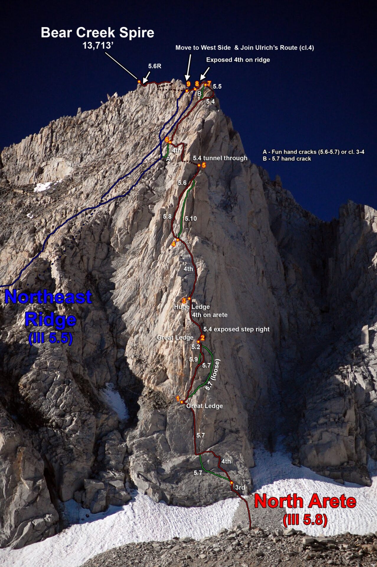 Of the 100 best Sierra alpine rock climbs listed in John Moynier and Claude Fiddler's "Sierra Classics", Bear Creek Spire claims three of them: the East Arête (5.8), the North Arête (5.8), and the Northeast Ridge (mostly 4th, some low 5th). Of these three, the North Arête takes the most compelling line, so this is the route we decided to do. The climb is typical for a Sierra route: lots of cracks, broken rock, and mostly face climbing and stemming with a few mandatory hand jams. Both cruxes involve steep stemming on awkward large flakes. The climb is easily divided in two halves. The first half climbs a striking arête/pillar with steep 5.7 and 5.8 sections separated by fourth class. The second half ascends an exposed 4th class ridge. Because only the first half is visible from the base, many climbers underestimate the length of the climb.
