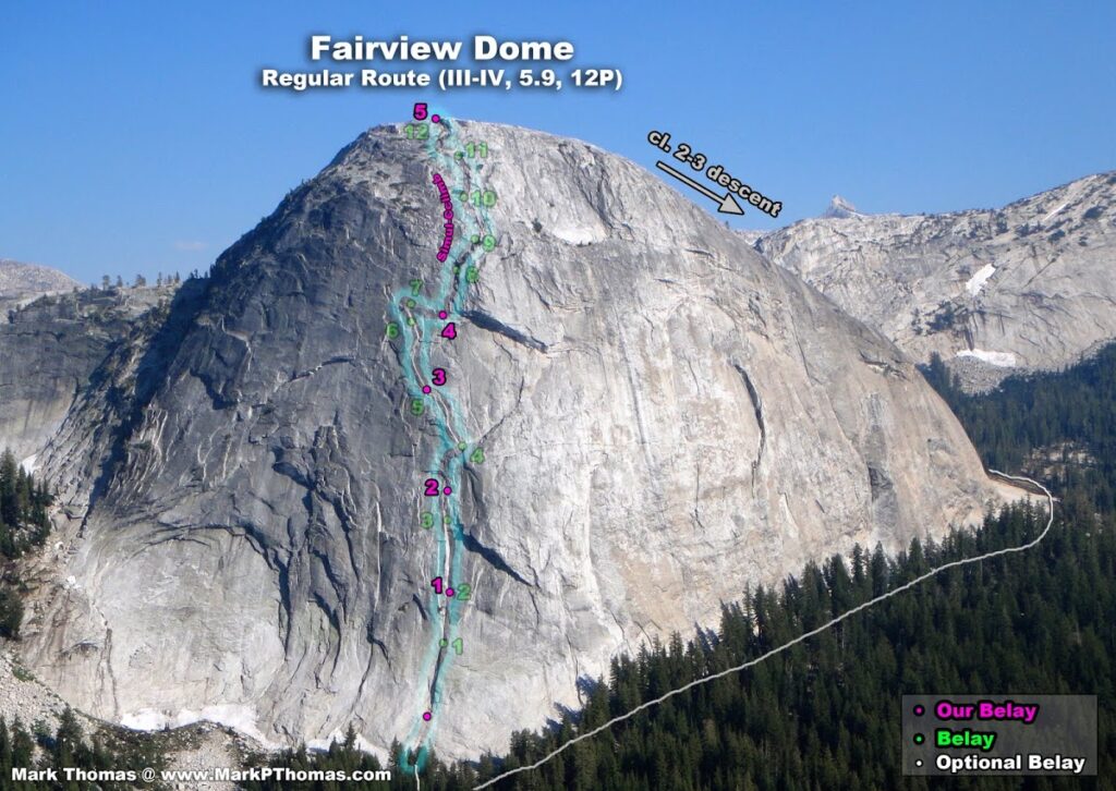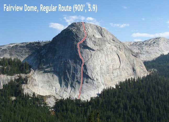 Descending from Fairview Dome is a walk-off down slabs (2nd and 3rd) on the south side to the trail below. It takes about 40 minutes to get from summit to car.