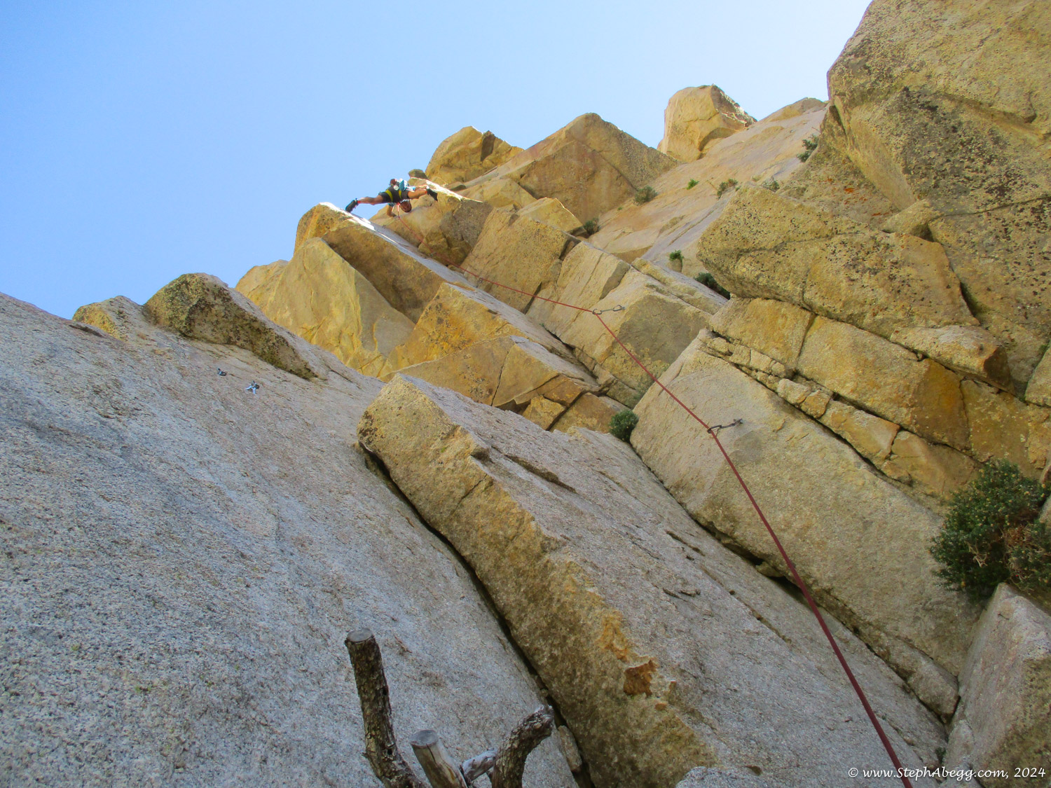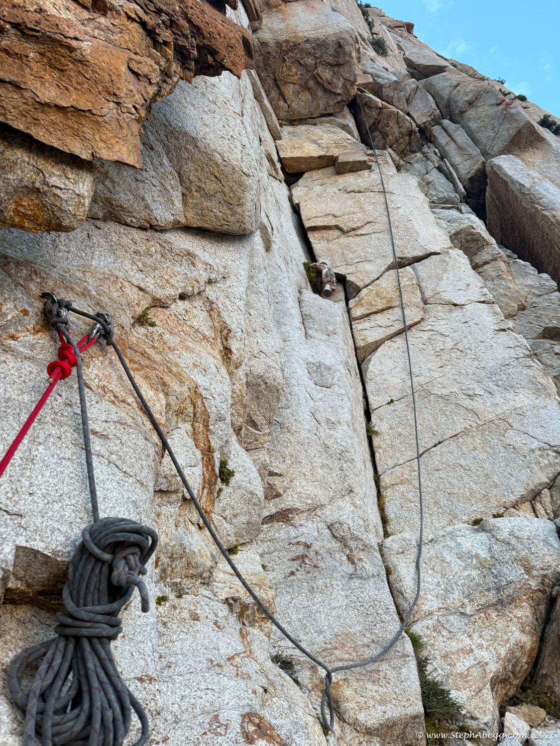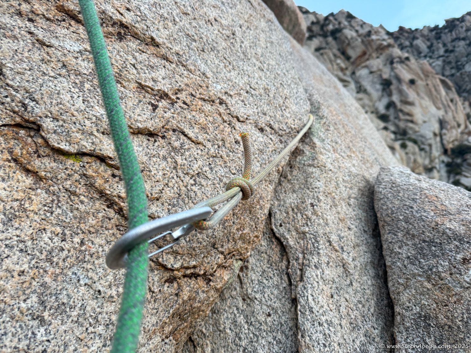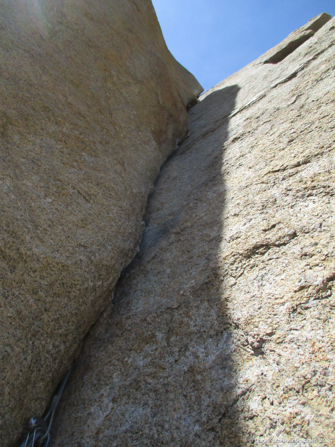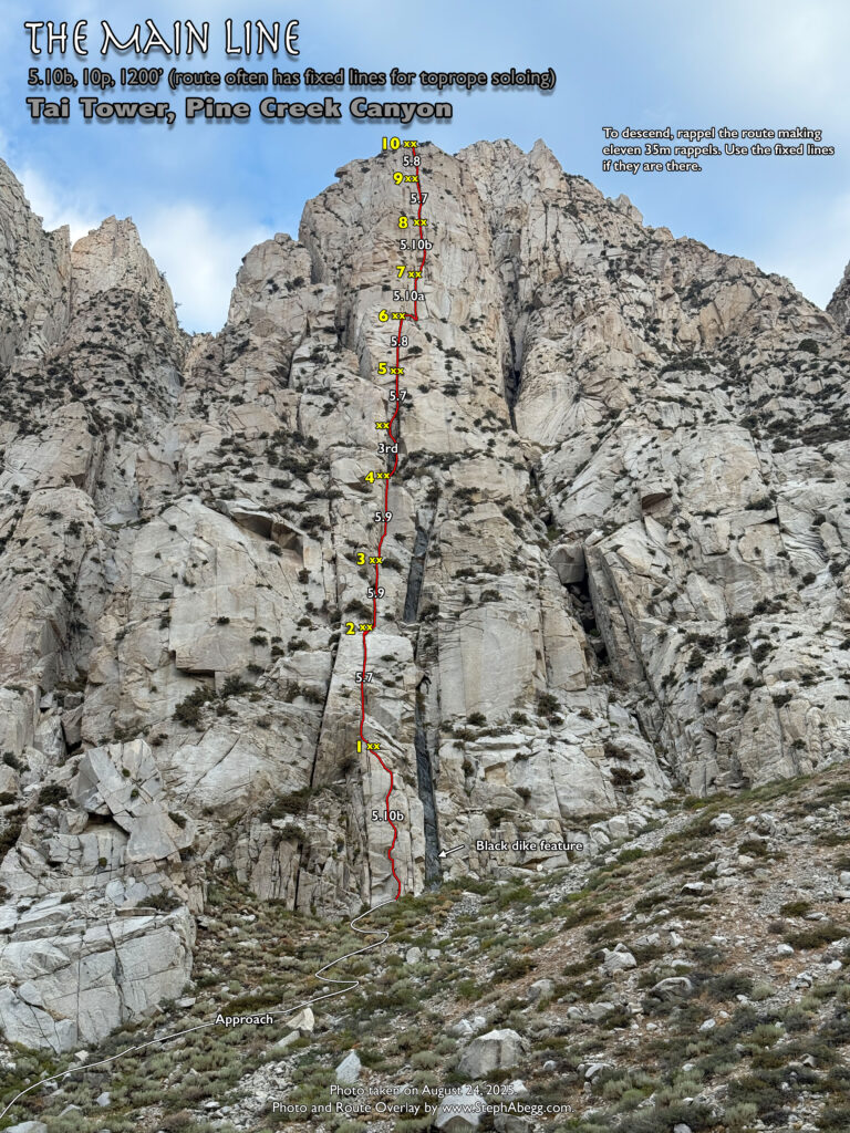 The Main Line (5.10b, 10p, 1200') on Tai Tower. With fixed ropes in place and located just outside the entrance to Pine Creek Canyon only minutes from the parking lot, it seemed like the ideal warm-up.