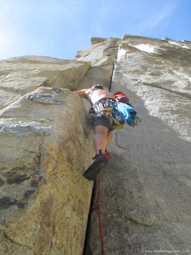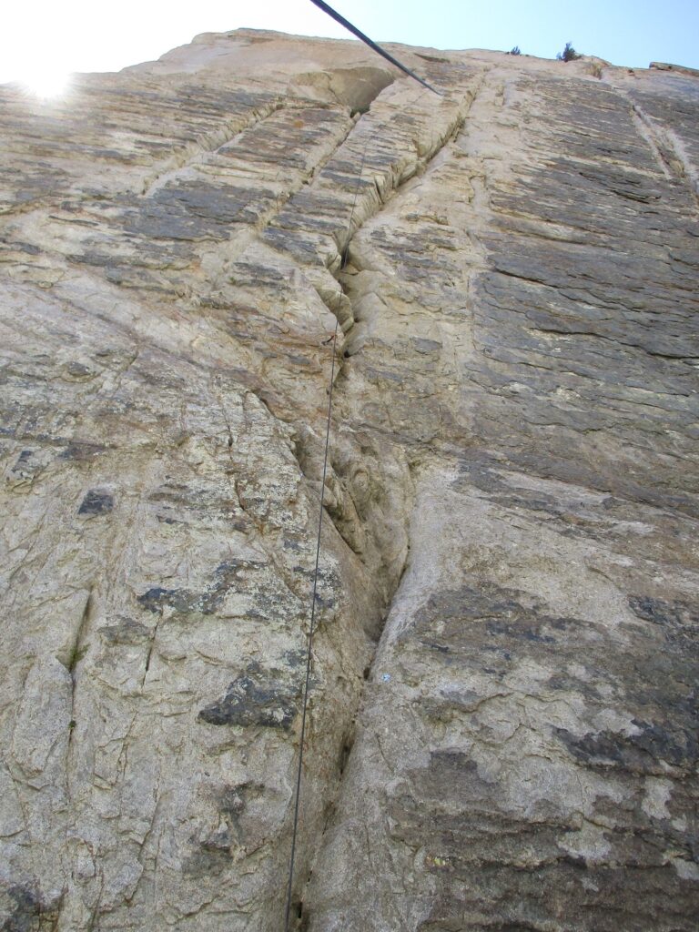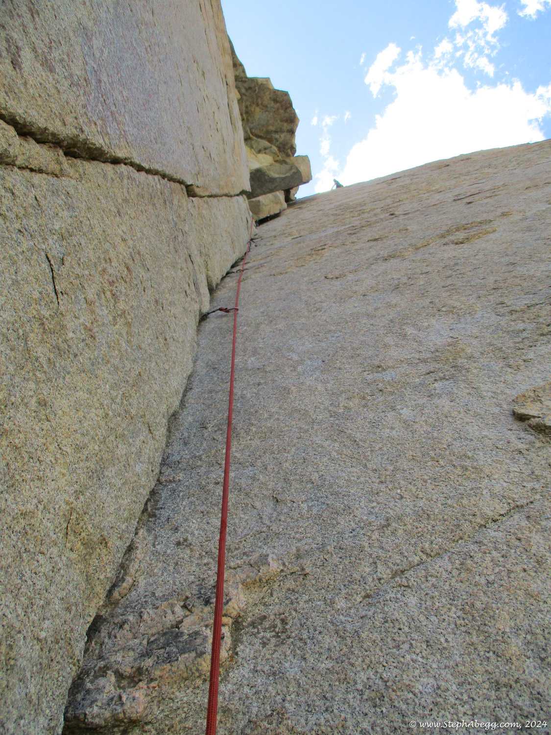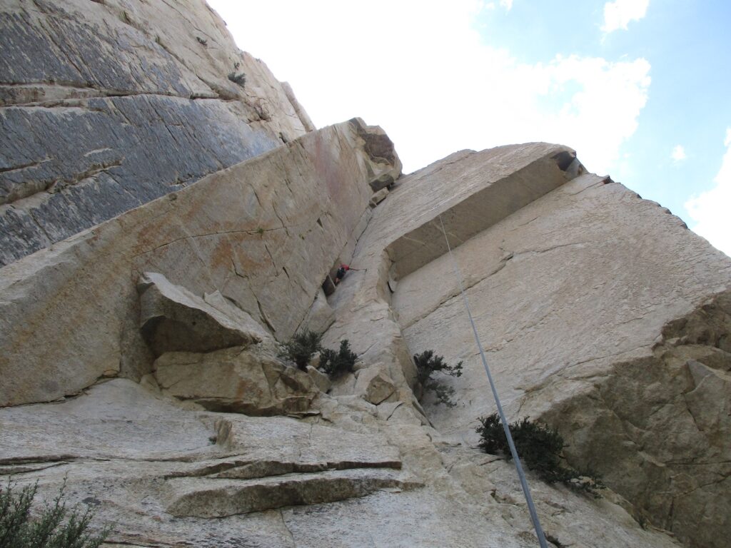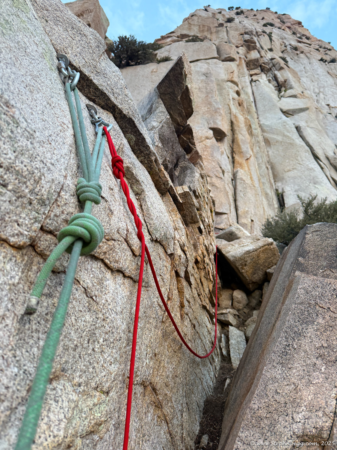 The Main Line (5.10b, 10p, 1200') on Tai Tower. With fixed ropes in place and located just outside the entrance to Pine Creek Canyon only minutes from the parking lot, it seemed like the ideal warm-up.