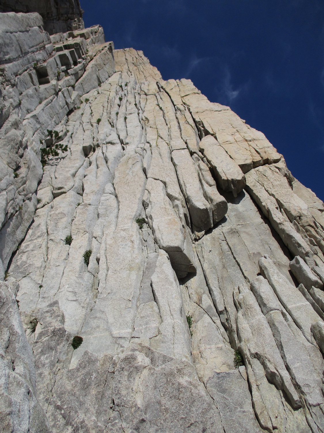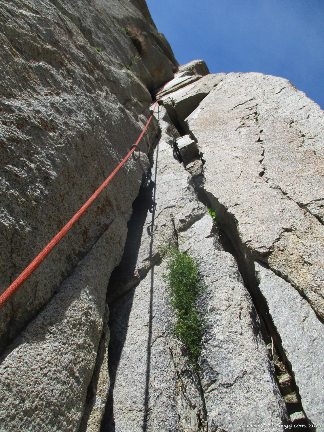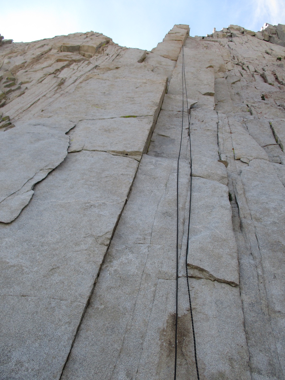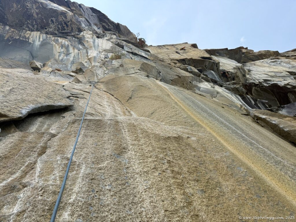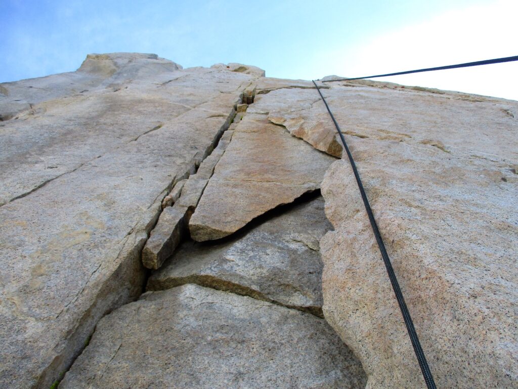 The Main Line (5.10b, 10p, 1200') on Tai Tower. With fixed ropes in place and located just outside the entrance to Pine Creek Canyon only minutes from the parking lot, it seemed like the ideal warm-up.