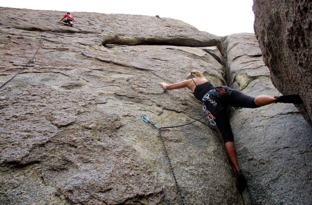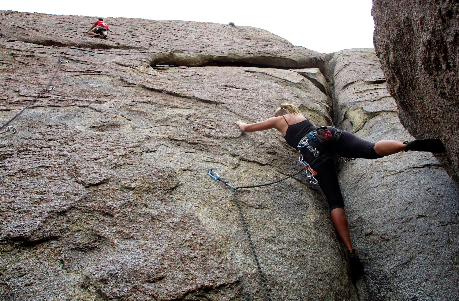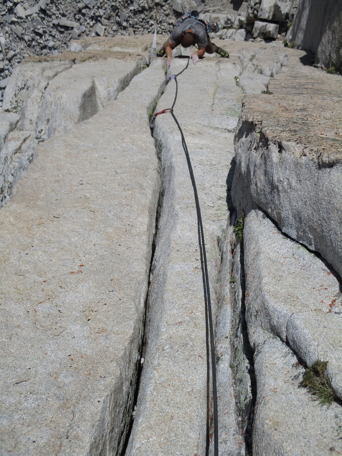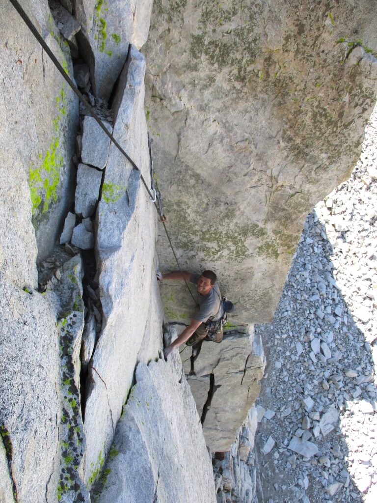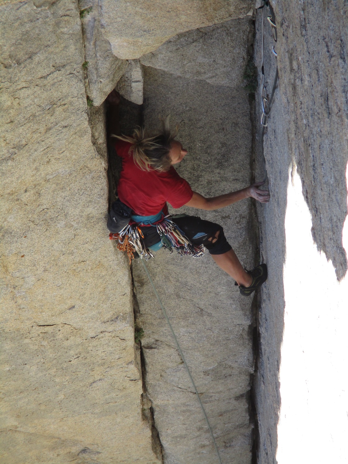 The Main Line (5.10b, 10p, 1200') on Tai Tower. With fixed ropes in place and located just outside the entrance to Pine Creek Canyon only minutes from the parking lot, it seemed like the ideal warm-up.