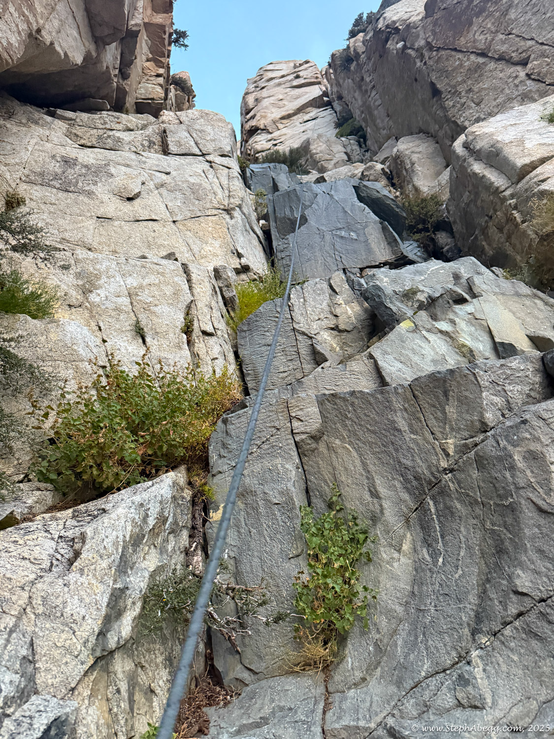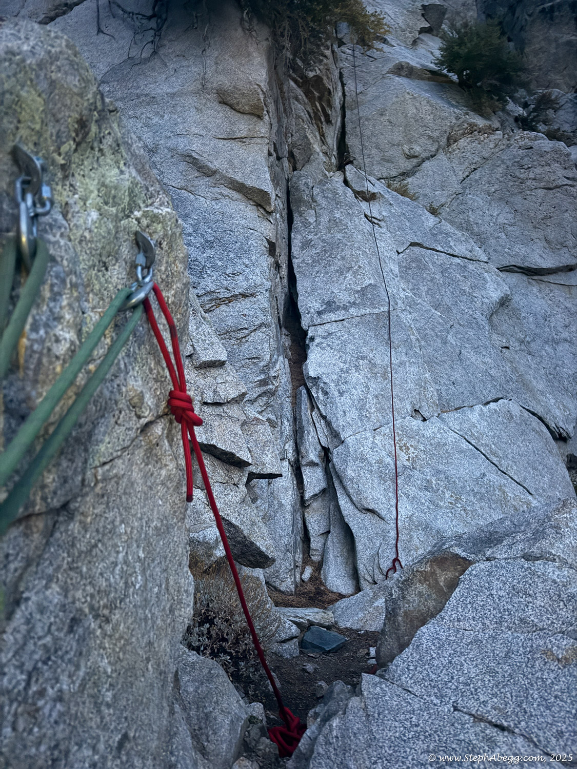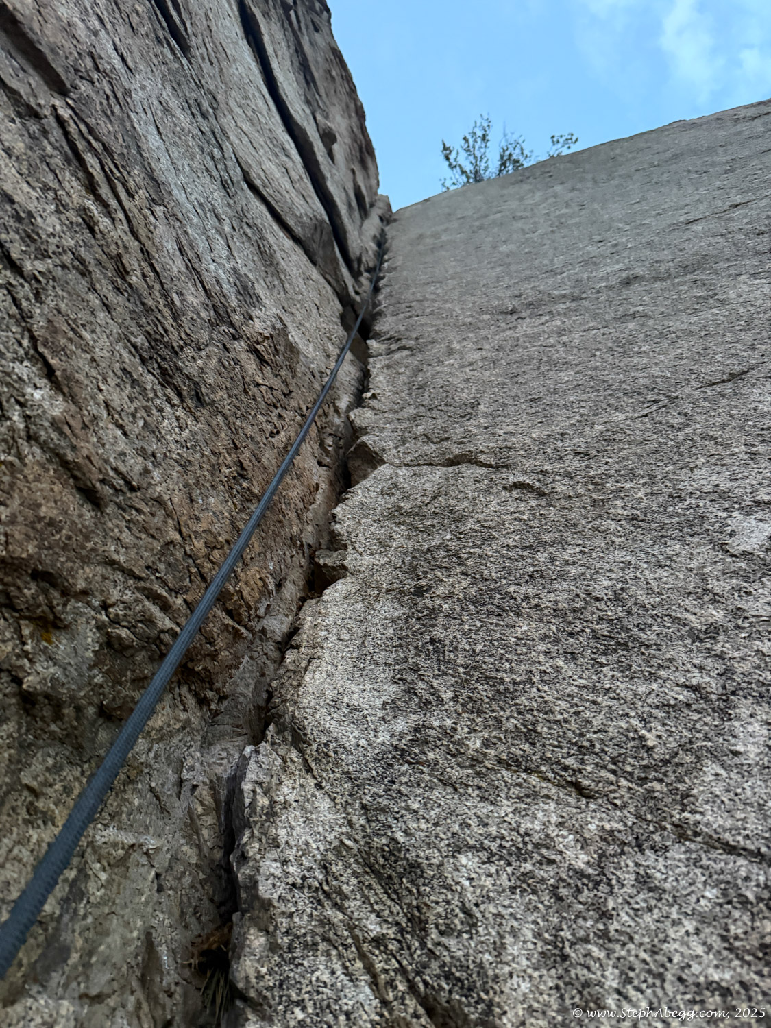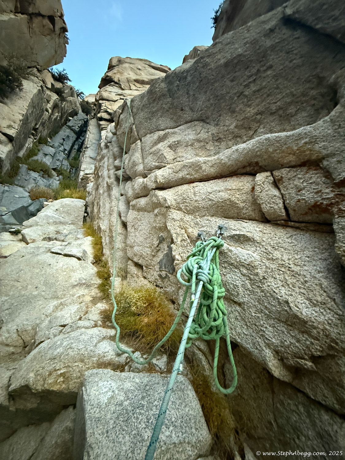 On the first day (August 24), I was meeting Brett for a pre-storm morning of cragging in Pine Creek. I’d heard about a 10-pitch route with fixed ropes—perfect for toprope soloing—called