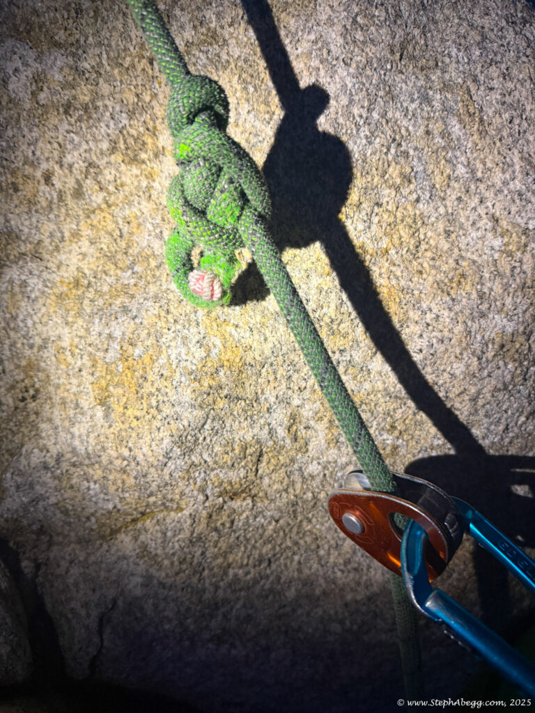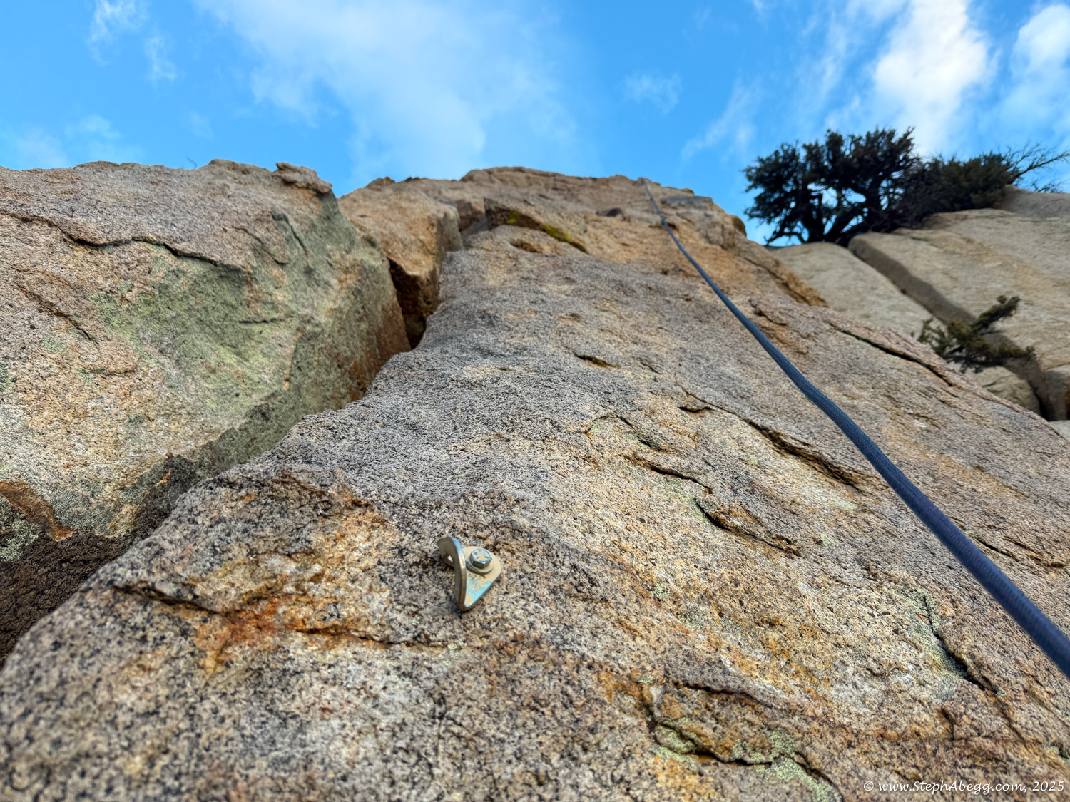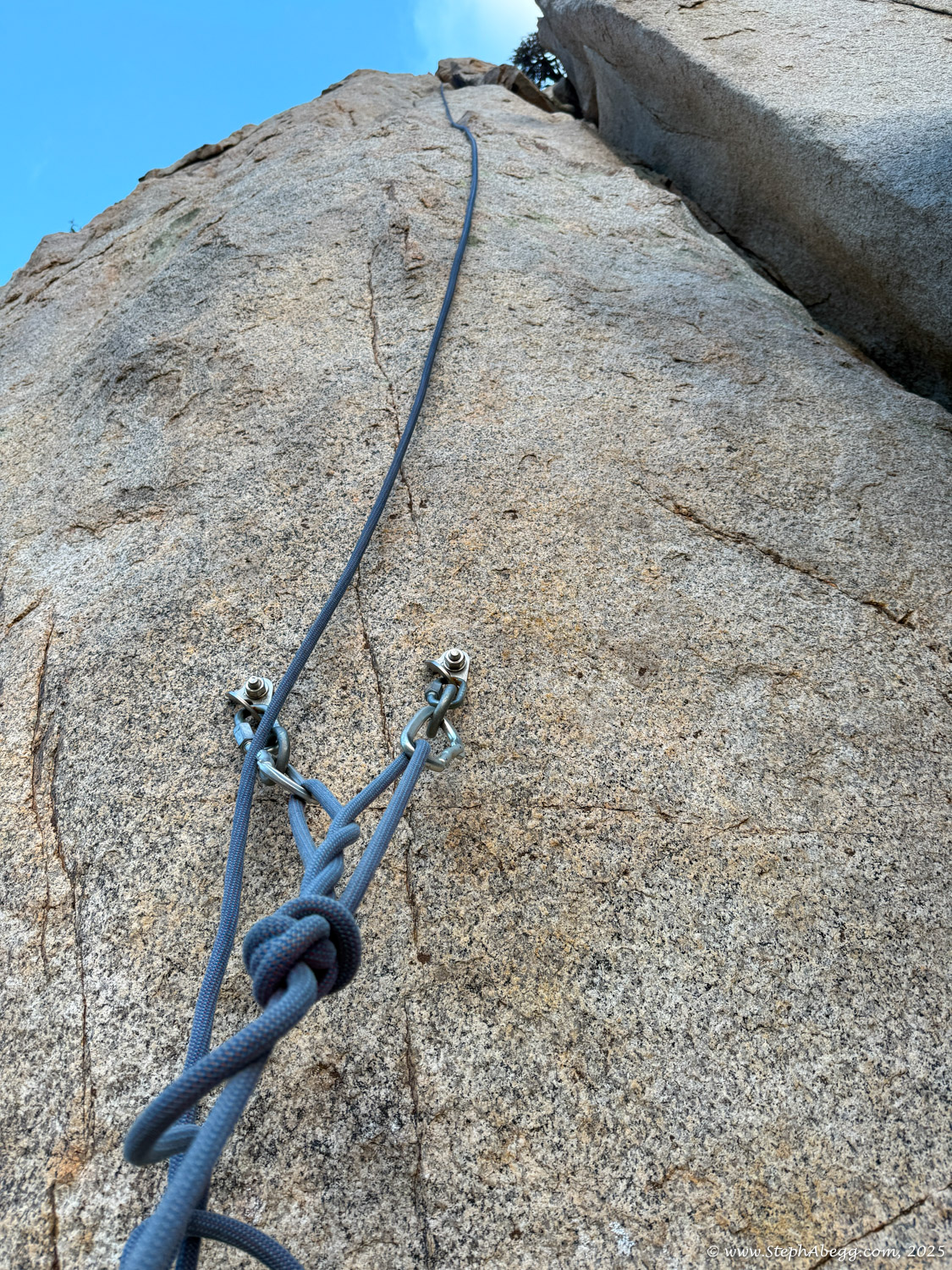 I skipped morning coffee and set off early to climb it. Each pitch is about 35m with bolted belays. From the base to the top took me just under 54 minutes, plus a 6-minute approach and 16 minutes for the rappels. Car-to-car, it was about an hour and a half, which left me a comfortable half-hour before Brett showed up.