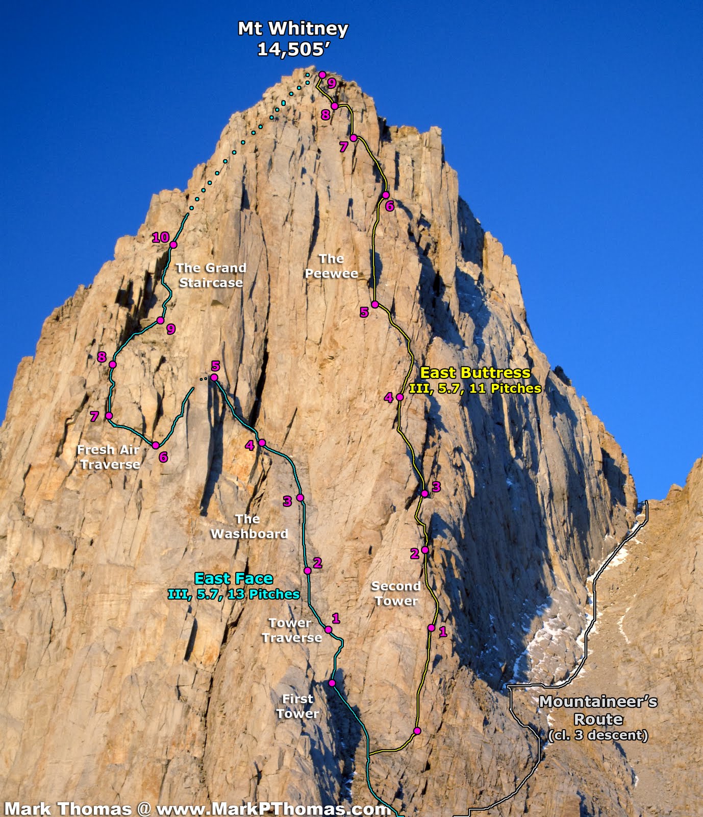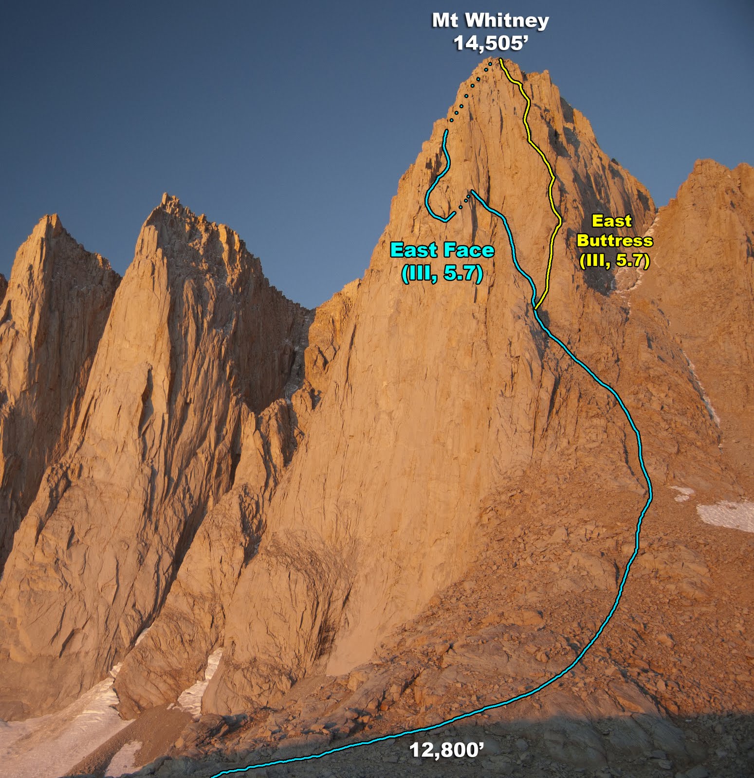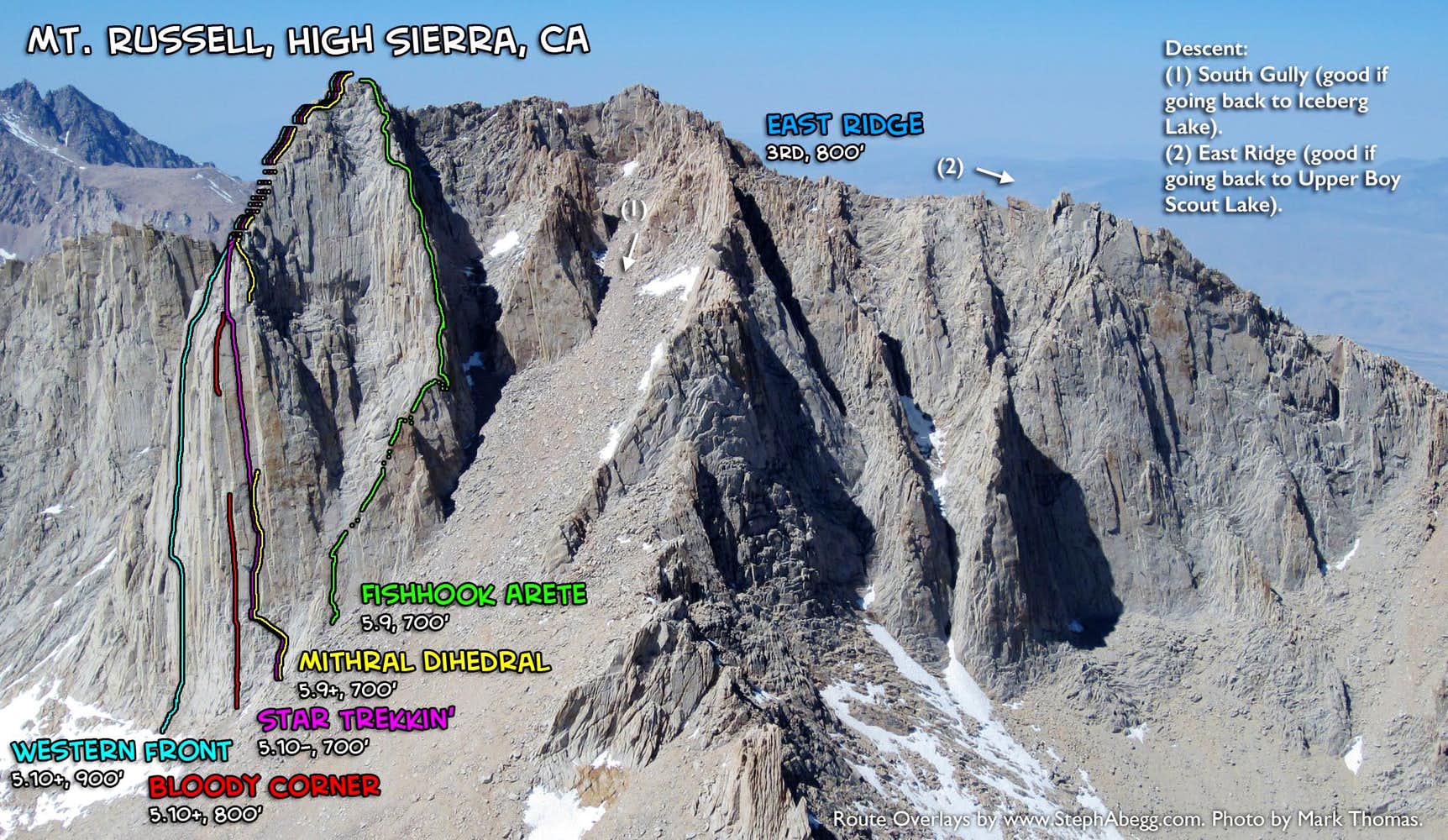 First two overlays are by my friend and King-of-the-Route-Overlay Mark Thomas — why reinvent the wheel when a friend has already done as good a job as possible. Mark's trip report for the East Face.