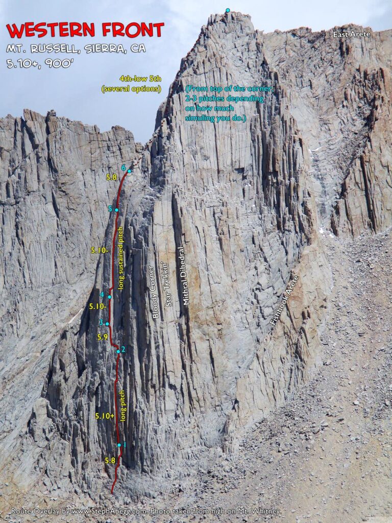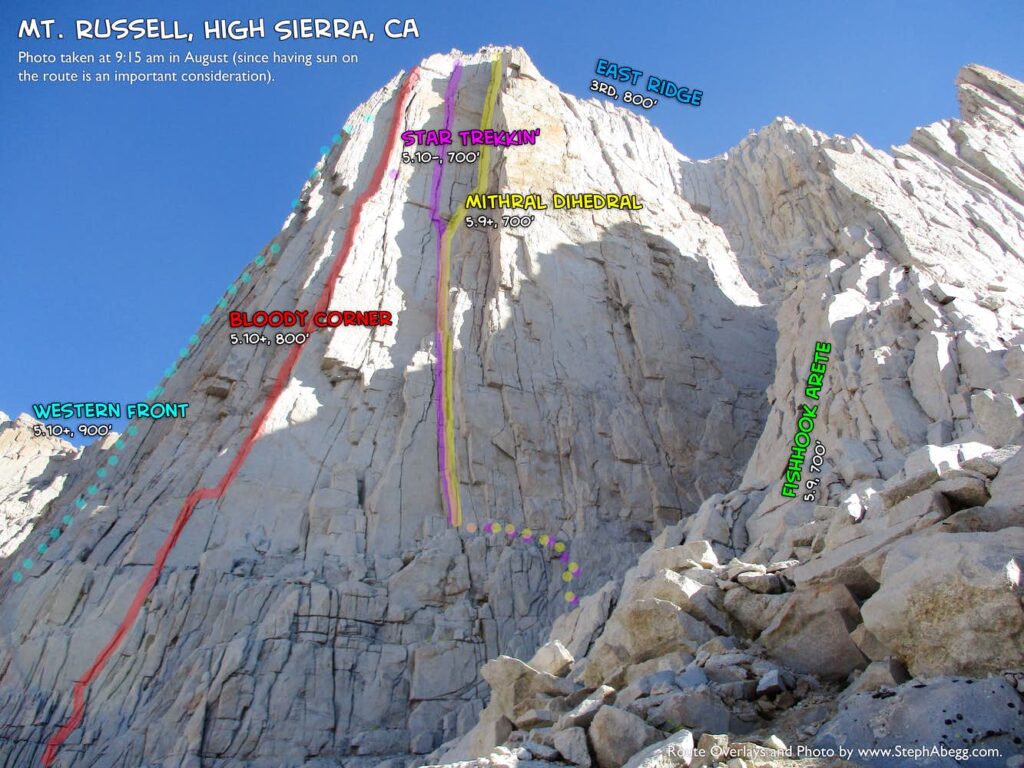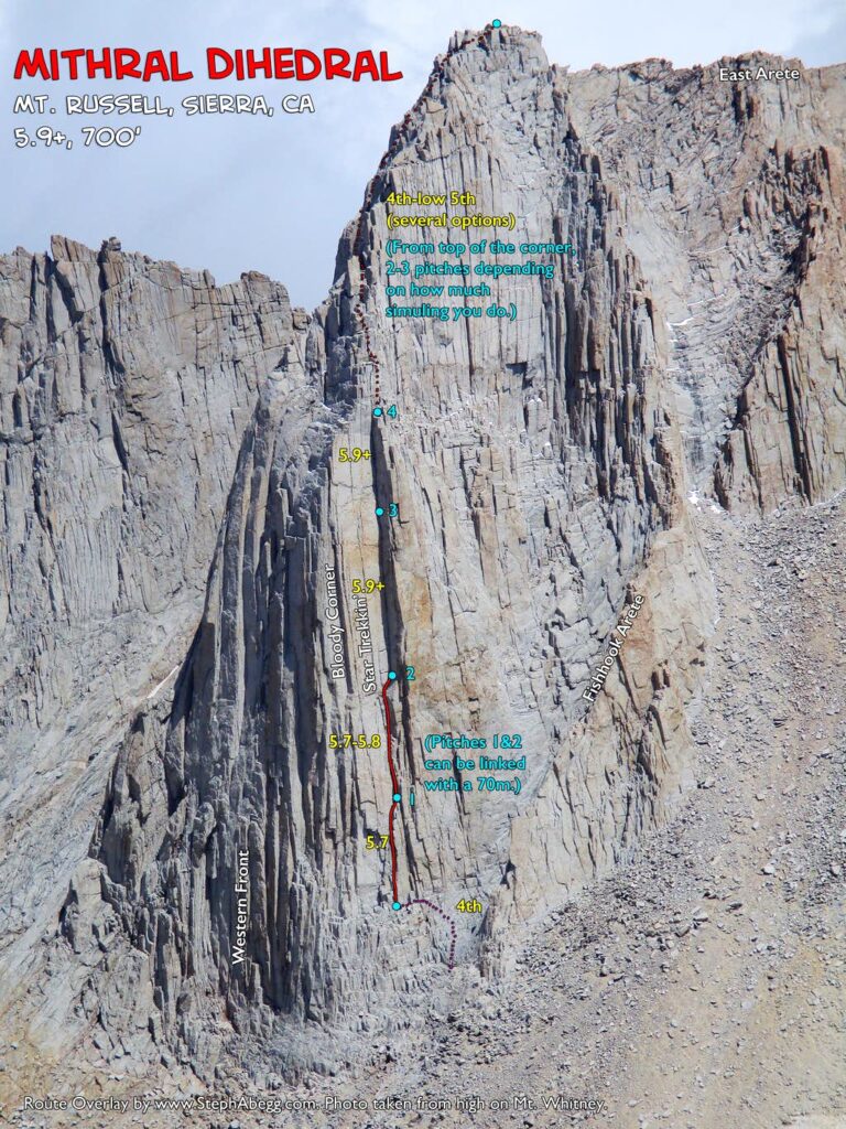 Spelled "Mithral" by Croft/SuperTopo and "Mithril" by mountainproject, this route climbs the obvious 250-ft left-facing dihedral on the southwest face of Mt. Russell. This is one of the more striking corners in the entire High Sierra. The climbing in the corner is sustained and vertical, rated somewhere between 5.9 to 5.10a to 5.9+ depending on the source. 5.9+ seems like a good it-might-be-5.9-but-it's-probably-gonna-feel-like-5.10 rating. The two pitches getting to the corner and the last half of the route to the summit are easier climbing, yet still challenging and high quality. The views are spectacular the whole way up.
