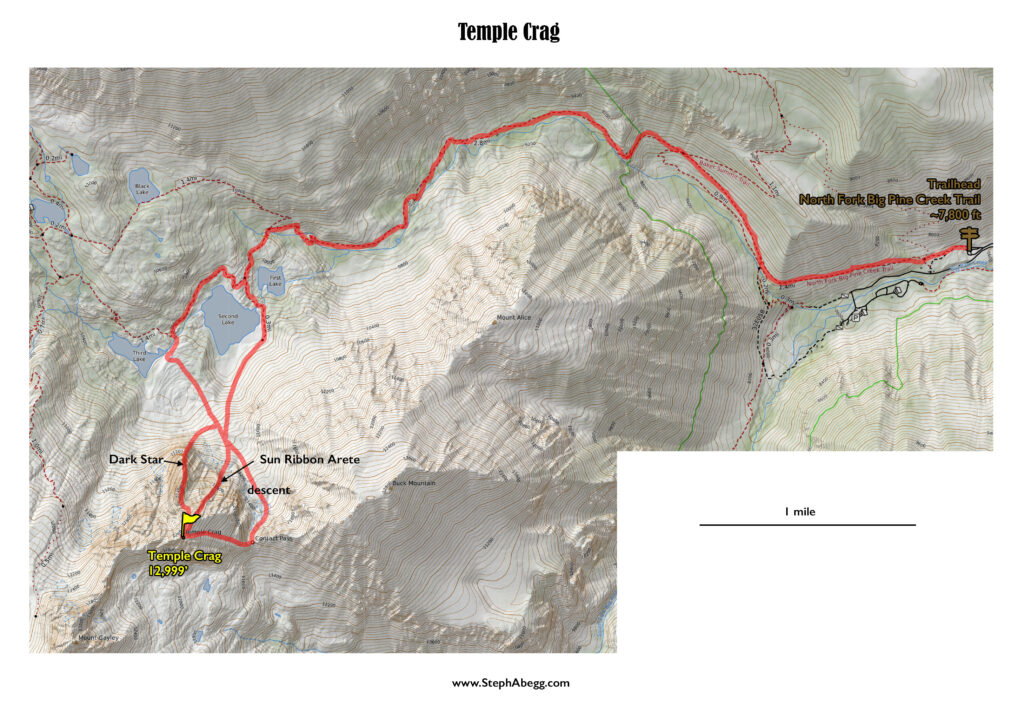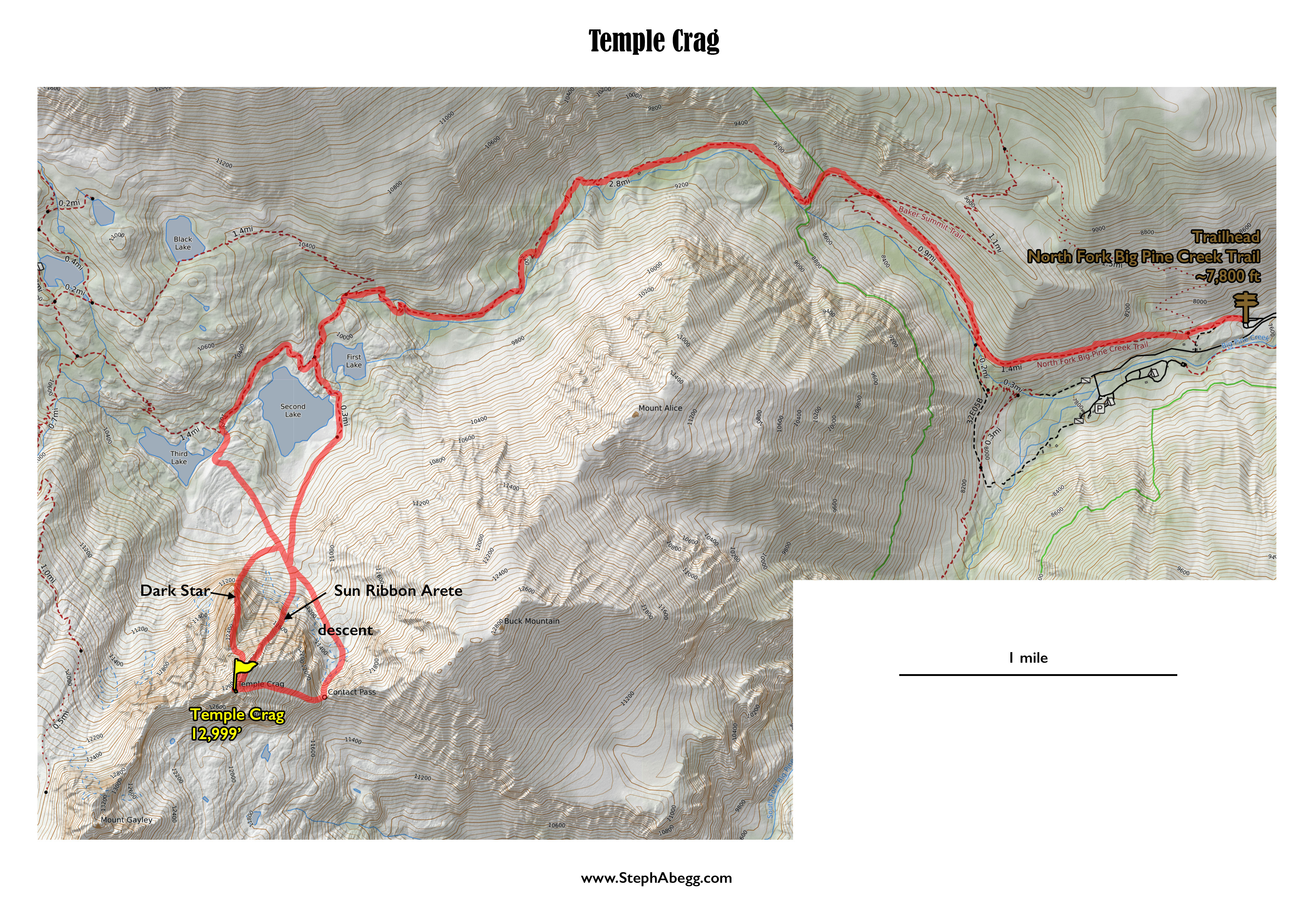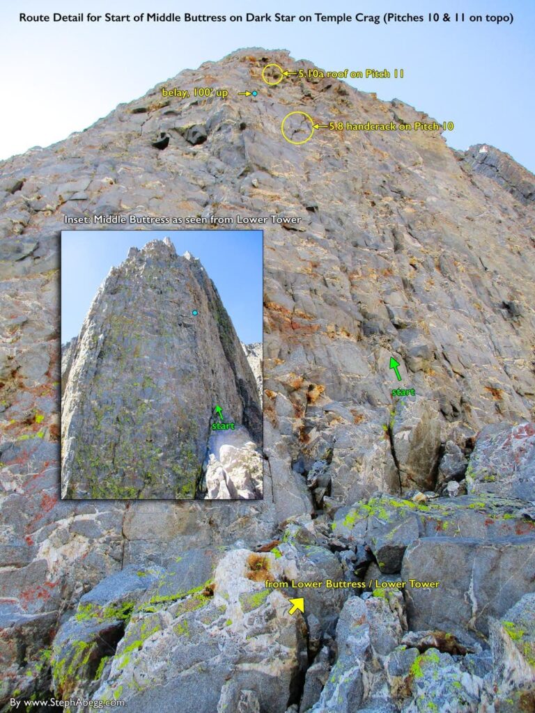 Photo descriptions: a. Approaching Dark Star at dawn. There are excellent bivy sites right where I am taking the photo, but water is 10 minutes away in either direction (water at the base of the route or water at Third Lake). b. There was running water at the base of the route, coming down above the snowfield. Running water might not be there in late season. c. Soloing the 500 feet to the standard start of the route. This is mostly 4th class terrain with a few 5th class moves and some 3rd class as well. There are several ways to go. d. Looking up Pitches 1 and 2 (easily linked into one stellar pitch up a continuous corner) from the base. With the morning sun just hitting the route, the temps were perfect for sending the 10b and 10c cruxes of the climb. e. Looking up Pitch 1. Great climbing. f. Looking up Pitch 2, which we linked with Pitch 1. More great climbing up the corner. g. An old unnecessary bolt near the top of Pitch 2. h. Pitch 3 starts off by traversing left about 40 feet on a cool ledge. i. A piton on the traverse at the start of Pitch 3. j. The beautiful 10a finger crack on the second half of Pitch 3. Photo by Dow Williams. k. There are beautiful quartz crystals all over Dark Star. Mentos for scale. l. Shadow belaying. m. Shadow climbing. n. Climbing on Pitches 4 and 5, which we linked into a 310 ft pitch (about 80 feet of simulclimbing with our 70m rope). Pitch 4 is 5.7 juggy face climbing. Pitch 5 has a 5.8 roof and easier 5th class climbing. o. Looking up into the chimney of Pitch 6. You can belay inside the chimney if it's a hot day. Belay lower if it's a cool day since it's a bit chilly inside the chimney. p. Taken while leading the 5.8 chimney of Pitch 6. This was a fun pitch. The crux for me was dealing with my pack. I just dangled it below me, which worked well. q. Looking down from a comfy belay ledge at the top of Pitch 6. The second half of Pitch 6 involves blocky 5th class climbing. r. Dow leading off Pitch 8, which follows 5.8 cracks up through black rock. s. After Pitch 8, the last 300 (vertical) feet is pretty easy 4th class, so we unroped and soloed it quickly. t. At the top of the Lower Buttress! Not even 10:30 am yet. The Lower Tower is behind Dow in the photo. |