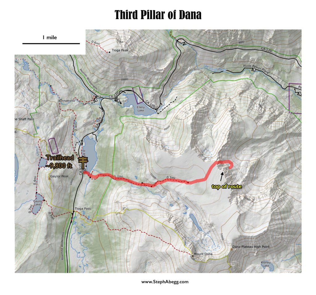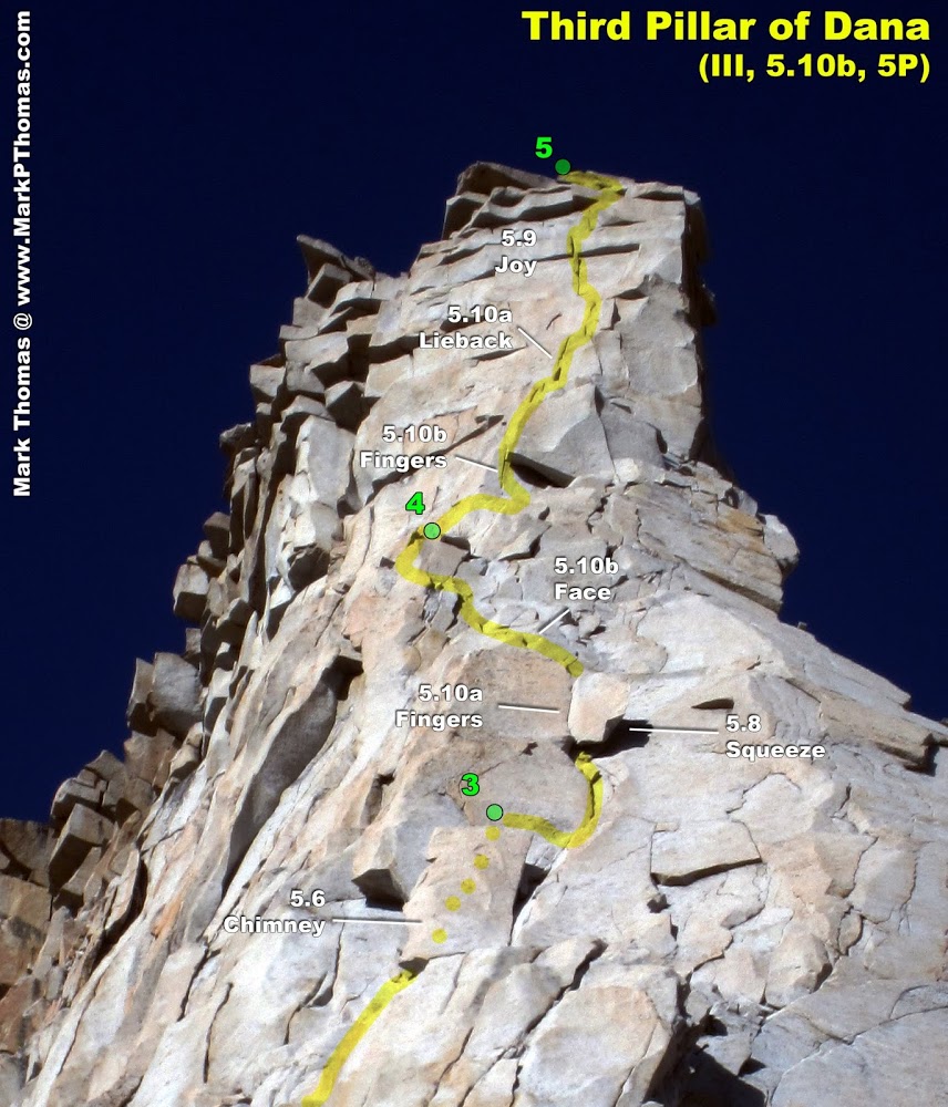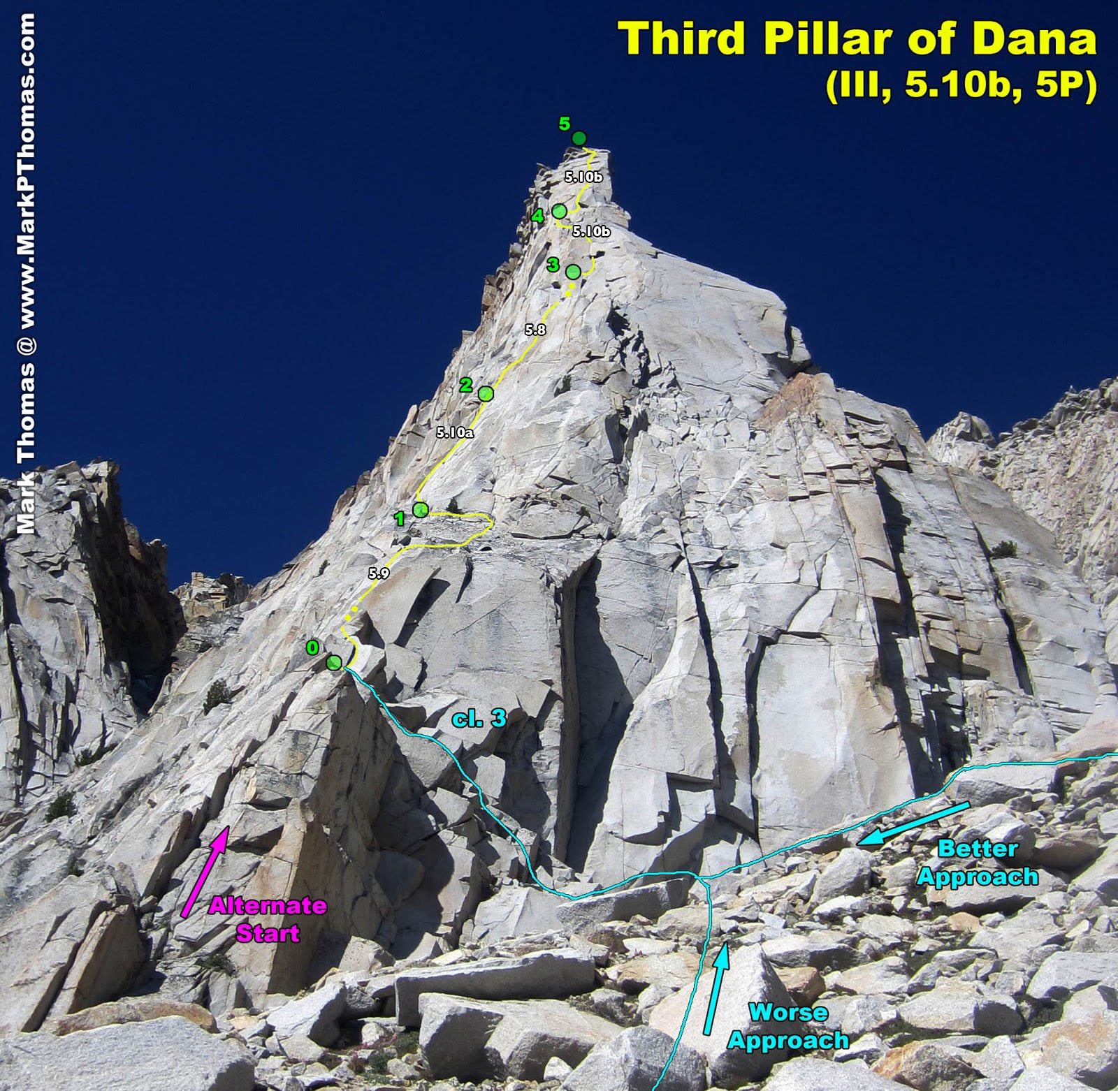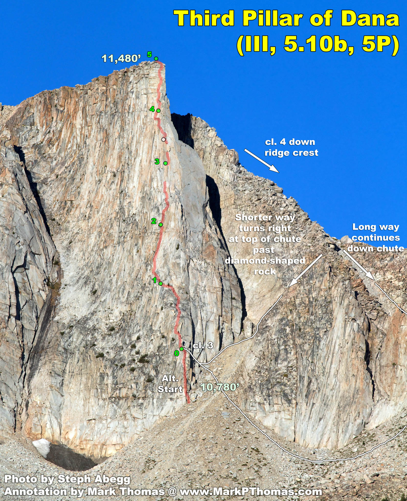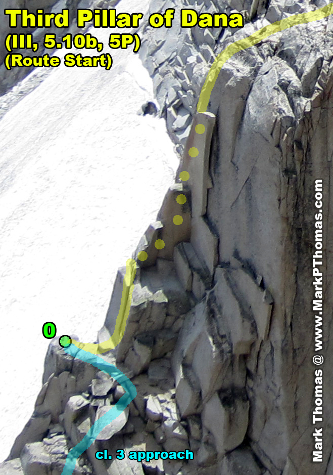 | Approach | From the Tioga Lake Overlook, drop down and skirt the right (west) end of the lake and follow a climbers' track up to the Dana Plateau and to the eastern edge of the plateau, looking for a slight promontory that marks the top of the route. Scramble down the 3rd class ledge to its left (north) to the toe of the buttress. Cross the gully (snow in early season) and climb out onto the highest ledge. | 1. From SuperTopo guide: "The striking prow of the Third Pillar of Dana will be visible 100 yards before you reach the dramatic edge of the plateau, and the top of the descent buttress is immediately to the west of the Third Pillar." 2. The stacked rocks on the left are where you descend. Photo/annotation by Mark Thomas. 3-5. From SuperTopo guide: "Descend the buttress via low-angle 3rd class terrain; generally stay to the left, or 4th class drops must be negotiated. Cross the gully (snow in early season) to prominent ledges about 150 feet above the bottom of the rock on the Third Pillar." Photo 4 shows the obvious paddle/arrowhead/flask-shaped block that marks where you turn right and descend towards the snowless snow field. 6. Sarah approaching the base of the route. 2015 was a dry year so there was not even a patch of residual snow. The normal start of the route is on the ridgecrest at the end of the 3rd class ramp and about 15 feet below the giant flake. (There is a direct start that starts at the base of the Pillar about 160 feet lower; most climbers opt for the normal start, probably out of fear of getting cut off by a party opting for the normal start and because the rock quality is not quite as good at the toe of the Pillar. 7. Looking over at approach to Third Pillar of Dana from the base of the route. Even in June 2013, there was not enough snow to necessitate crampons or ice axe. |