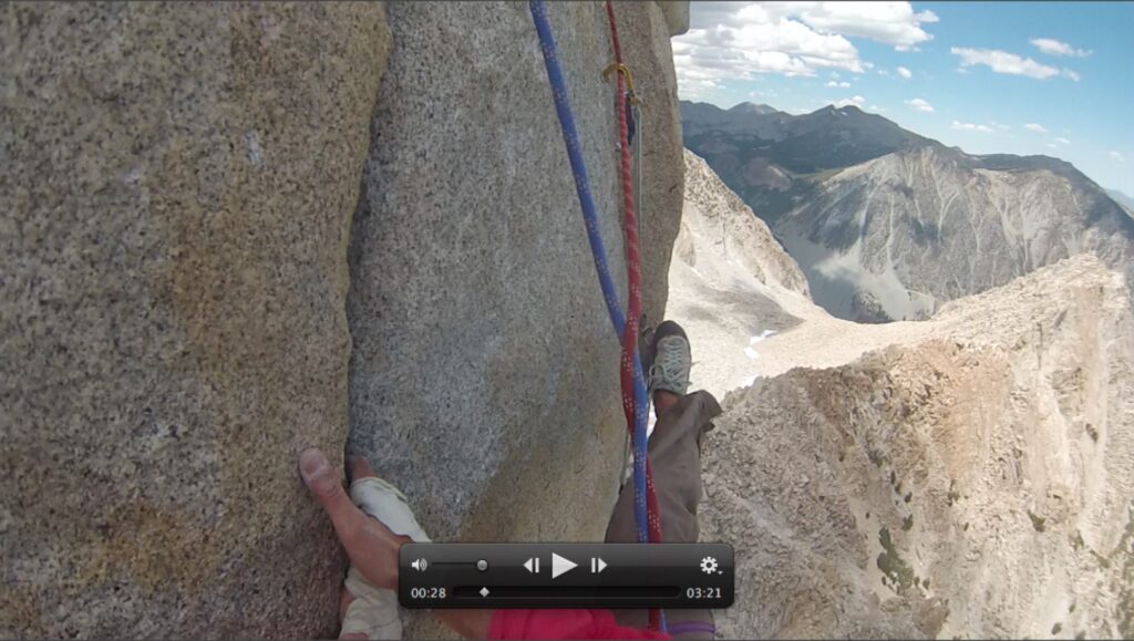 10b. Climb up through two 10b cruxes (first crux is fingers and foot smears through a roof and second crux is a techy lieback with thin gear above a ledge). Then steep and fun 5.9 climbing the top—this section has been described as "the best 5.9 pitch in the universe" (Moynier, Sierra Classics, p. 280). | 18. The first 10b crux on Pitch 5. This is fingers and smeary feet, but it can be protected well by first a black and then a green alien. 19. The second 10b crux on Pitch 5. This crux was definitely more of a mental crux for me than the first, since the gear is thin and there's a ledge right below. I was able to place two small nuts from my stance on the ledge, and a black alien half a move above the nuts, and a green alien a move above that. The green alien was bomber. 20. Looking down Pitch 5 from my belay perch at the top of the Pillar. 21. Sarah on the "best 5.9 in the universe" at the end of Pitch 5. That might be a bit of an overstatement, but it's pretty darn good climbing and quite a way to finish the route! |