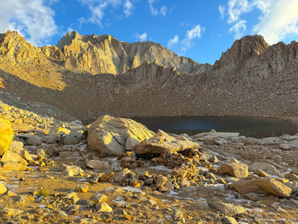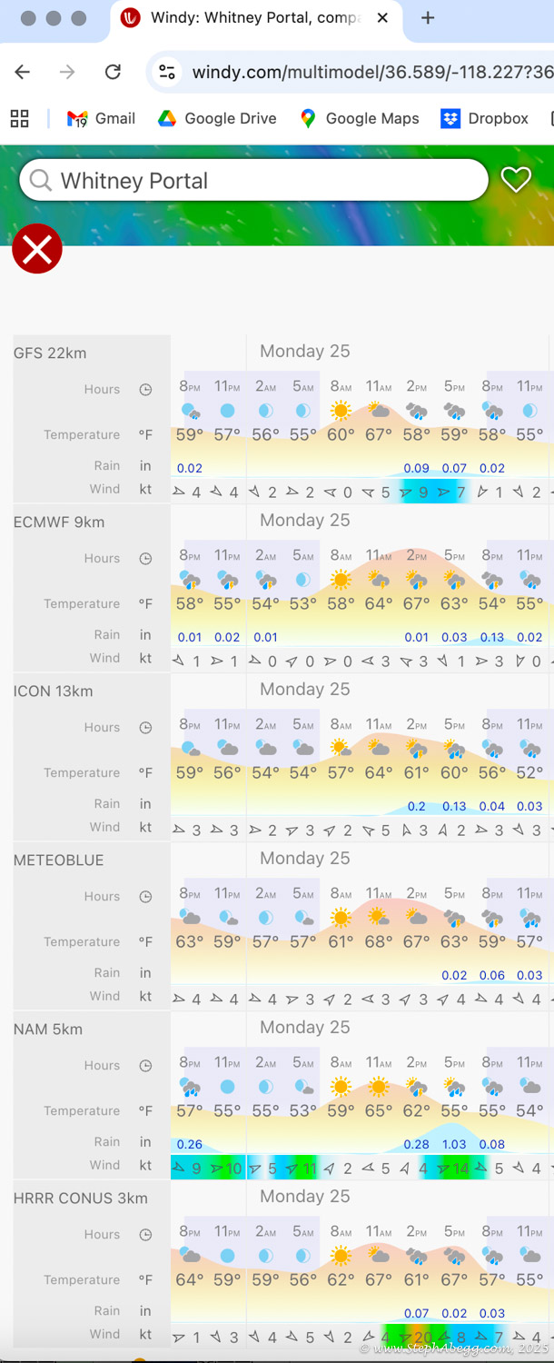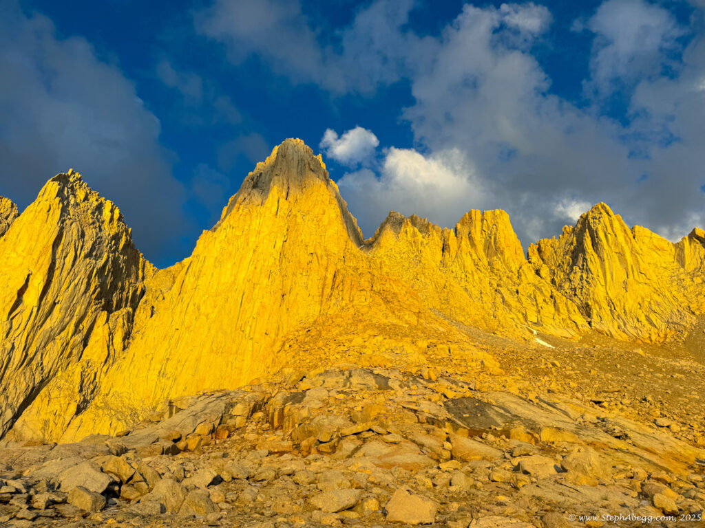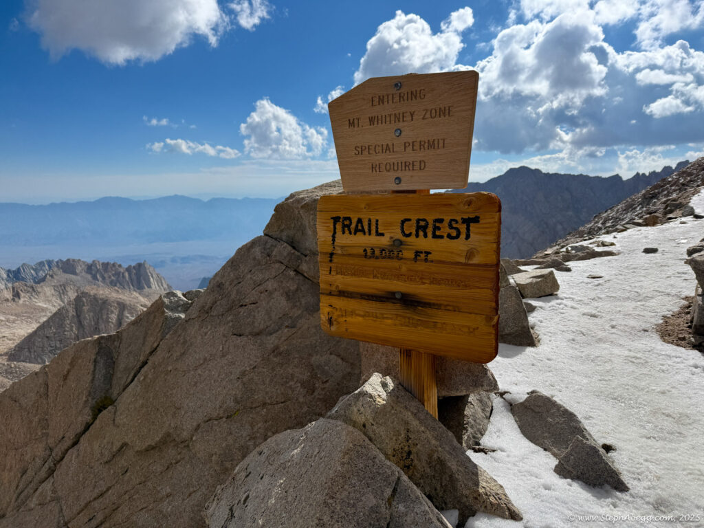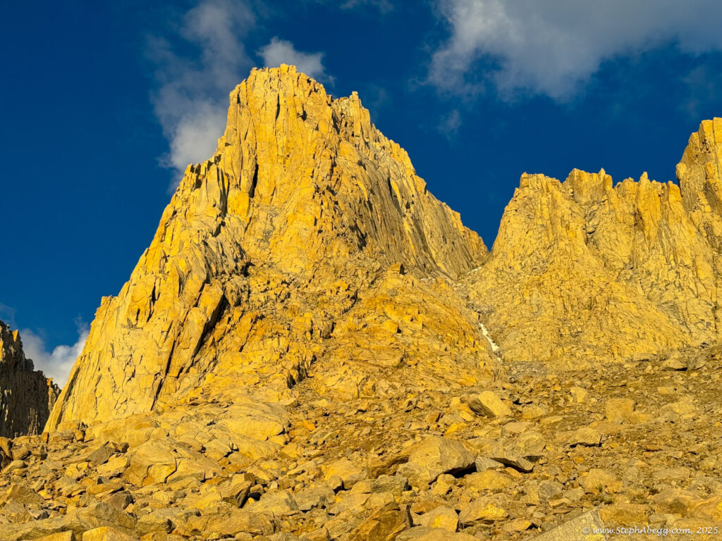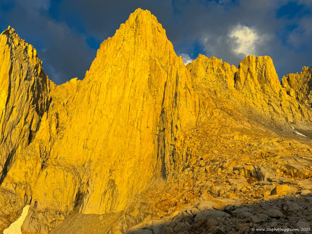At 14,505 feet, Mount Whitney stands as the highest peak in the contiguous United States. The forecast wasn’t ideal—heavy rain was expected by early afternoon—but with a morning window of decent weather, I decided it was a good day for a fitness push to the summit. My plan was: start around 4 a.m. (sunrise was 6:16 a.m., and I wanted to watch it hit Whitney and Keeler Needle), ascend via the