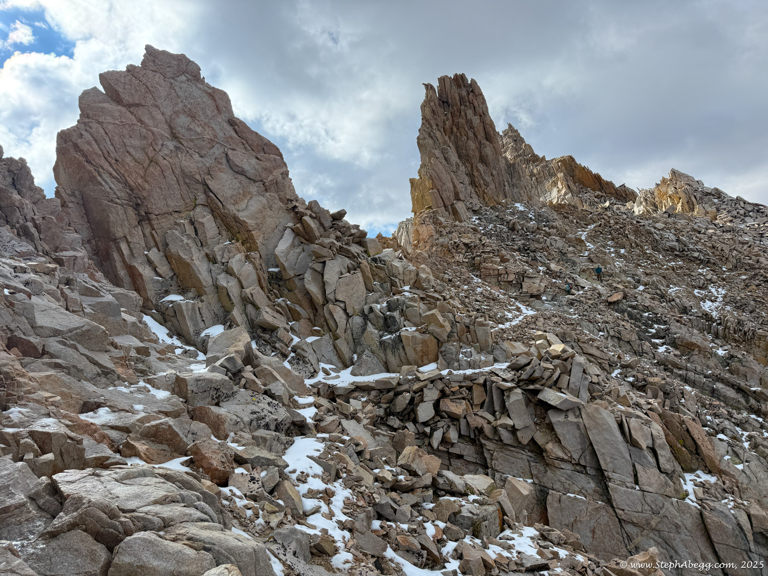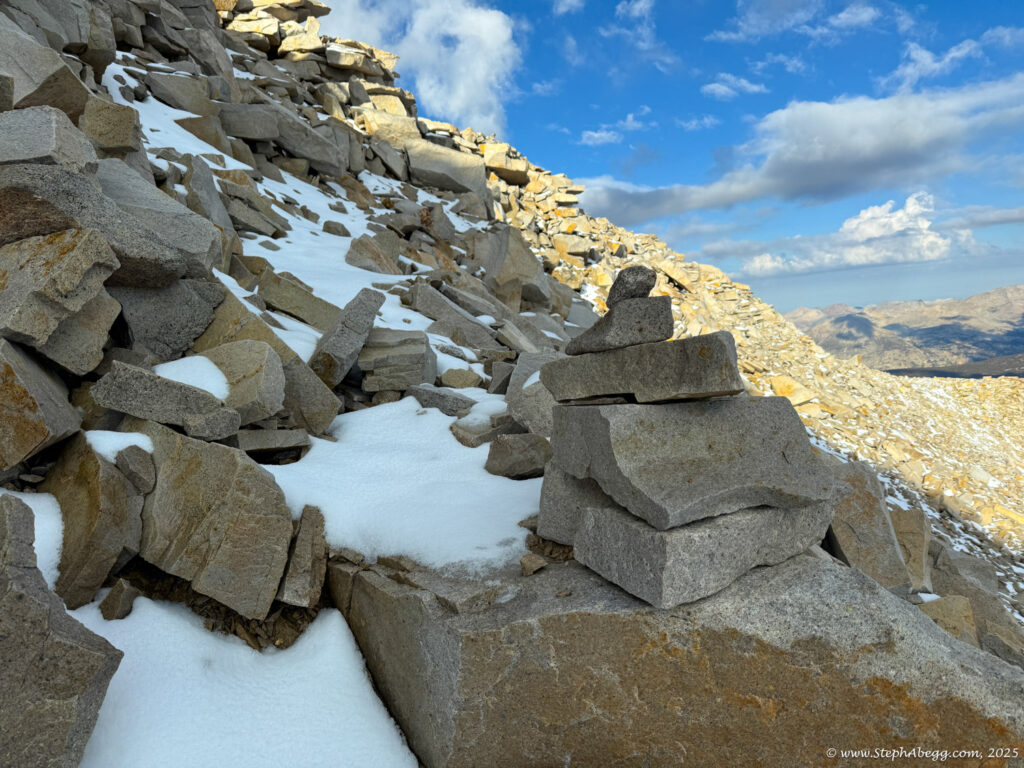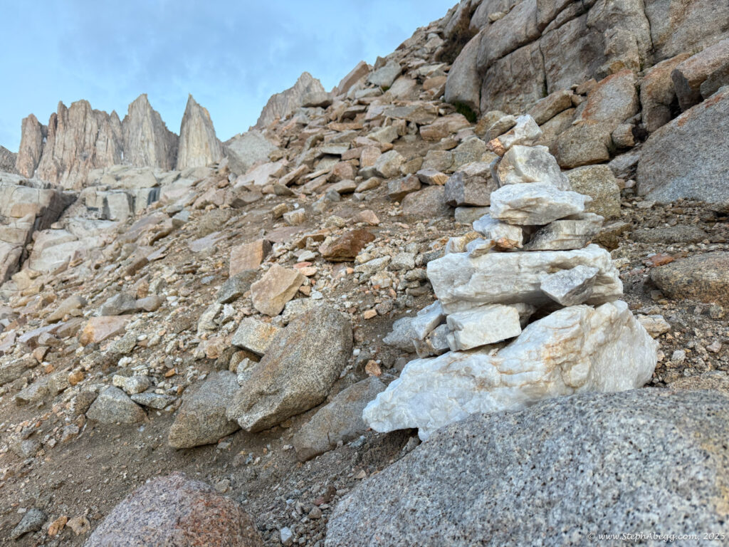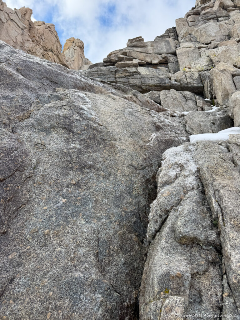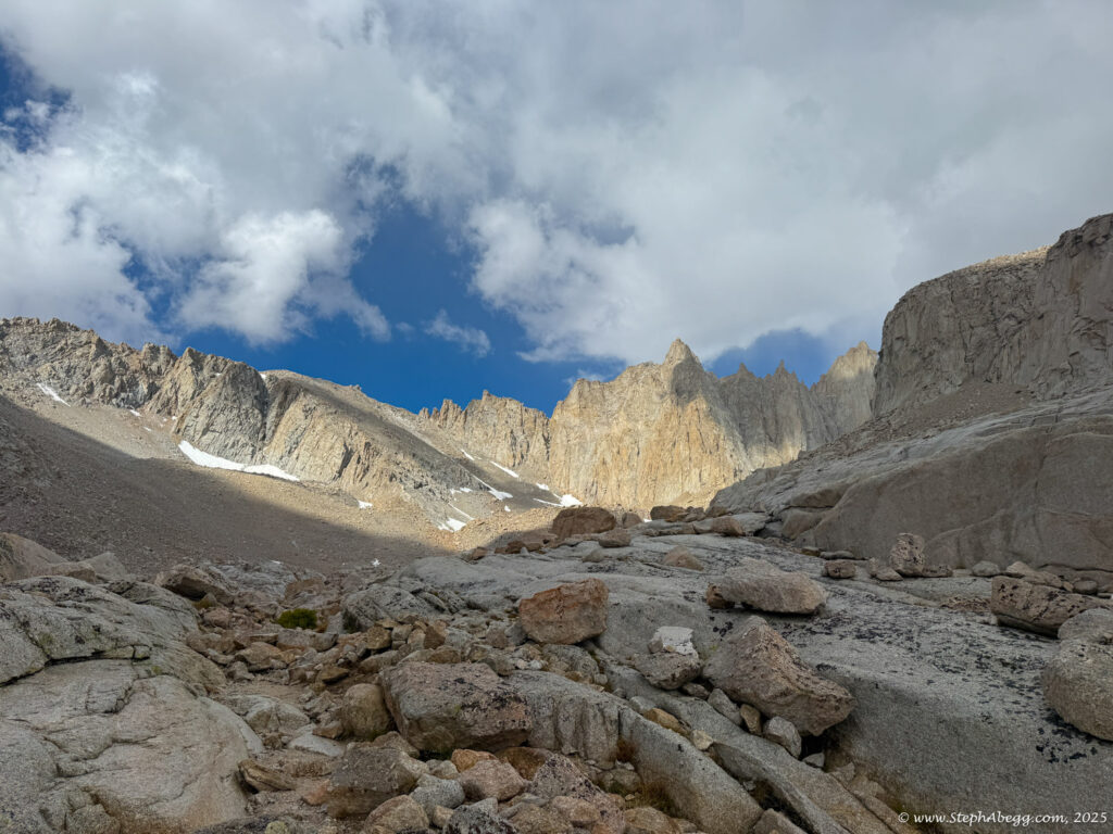 Mountaineer’s Route, descend the Whitney Trail, and hopefully be back at the trailhead by noon to watch the storm roll in from the dry comfort of my car. My total car-to-car time was 8 hours (3:59 up, 3:46 down, short summit break) so I achieved my goal.