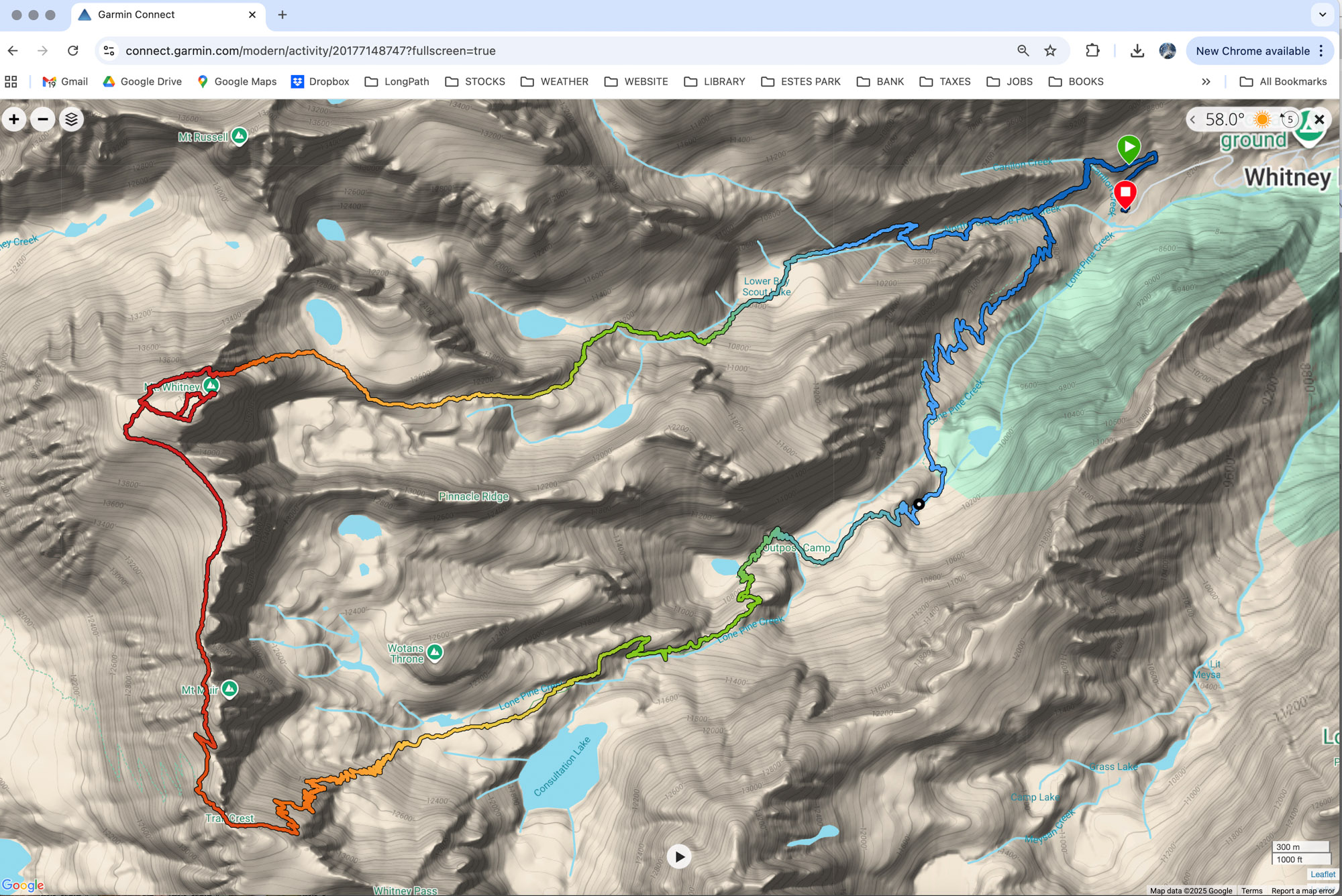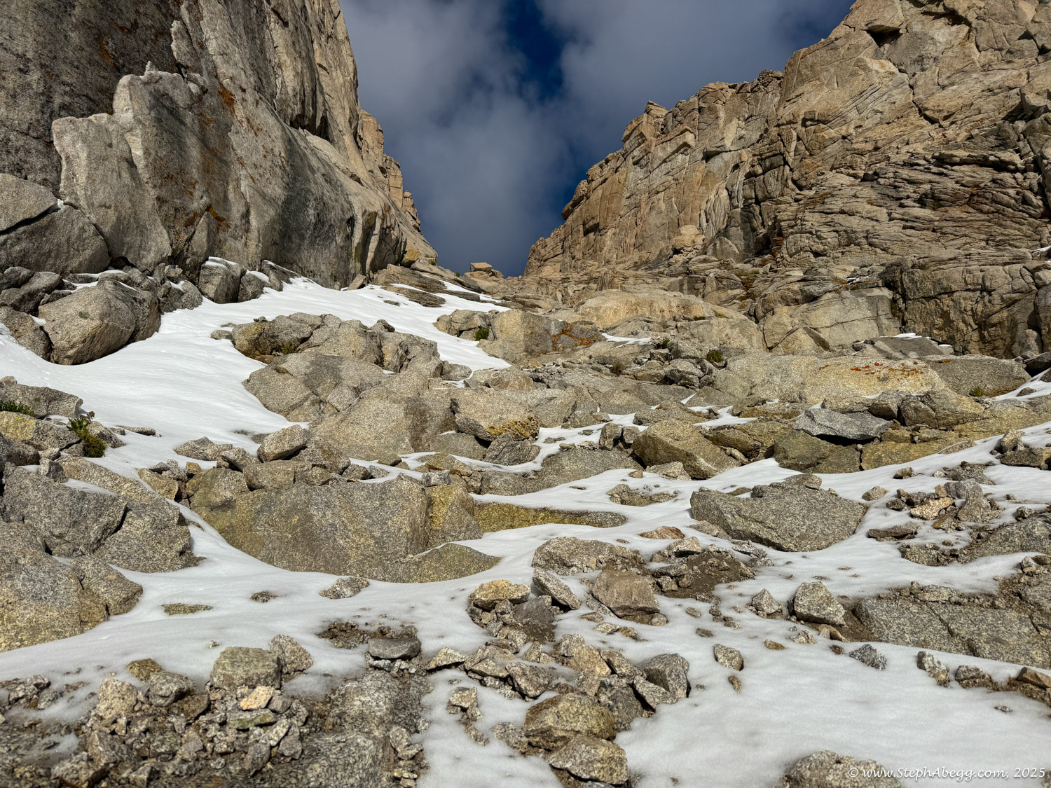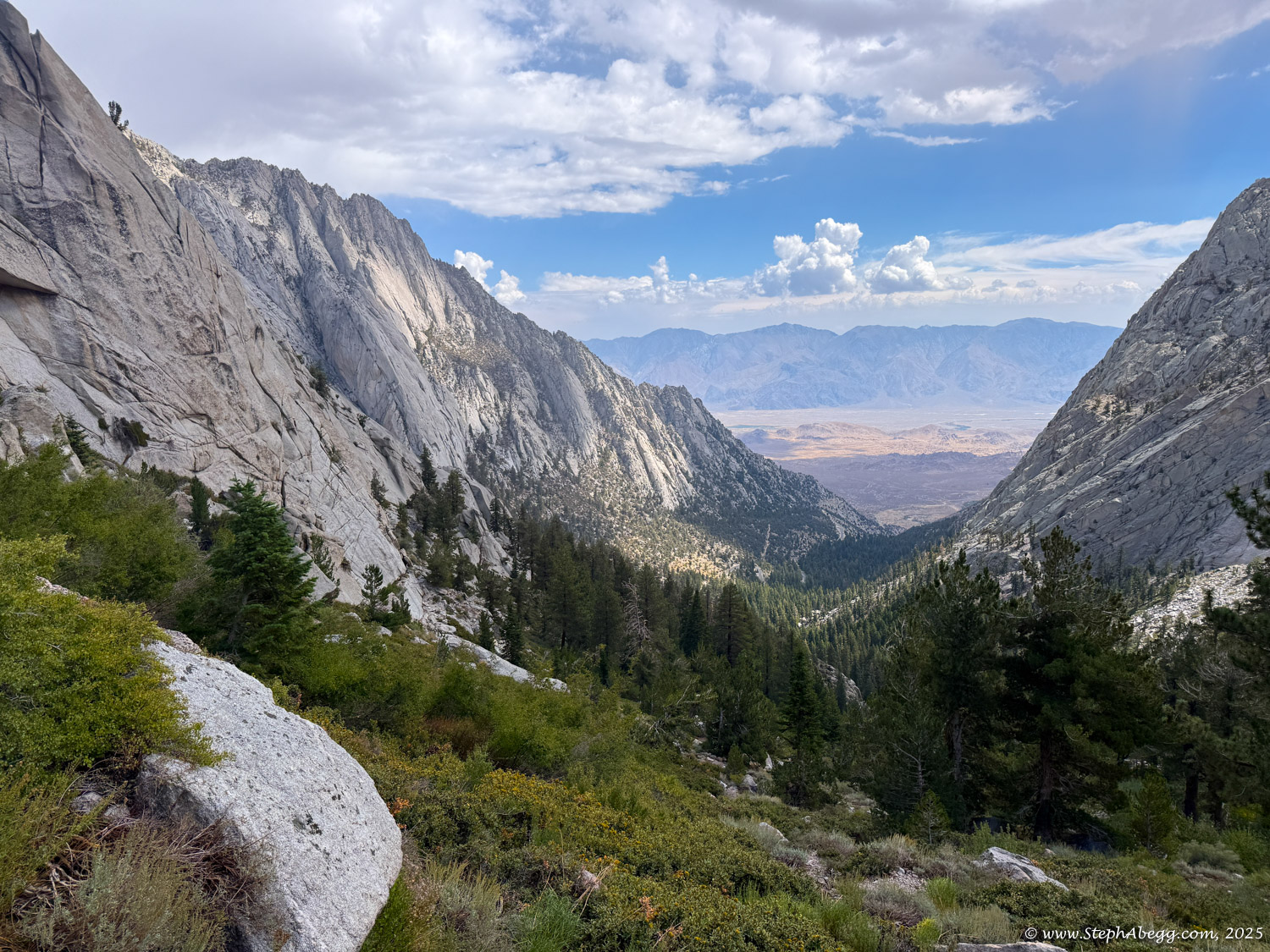 Mountaineer’s Route, descend the Whitney Trail, and hopefully be back at the trailhead by noon to watch the storm roll in from the dry comfort of my car. My total car-to-car time was 8 hours (3:59 up, 3:46 down, short summit break) so I achieved my goal.