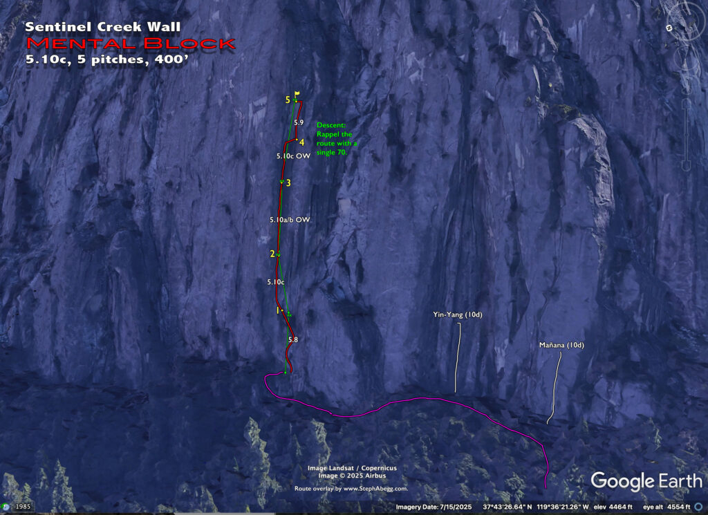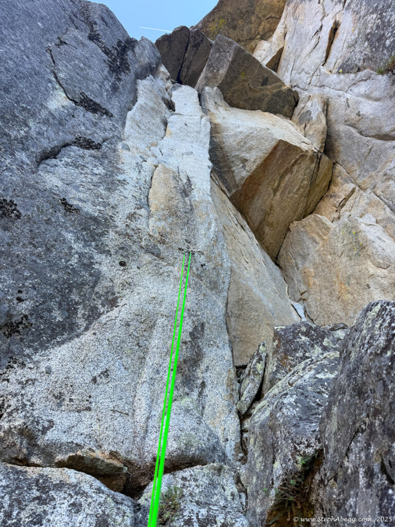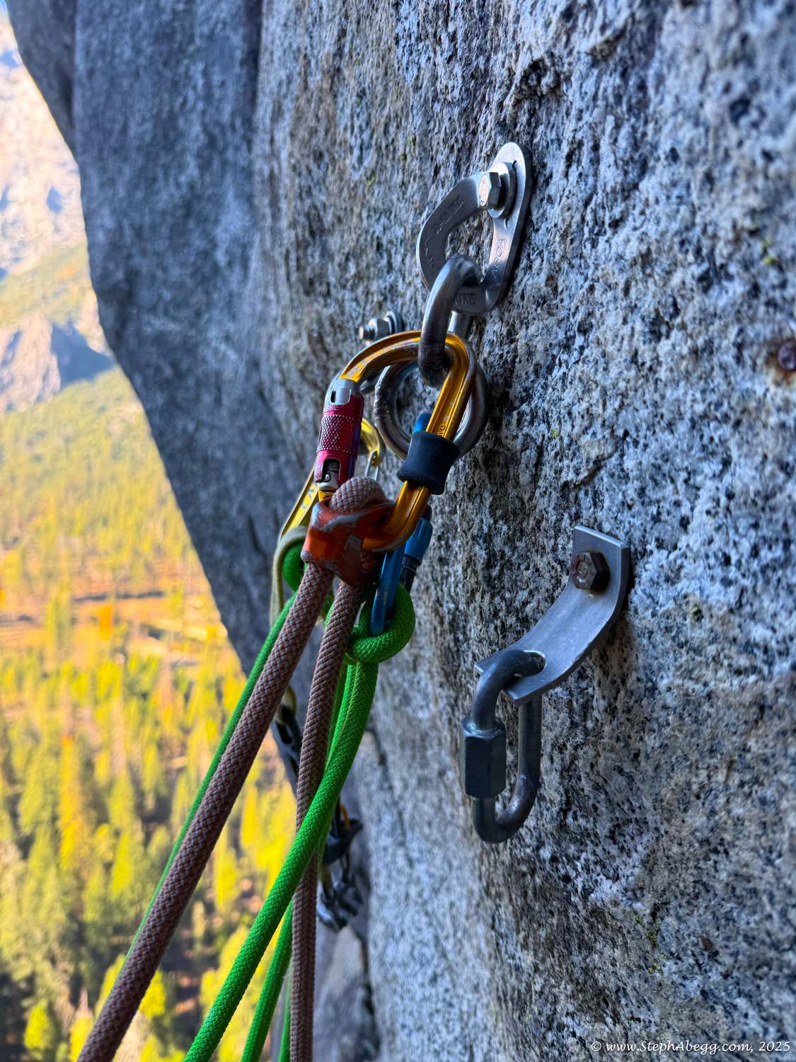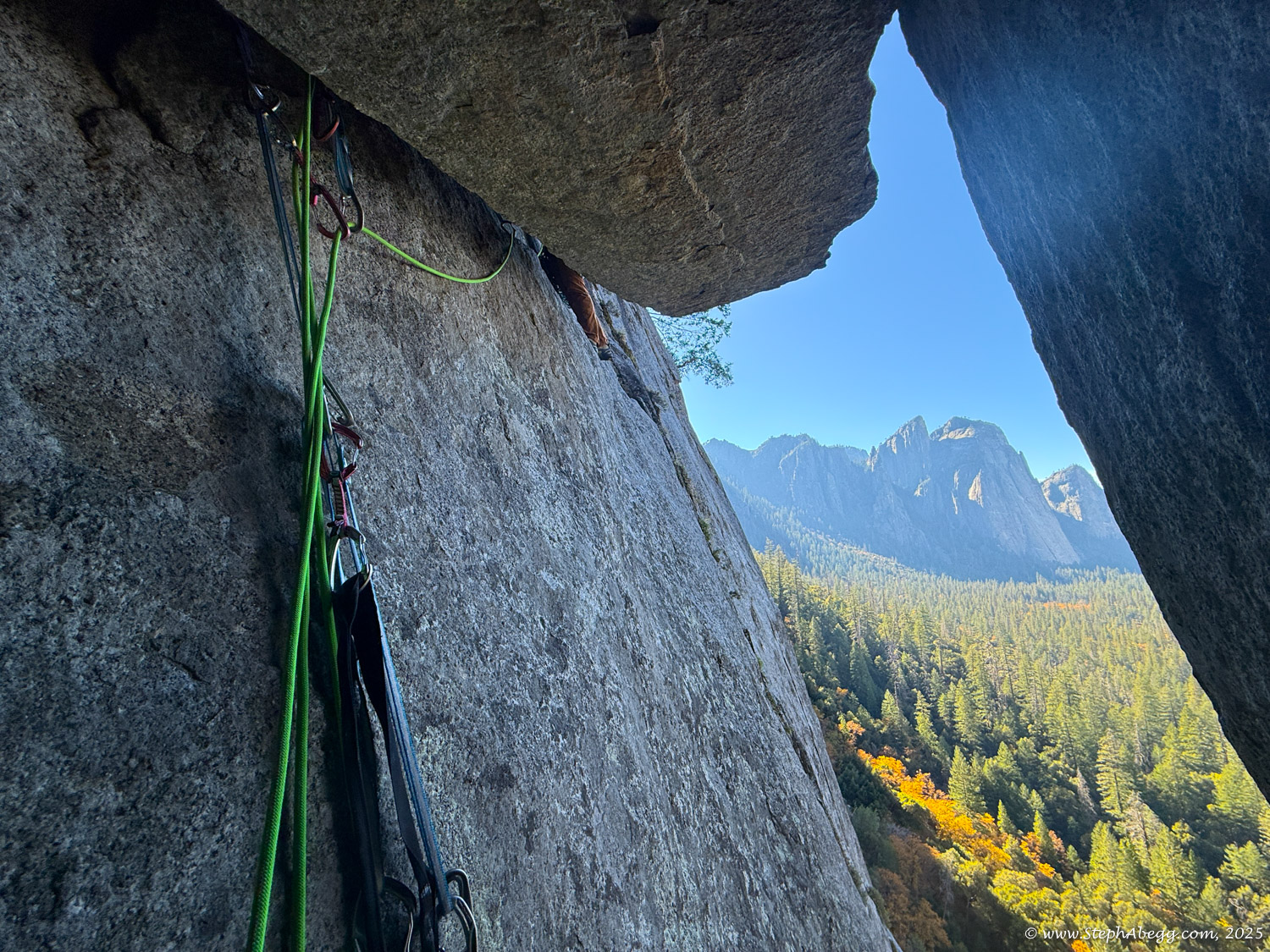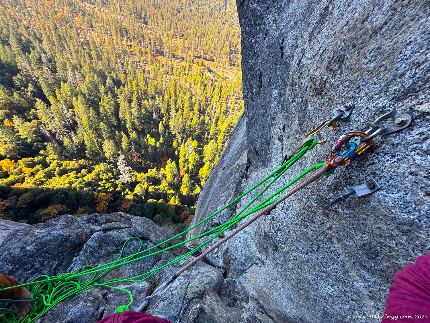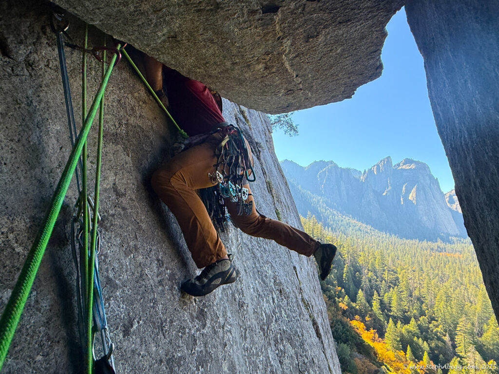 Bridalveil East (5.10c, 8p), but once I saw Bridalveil Falls and how the wind blows it around, I determined that this is not a good spring route. In the book “Yosemite Epics: Tales of Adventure from America’s Greatest Playground”, Peter Croft has