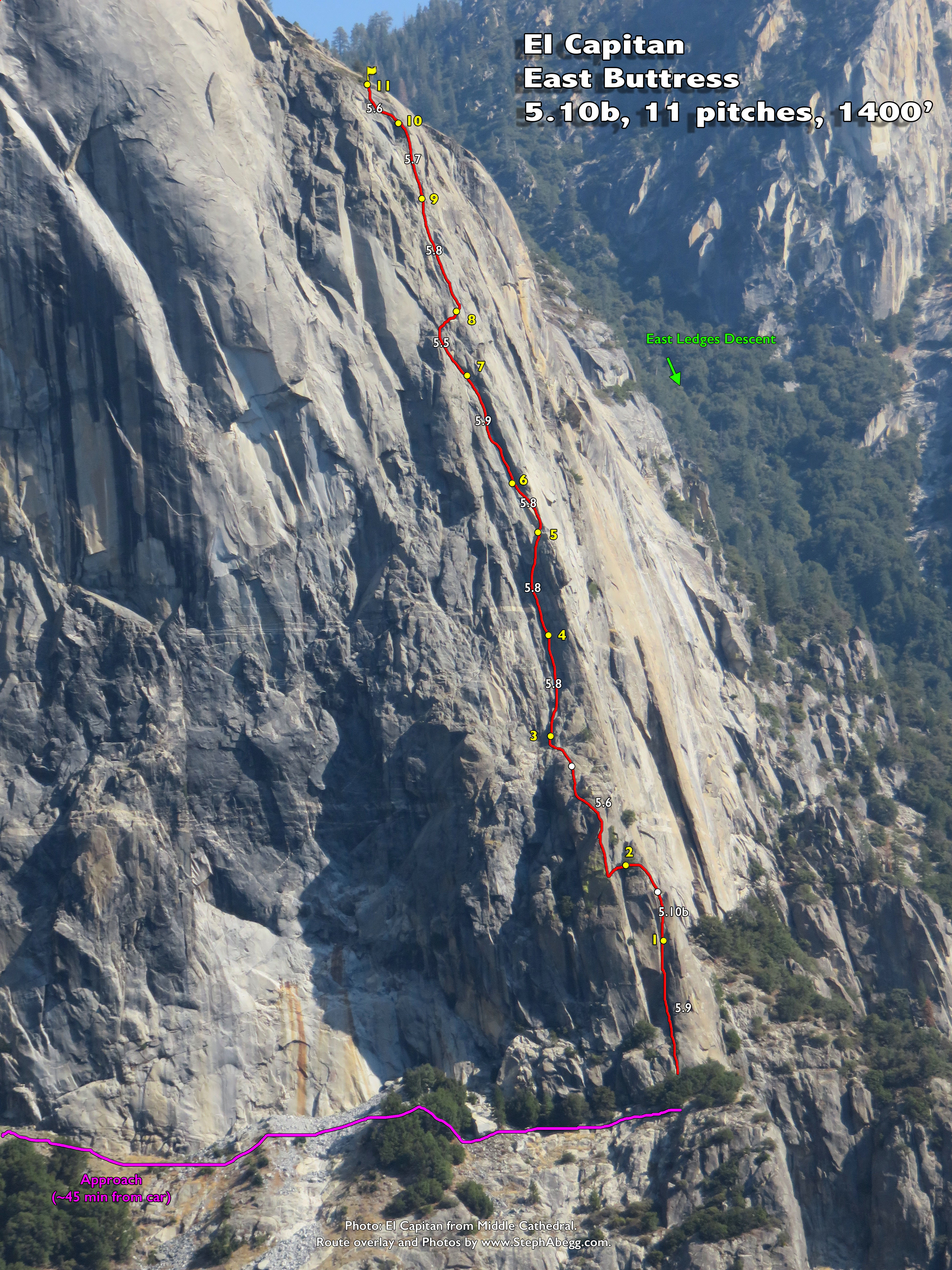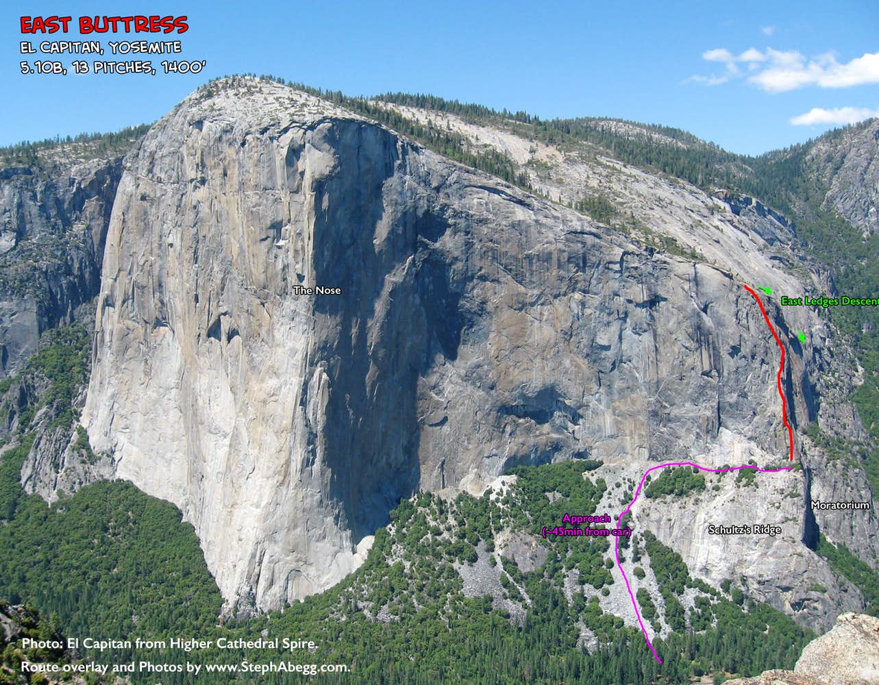 1. The climbers' path up to the base of the East Buttress is marked by a carabiner post. 2. The view of El Capitan from the base of the East Buttress. The beautiful sweeping Nose is the shade-sun line.
