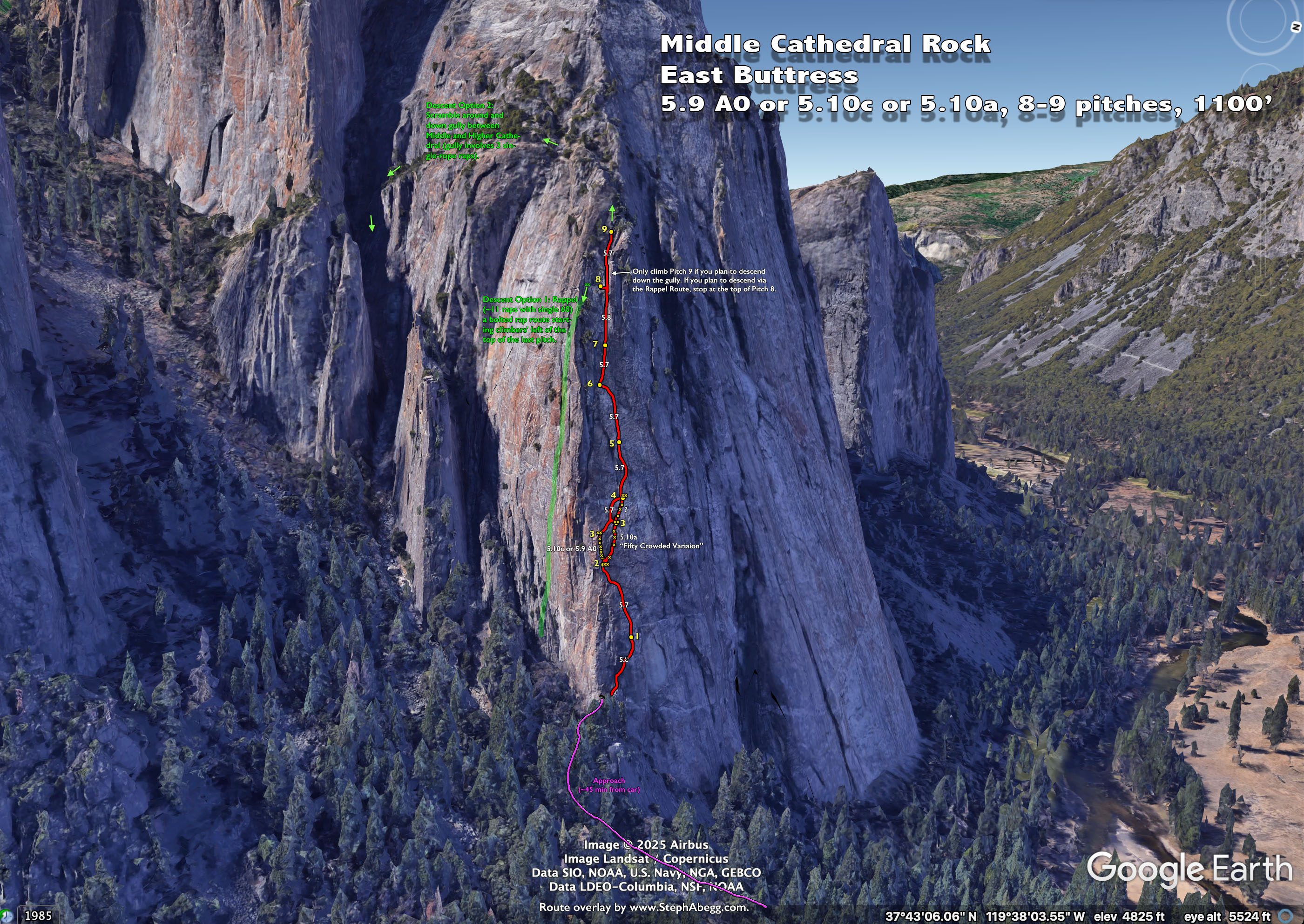 Note: The topo shows 9 pitches, which is how I broke it down when I climbed the route in 2025. My route description on this page has the route as 11 pitches. In the 11-pitch breakdown the first four pitches are the first two pitches of the 9-pitch breakdown..