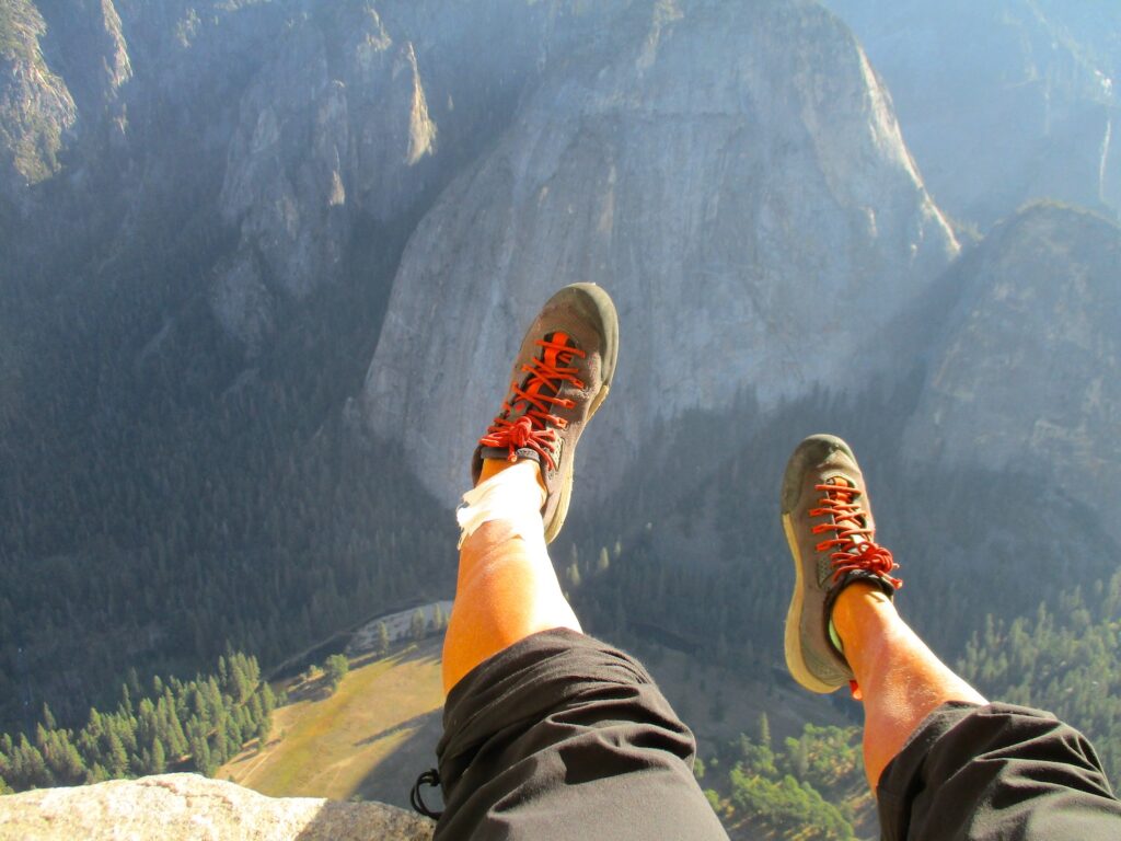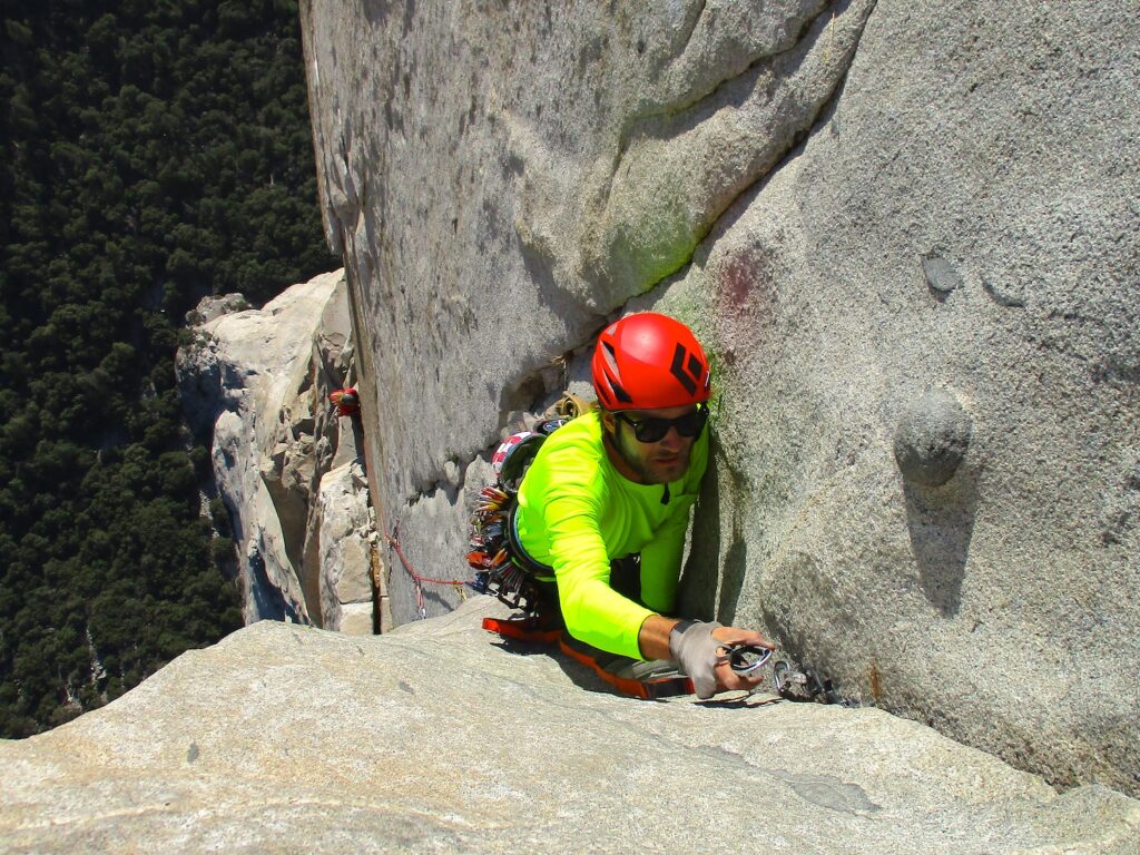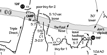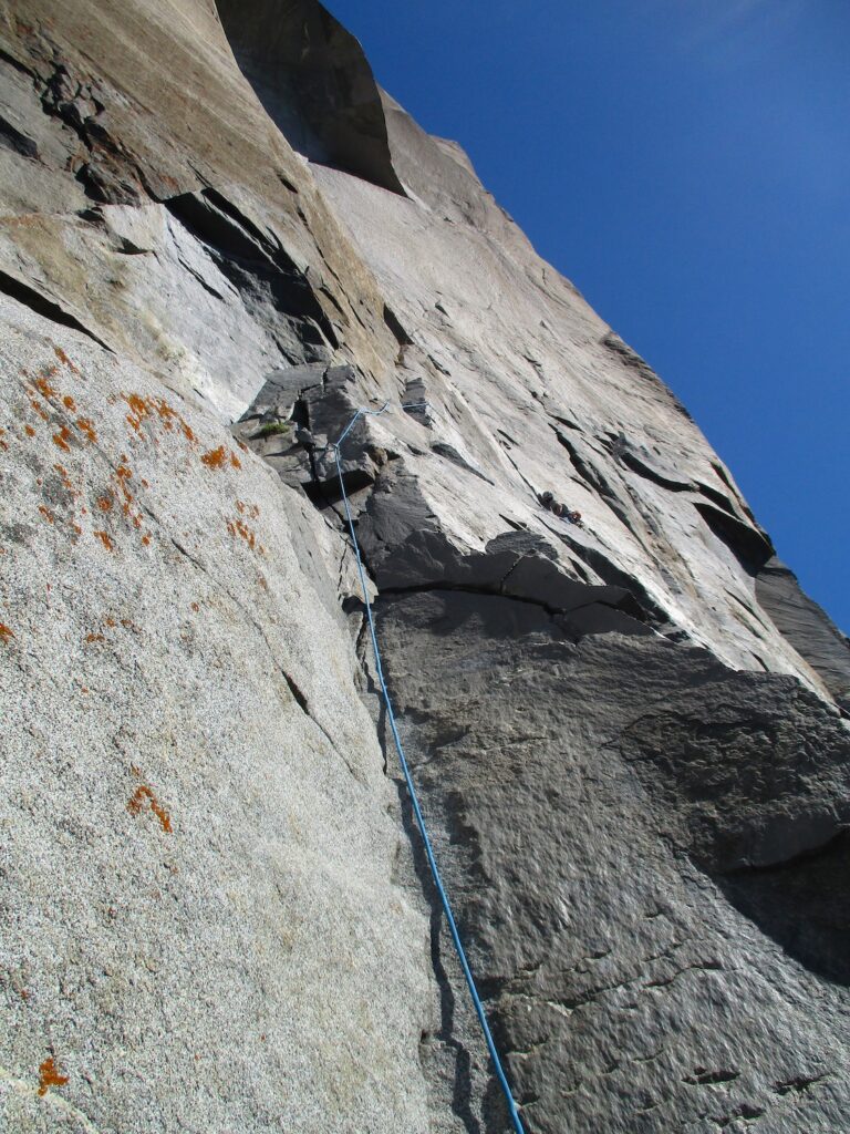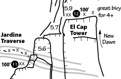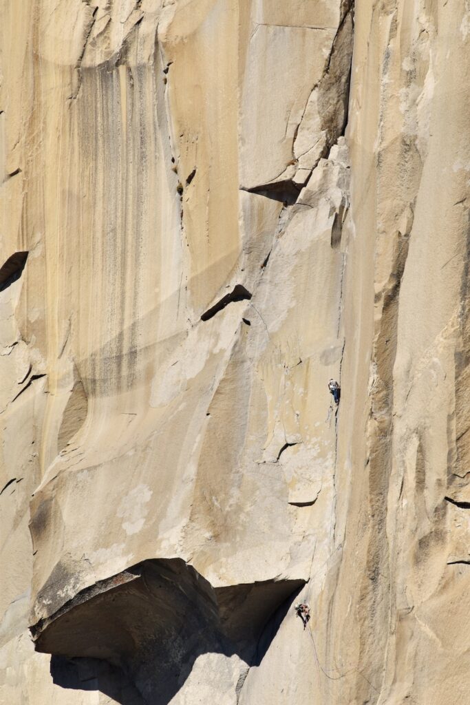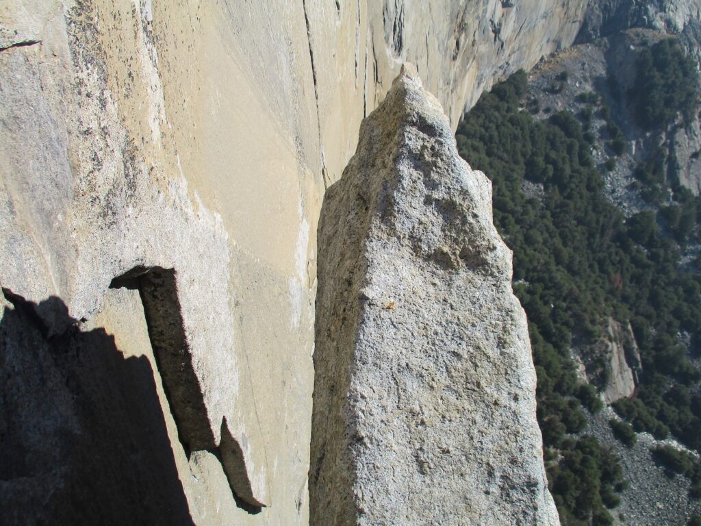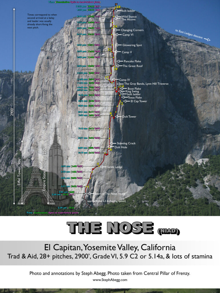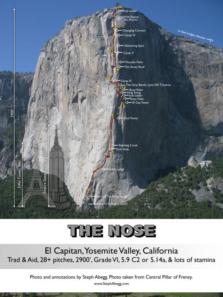 The Nose is a rock climb that ascends the nose of El Capitan in Yosemite. Some sources call The Nose the best rock climb in the world: 3000 feet of granite, featuring pitch after pitch of 5-star crack climbing, with memorable pitches such as Stoveleg Crack, Boot Flake, The King Swing, The Great Roof, Pancake Flake, and Changing Corners. On paper, The Nose is rated 5.9 C2, and much of the route can be climbed free at the 5.10 level, but it is physically and psychologically demanding, and failure rate is high (various sources say anywhere from 20-50% success rate). Planning and efficiency is key.