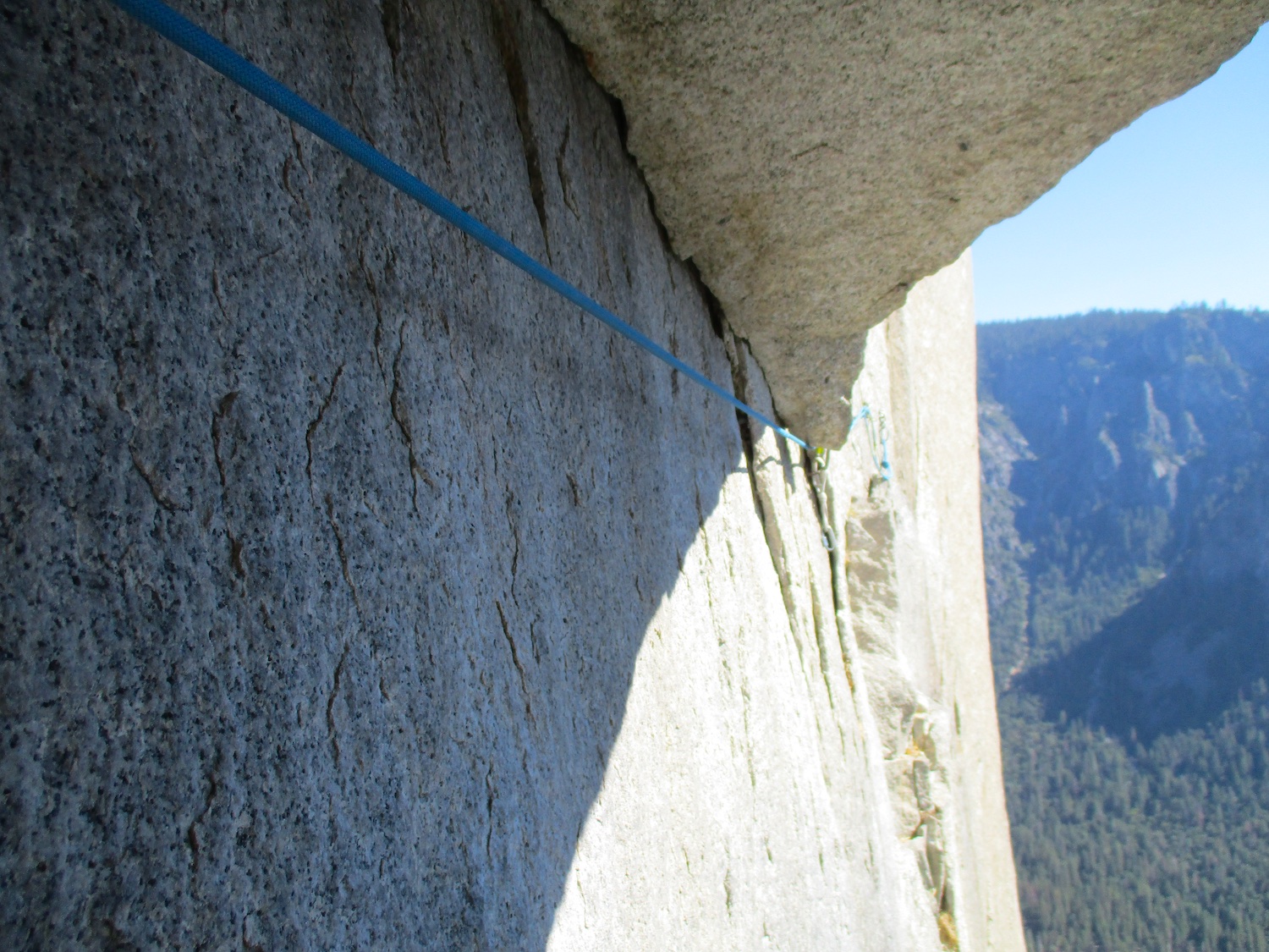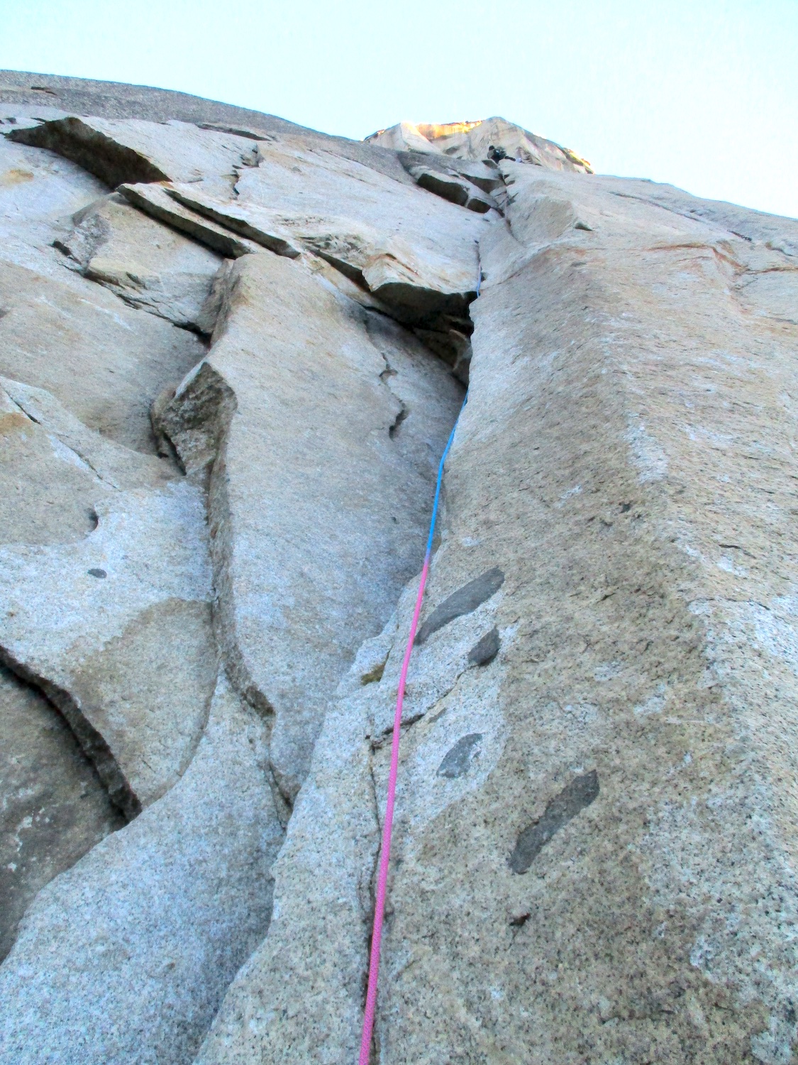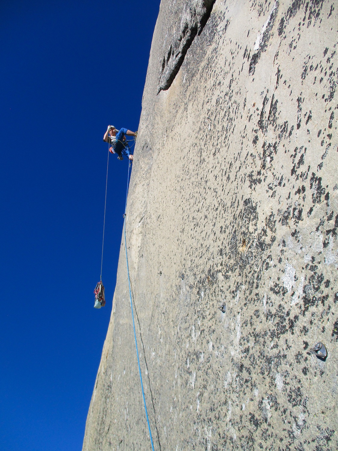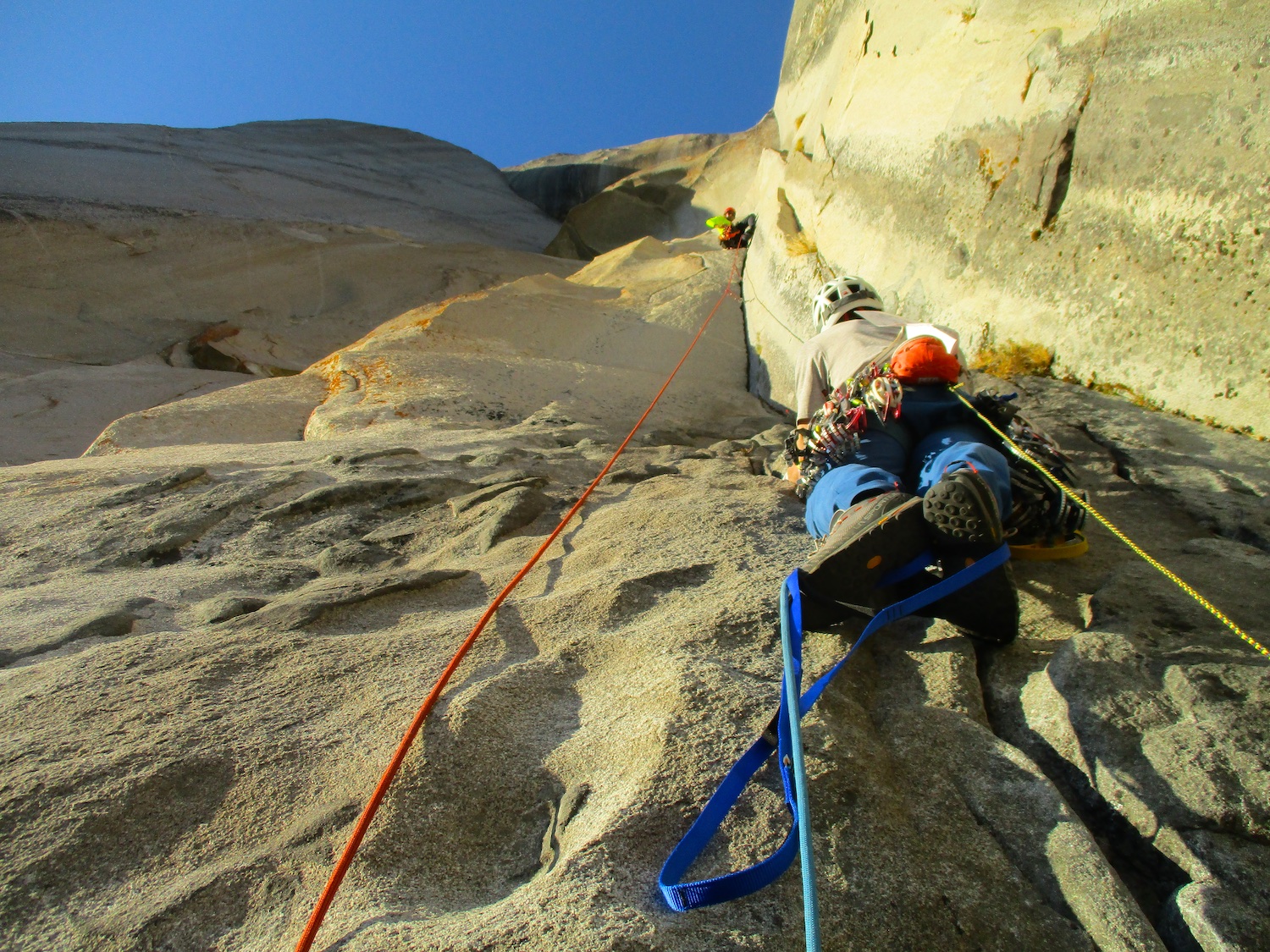 Nate and I climbed the route in just over 19 hours (I'm obviously not as fast as Eric Sloan...). To speed things up, Nate usually short-fixed and was already about 30-40 feet into the next pitch by the time I arrived at the anchor and put him on belay, and then passed him all of the gear I collected via his 45 foot tag line. It was a splitter October weekend, so there were several parties on the route—at least 3 NIAD parties and 5 hauling parties; we passed 6 parties and were passed by one party. Another factor to consider was the amount of daylight—sunrise at 7:06 am and sunset at 6:22 pm gave just over 11 hours of daylight. As follower, I carried the pack, which contained extra clothes, food, 1 gallon of water each (for a total of 16 lb of water starting off the route), and miscellaneous items like tape and batteries. I appreciated the athleticism of the day. Our bodies felt great, and the only real complaint on Sunday was we were a bit thirsty and our fingers hurt (my thumbnails had split back from all the jugging and Nate's pads were raw from touching 3000 feet of Yosemite granite). It was so nice to be back in the Valley again; I love this place. I took lots of photos.