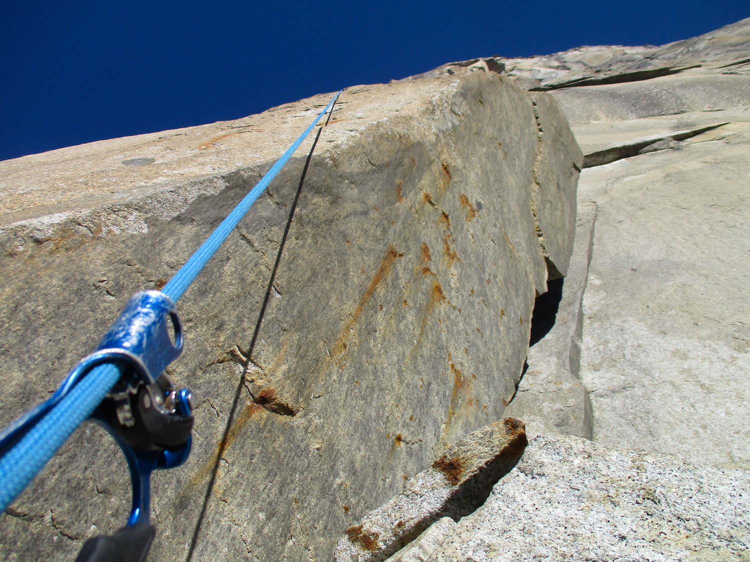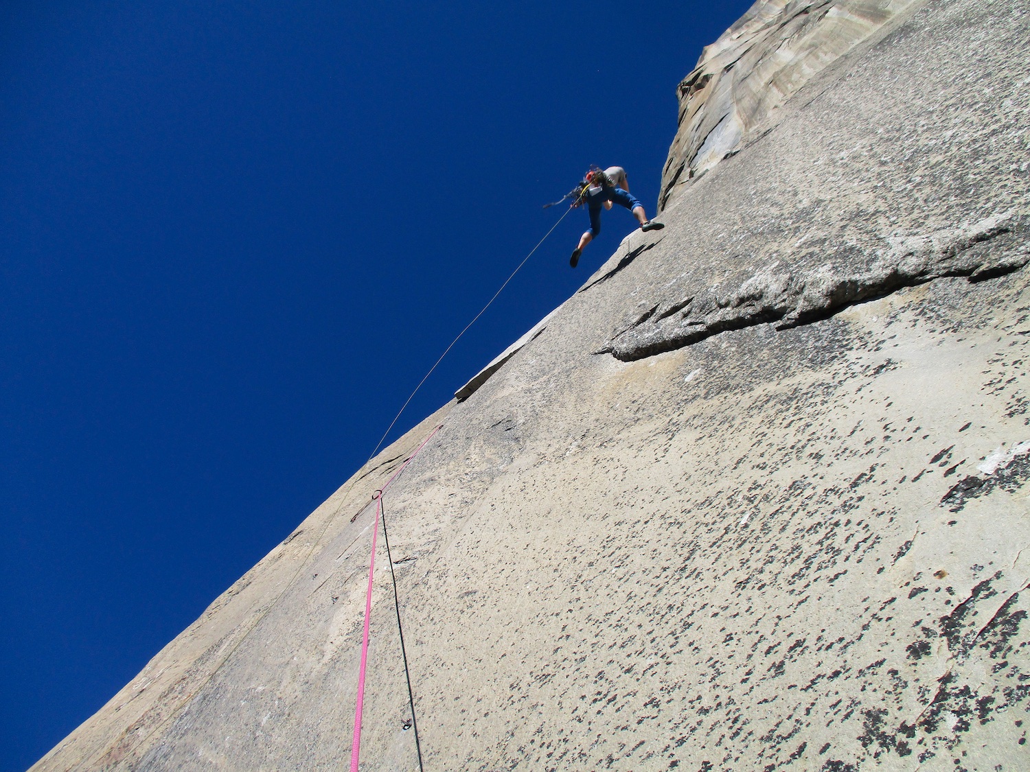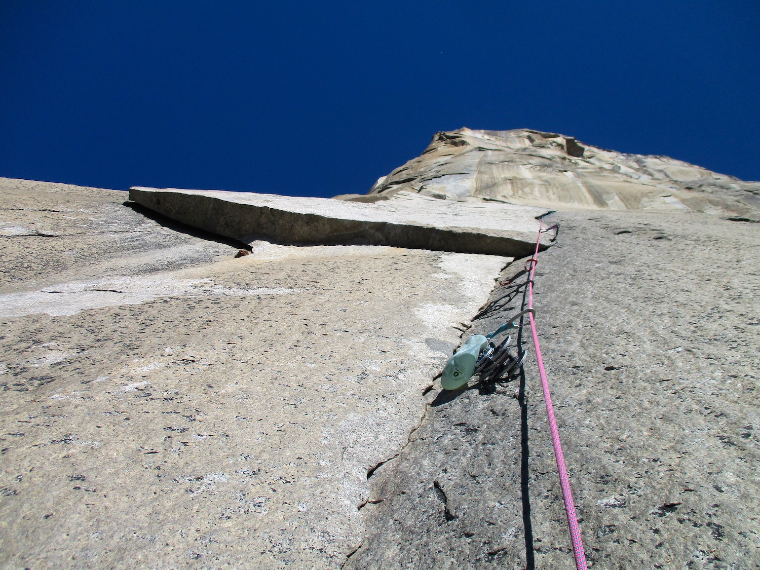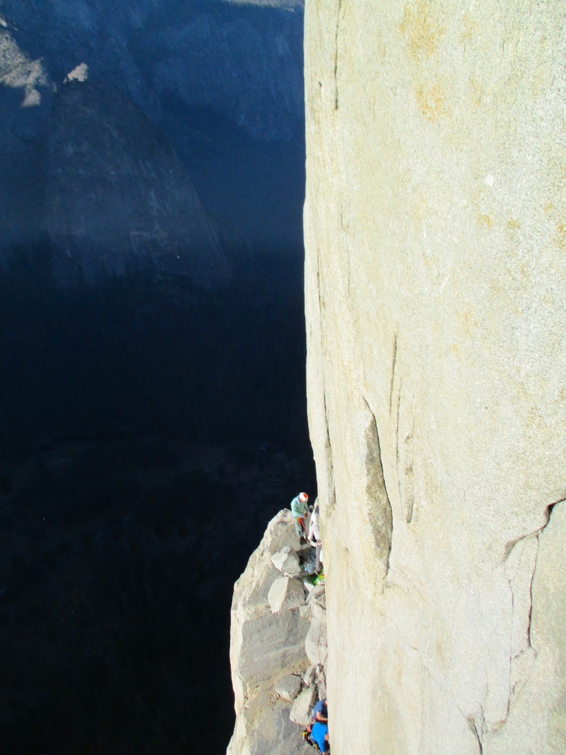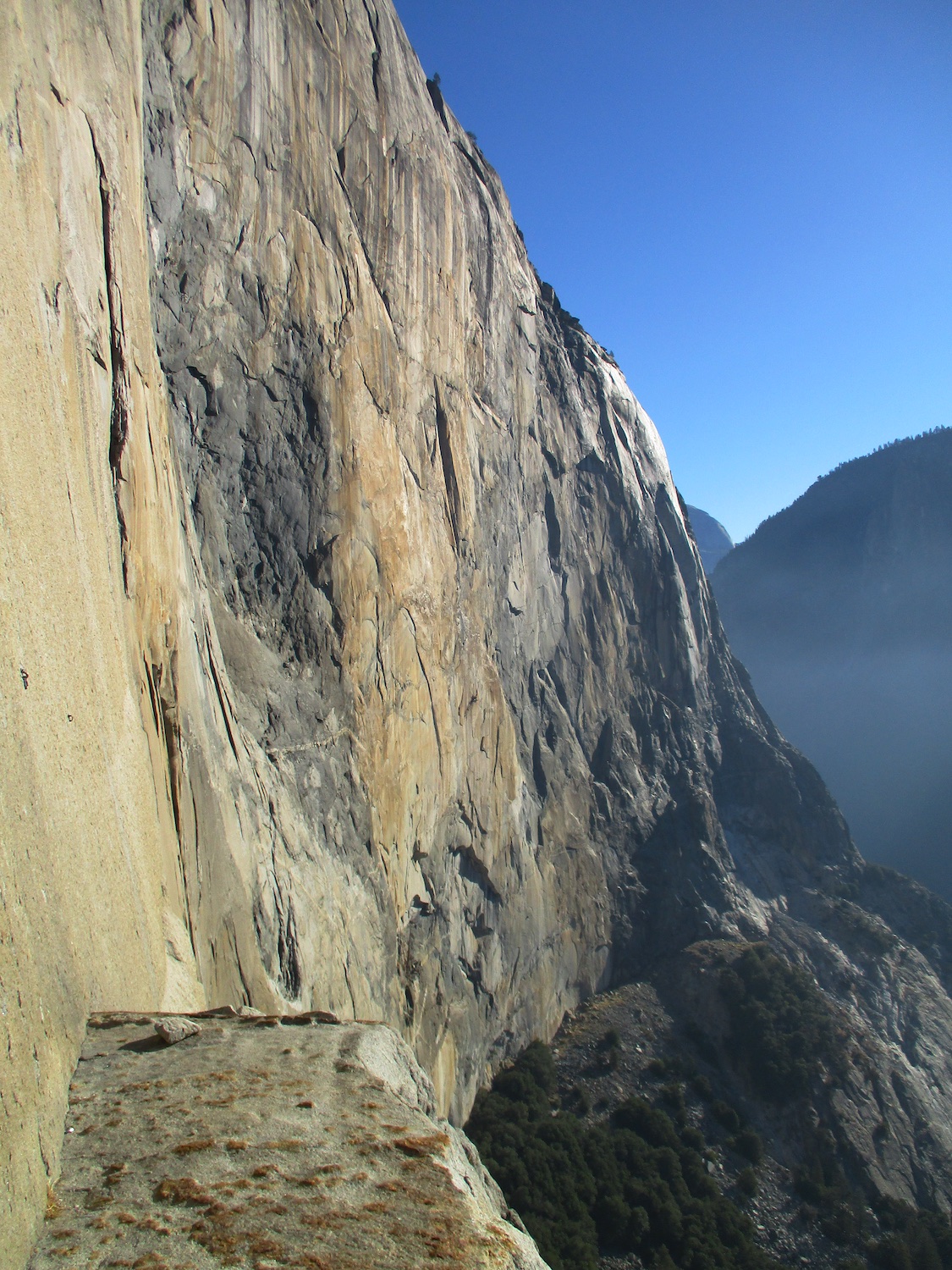 Nate and I climbed the route in just over 19 hours (I'm obviously not as fast as Eric Sloan...). To speed things up, Nate usually short-fixed and was already about 30-40 feet into the next pitch by the time I arrived at the anchor and put him on belay, and then passed him all of the gear I collected via his 45 foot tag line. It was a splitter October weekend, so there were several parties on the route—at least 3 NIAD parties and 5 hauling parties; we passed 6 parties and were passed by one party. Another factor to consider was the amount of daylight—sunrise at 7:06 am and sunset at 6:22 pm gave just over 11 hours of daylight. As follower, I carried the pack, which contained extra clothes, food, 1 gallon of water each (for a total of 16 lb of water starting off the route), and miscellaneous items like tape and batteries. I appreciated the athleticism of the day. Our bodies felt great, and the only real complaint on Sunday was we were a bit thirsty and our fingers hurt (my thumbnails had split back from all the jugging and Nate's pads were raw from touching 3000 feet of Yosemite granite). It was so nice to be back in the Valley again; I love this place. I took lots of photos.